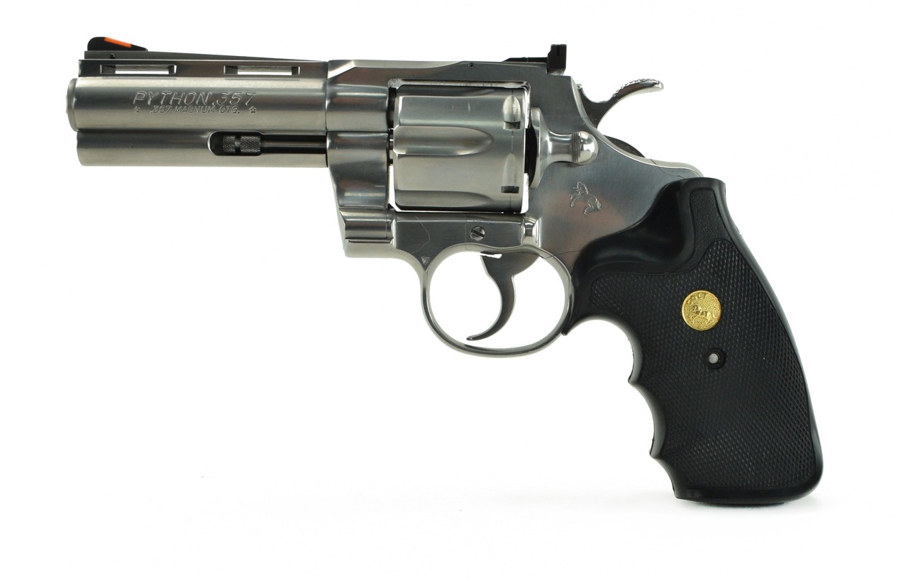 Colt Python .357 Magnum caliber revolver. 4” Stainless model, 1990’s vintage. Has Colt rubber grips. Near excellent condition with very light wear.