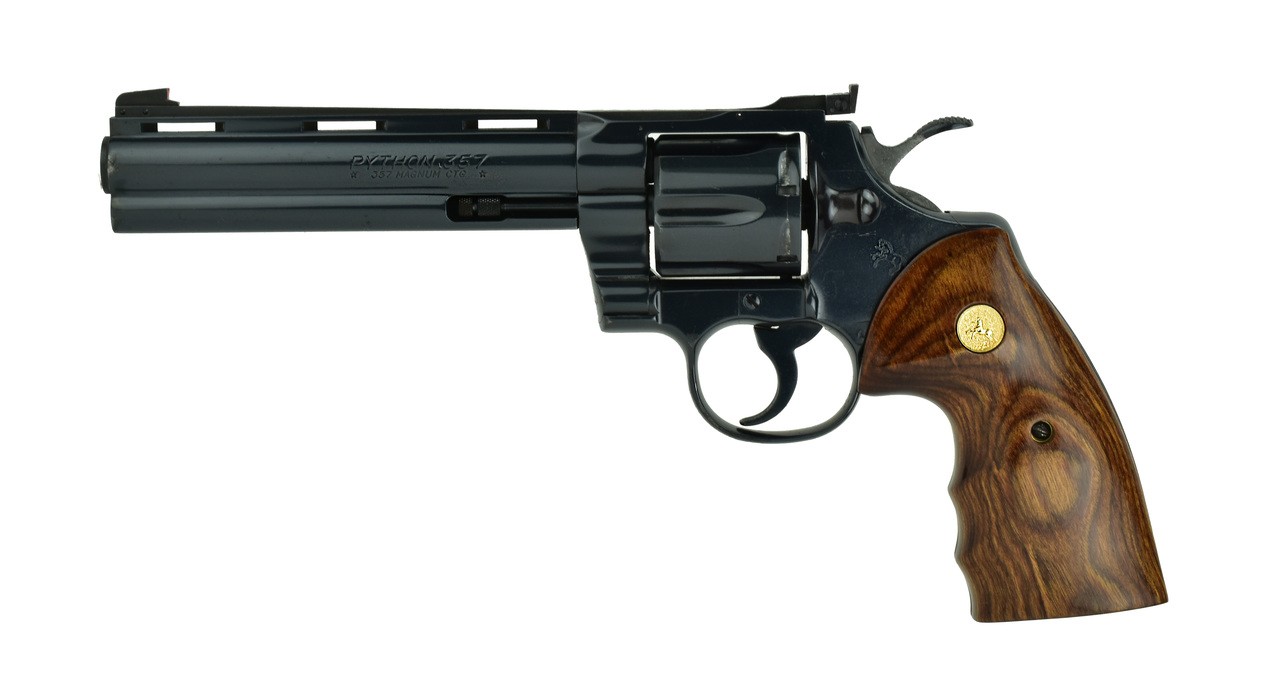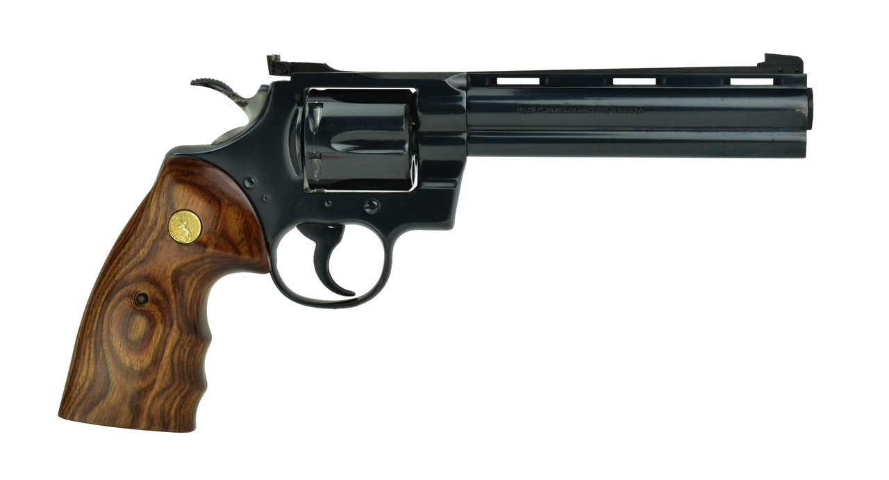 Colt Python .357 Magnum caliber revolver. 6” Blue model with upgrade Elliason target sights. Shows light wear, overall near excellent condition. Made in 1980.