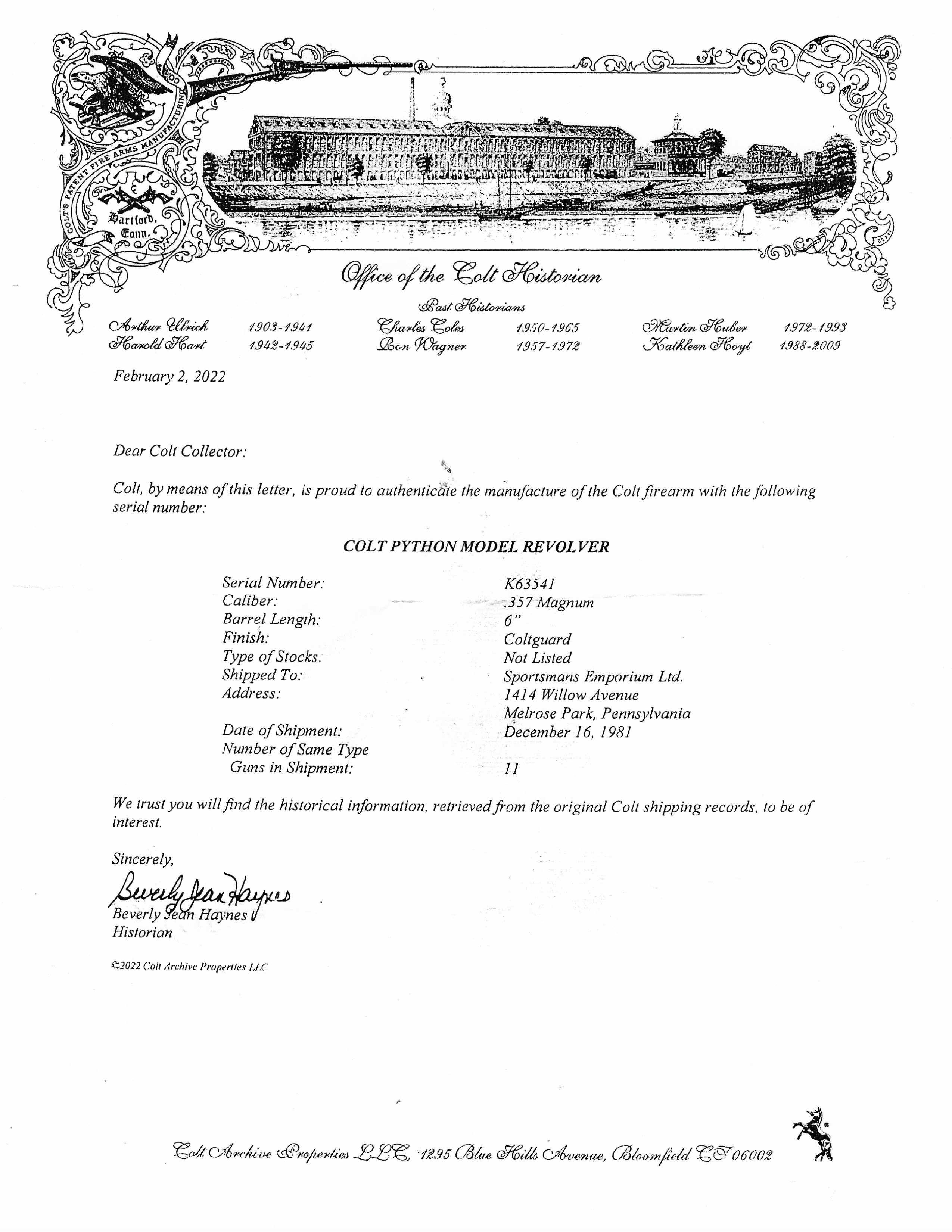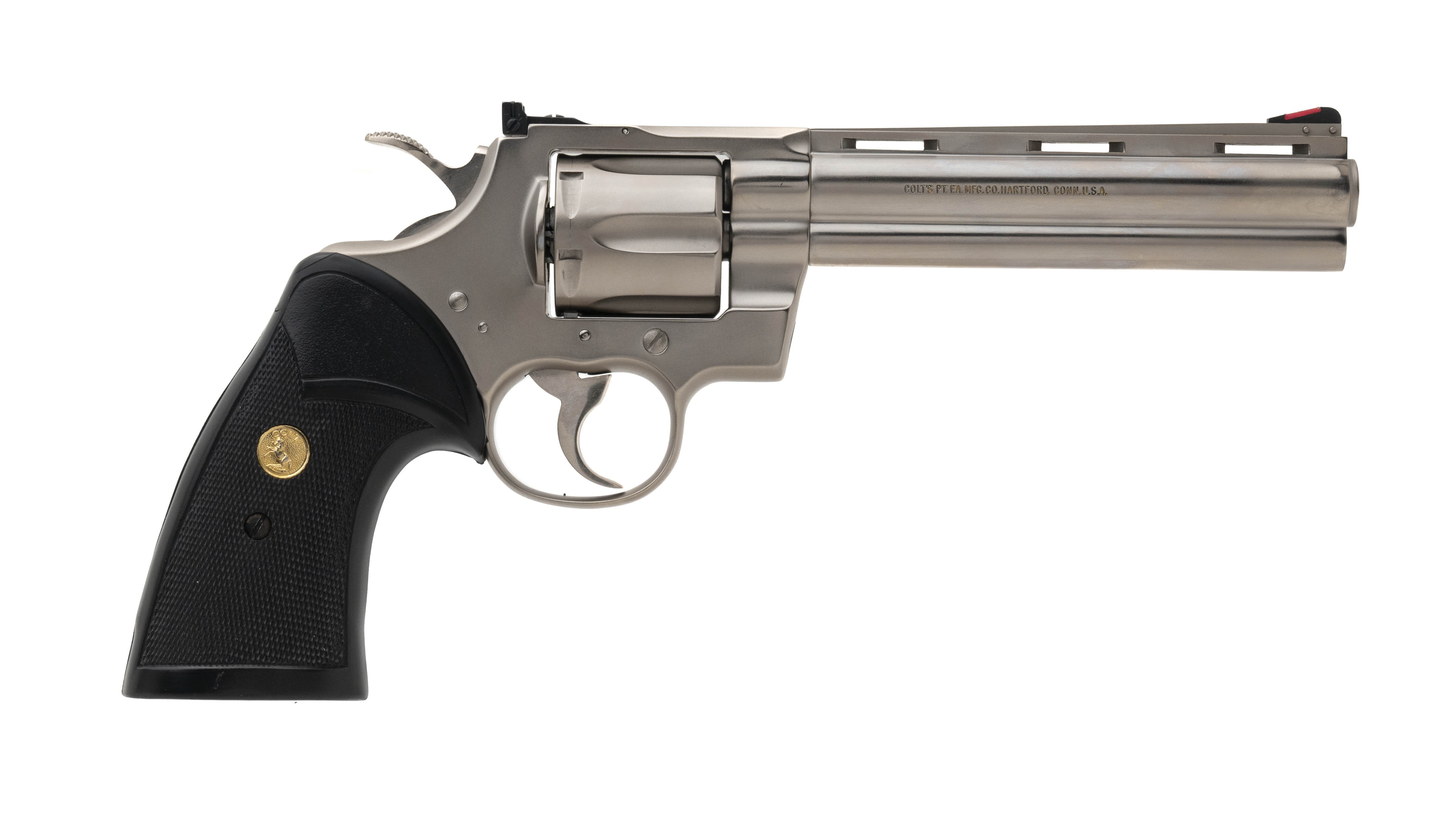 6" model with scarce "Coltguard" satin nickel finish and proper Colt rubber grips. Made in 1981. Excellent condition, with factory letter confirming the details.
