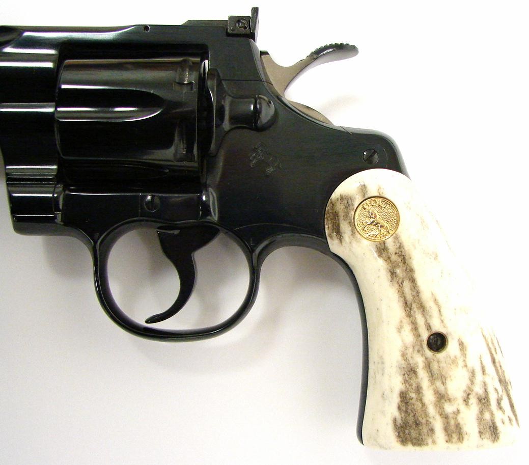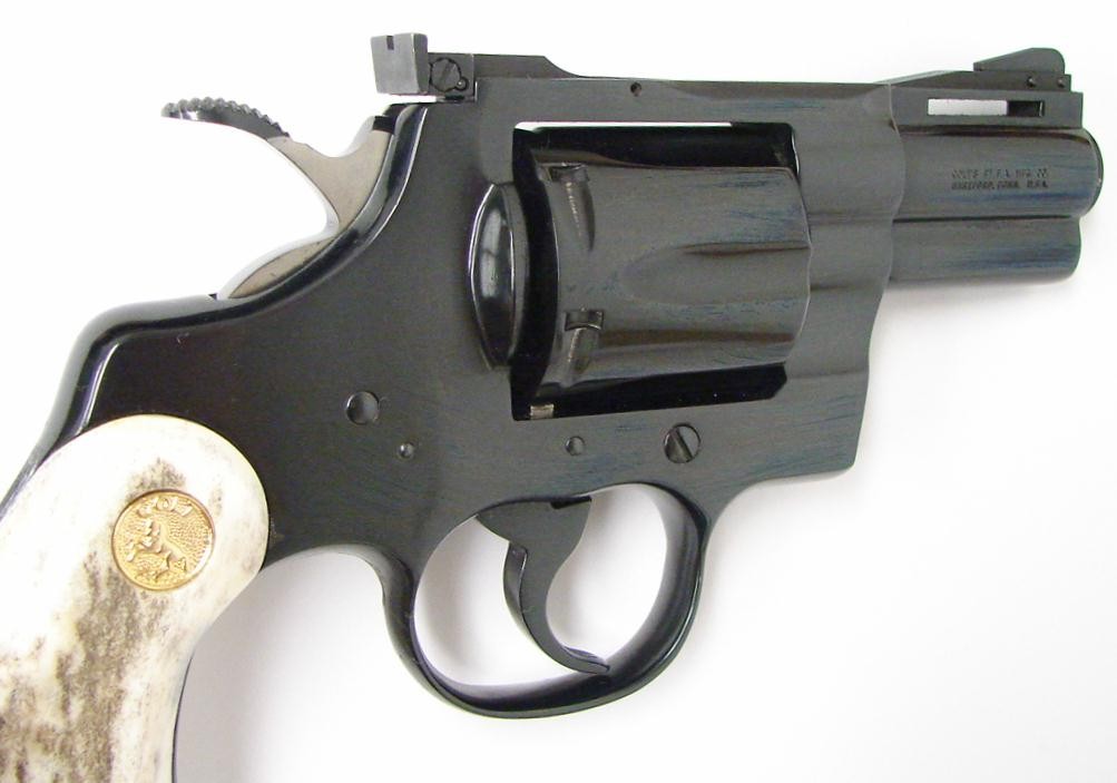Colt Python .357 Magnum caliber revolver. Fantastic 2 1/2” model with custom upgrades. Has royal blue finish, Elliason sight, tuned super slick action, and genuine stag grips. Excellent condition overall. Comes with a box that was probably added later. A rare and desirable Python snubnose.