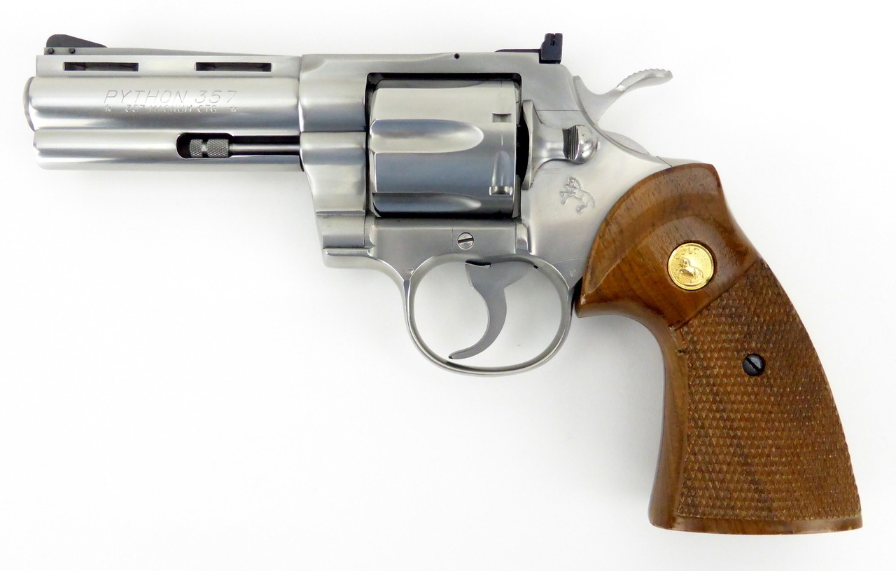 Colt Python .357 Magnum caliber revolver. Scarce and desirable 4” stainless steel model in excellent condition.