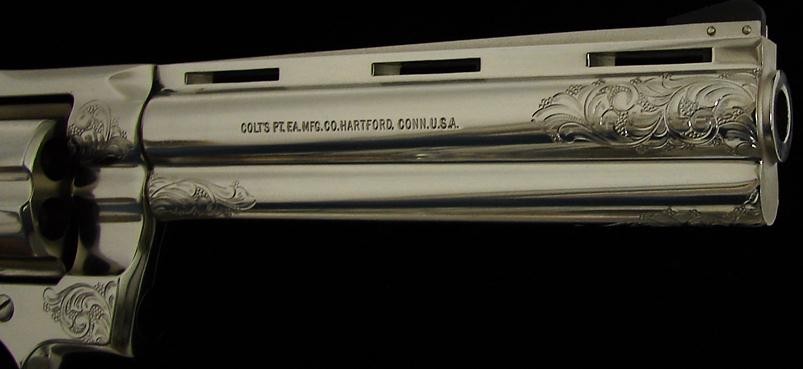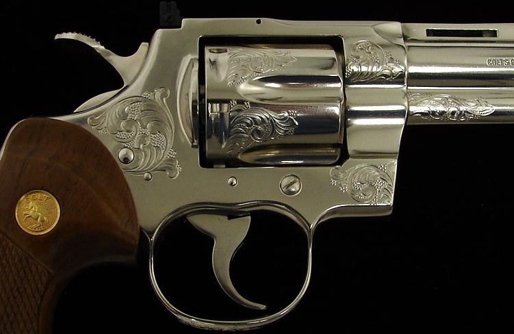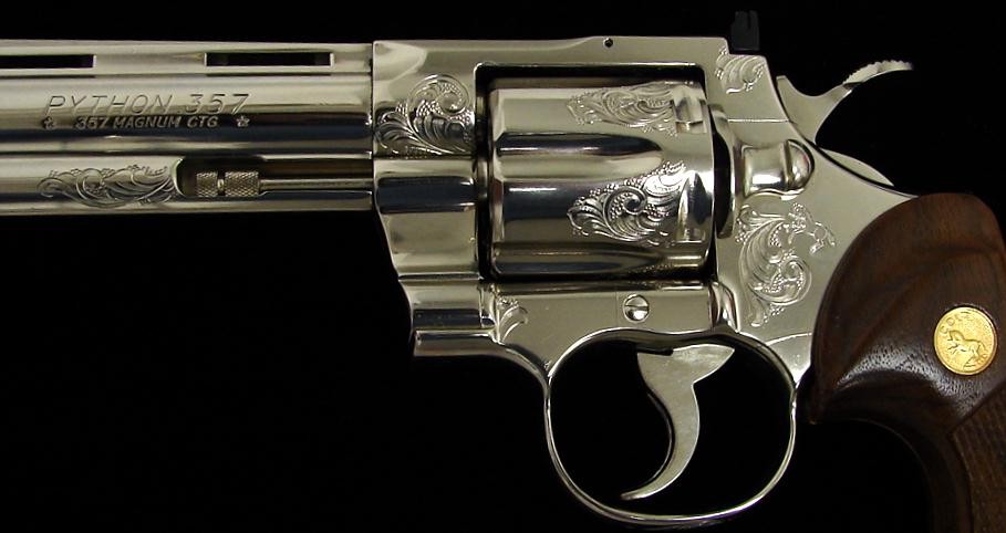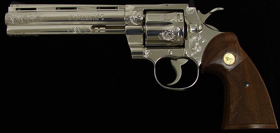 Colt Python .357 Magnum caliber revolver. Rare factory engraved and nickel plated 6 model in mint condition.