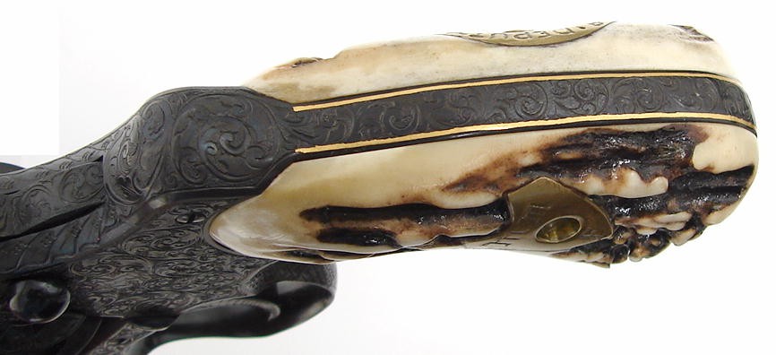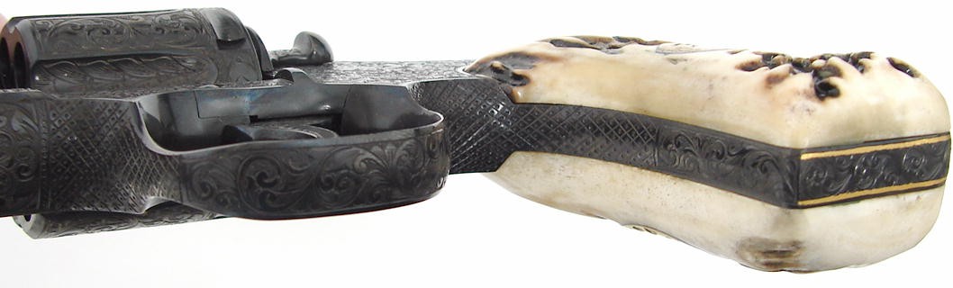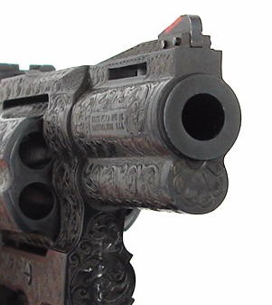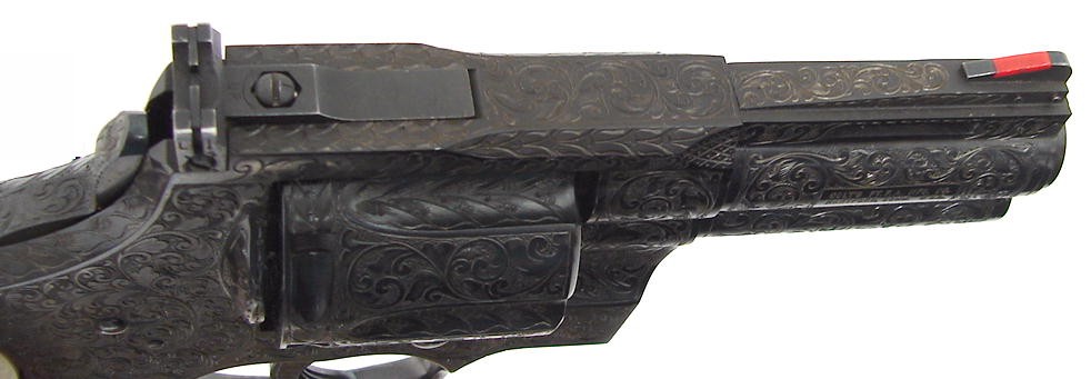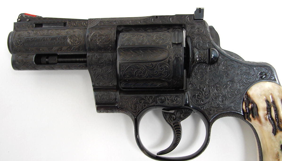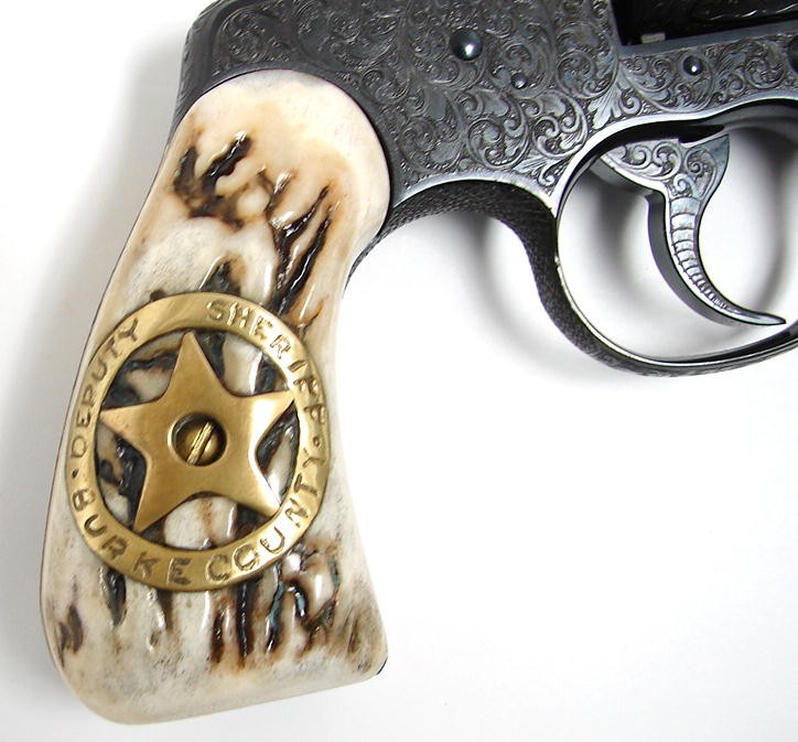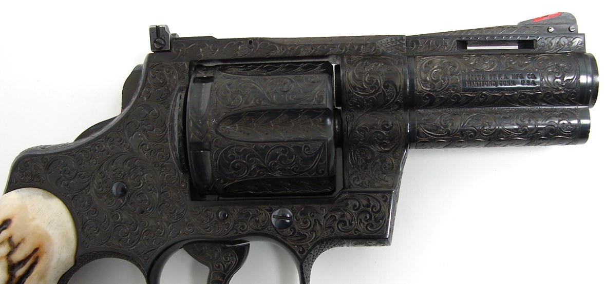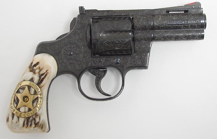 Colt Python .357 Magnum caliber revolver. Superb custom combat revolver with 3 barrel, bobbed hammer and custom rounded grip frame. Has extra fine full coverage scroll and genuine stag grips inlaid with a sheriffs badge.