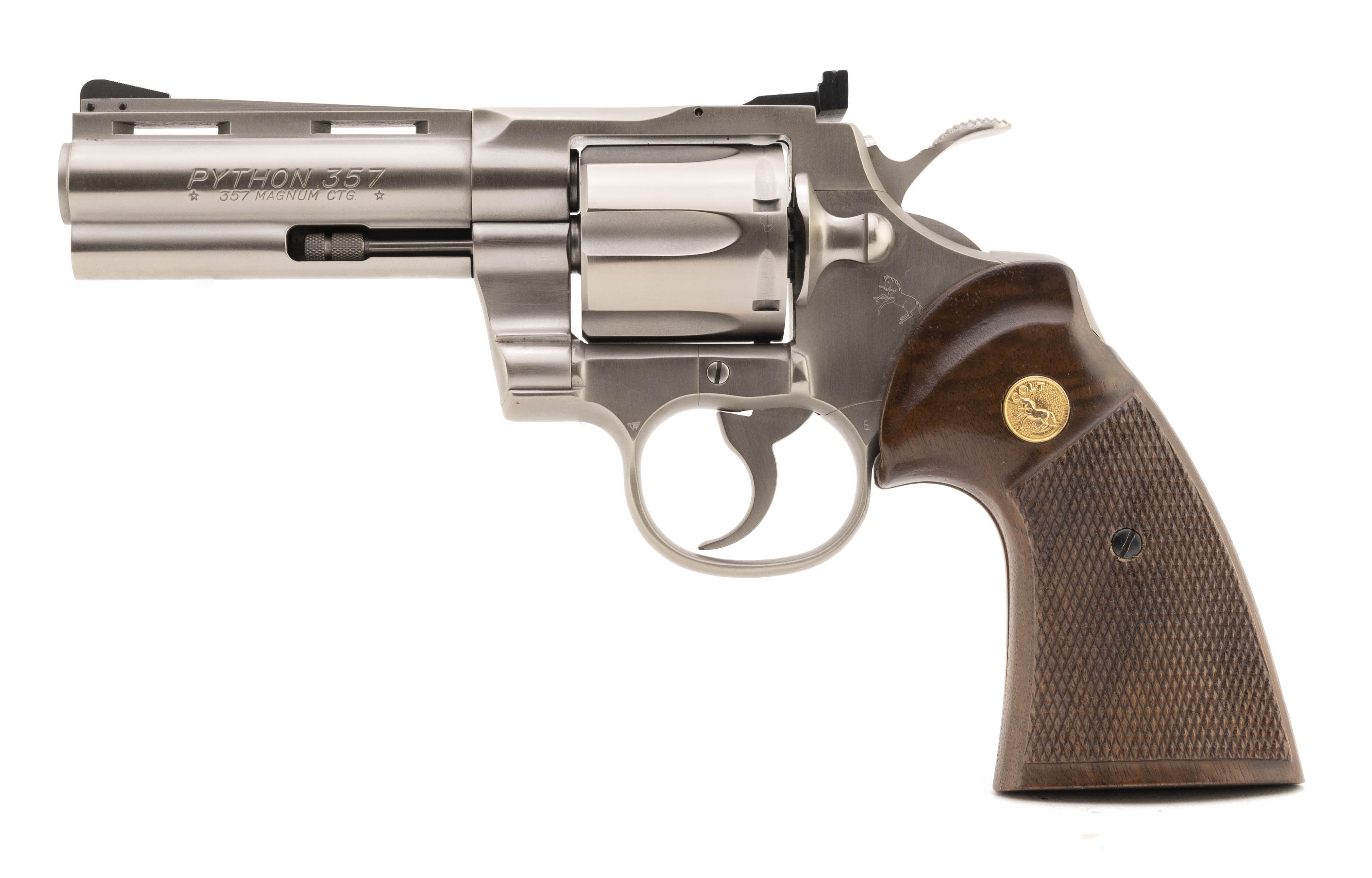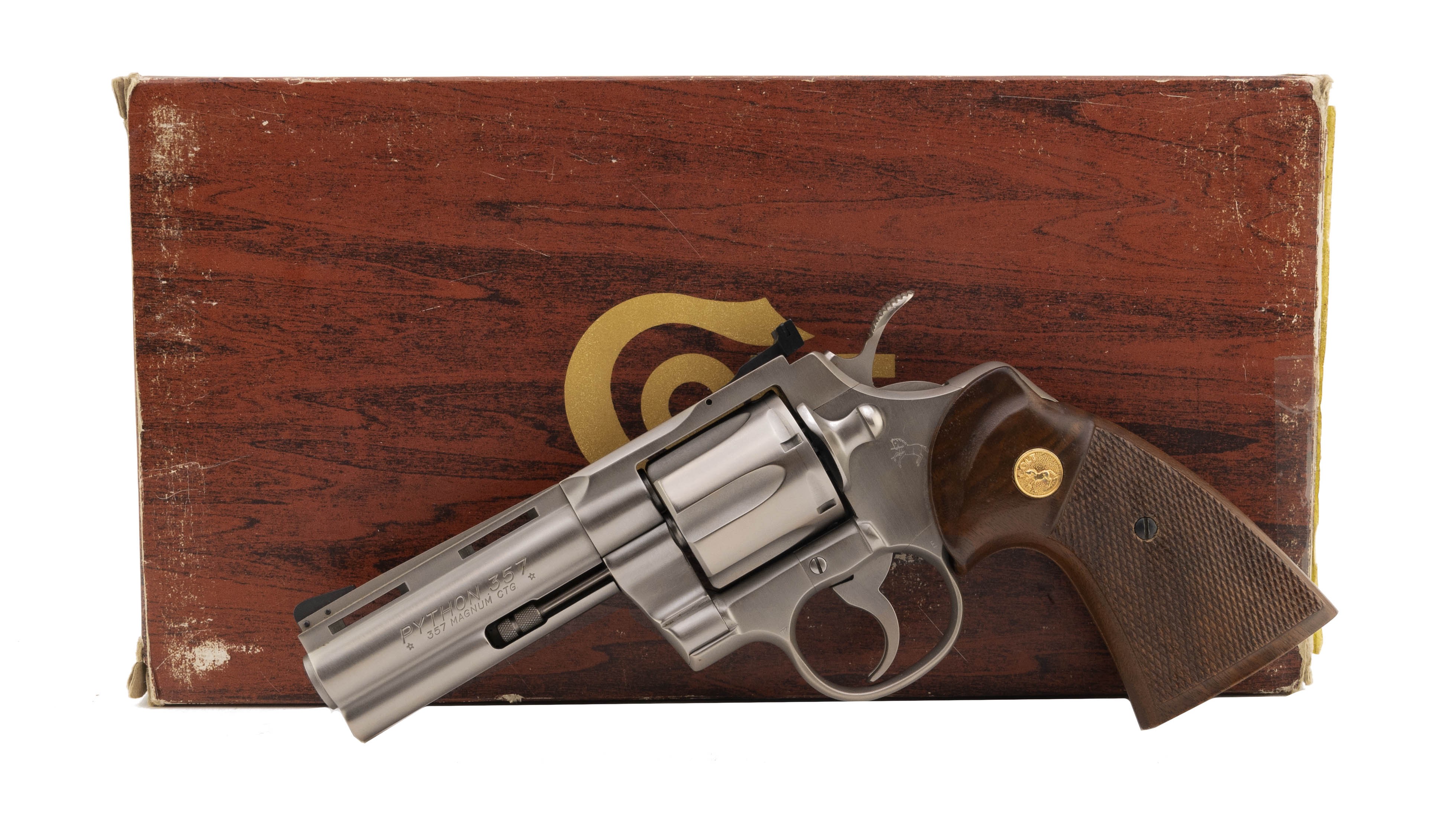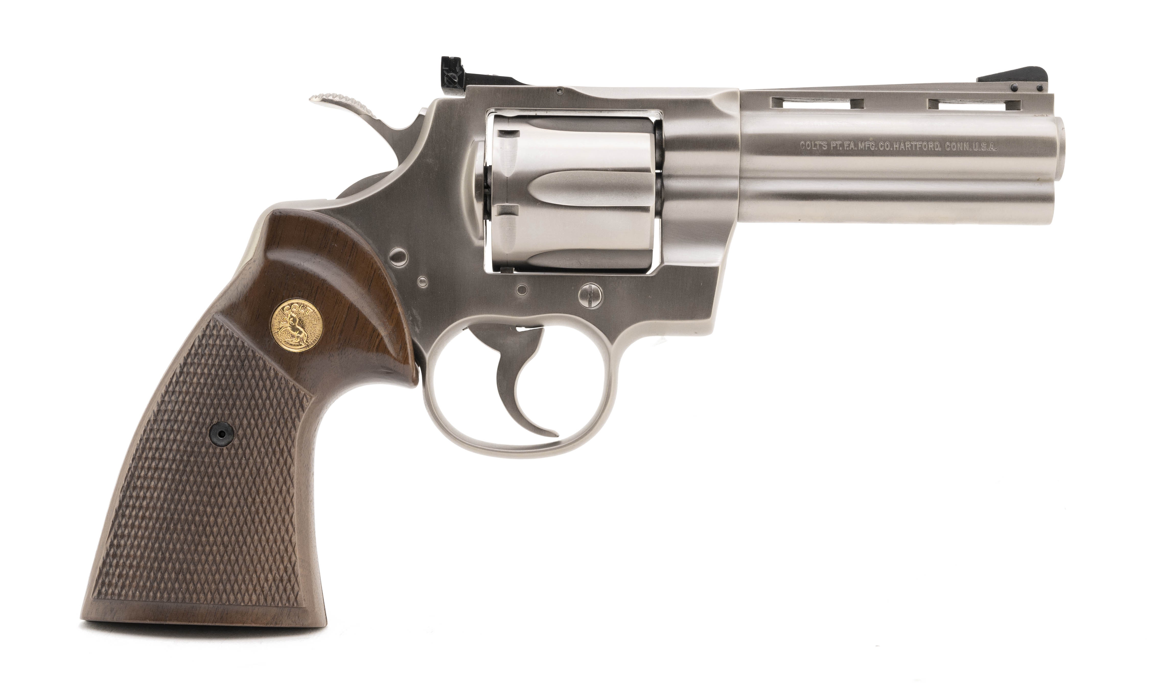 Scarce Colt Custom Shop model with electroless nickel finish and 4" barrel. Made in 1979, prior to the introduction of the stainless steel model. Has the Custom Shop label on the box. Excellent condition overall.