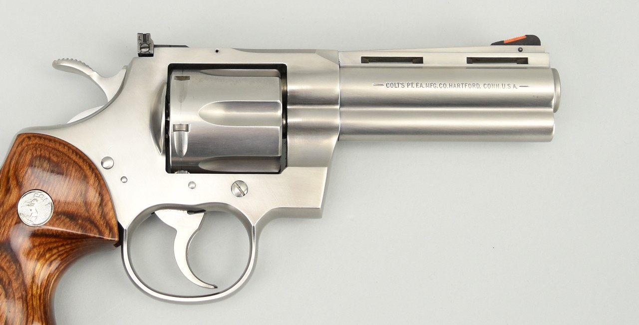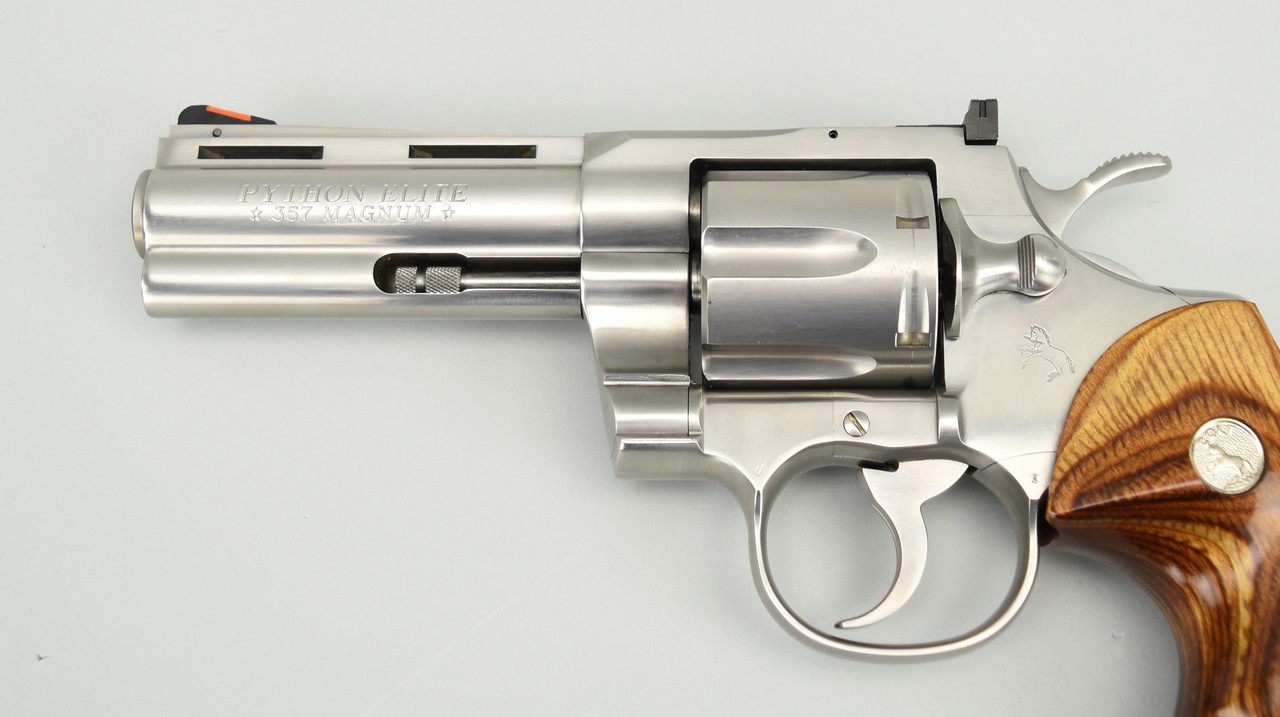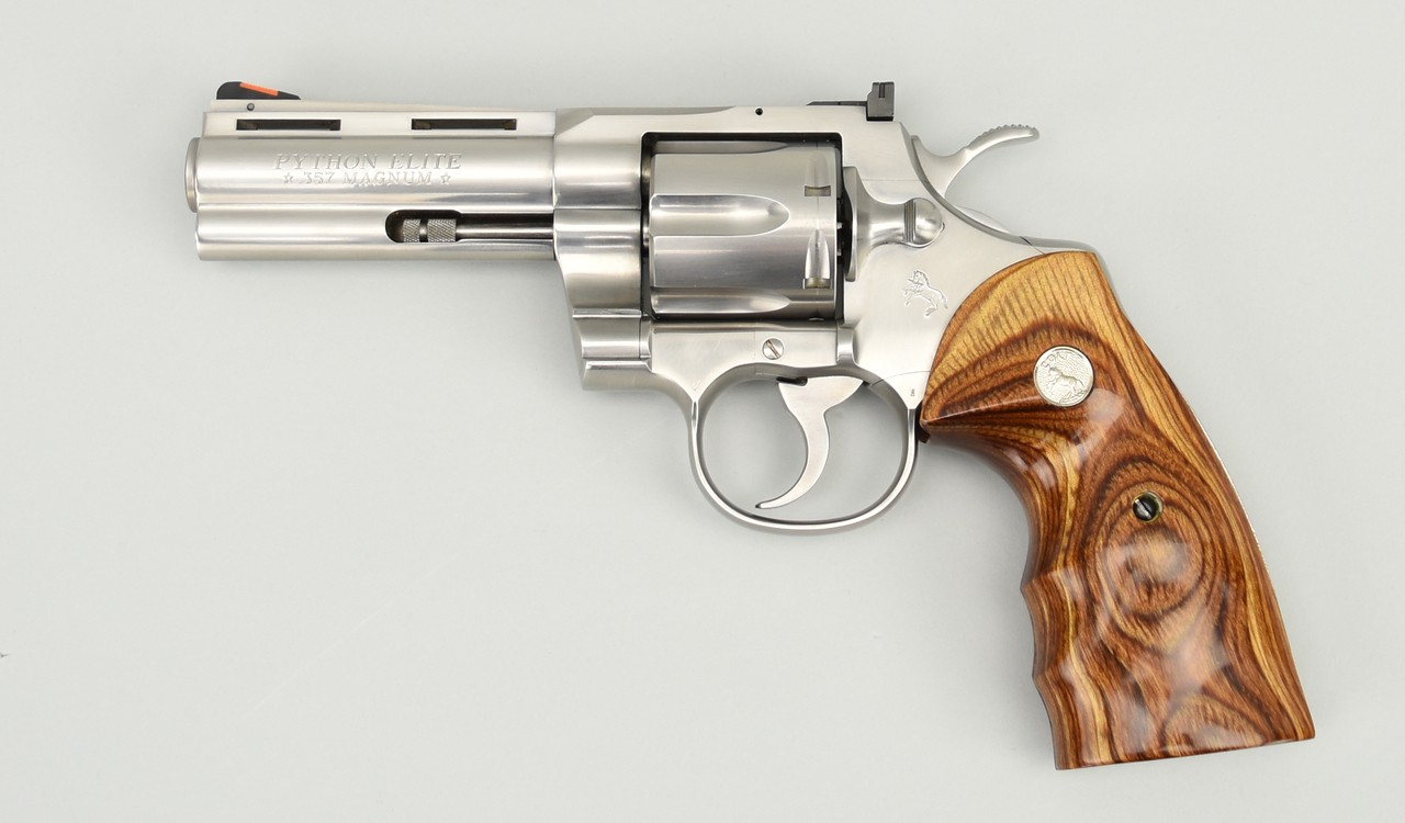 Colt Python Elite .357 Magnum caliber revolver. Rare stainless steel 4” Python Elite. Excellent condition with box. This is one of the rarest Pythons, very desirable!