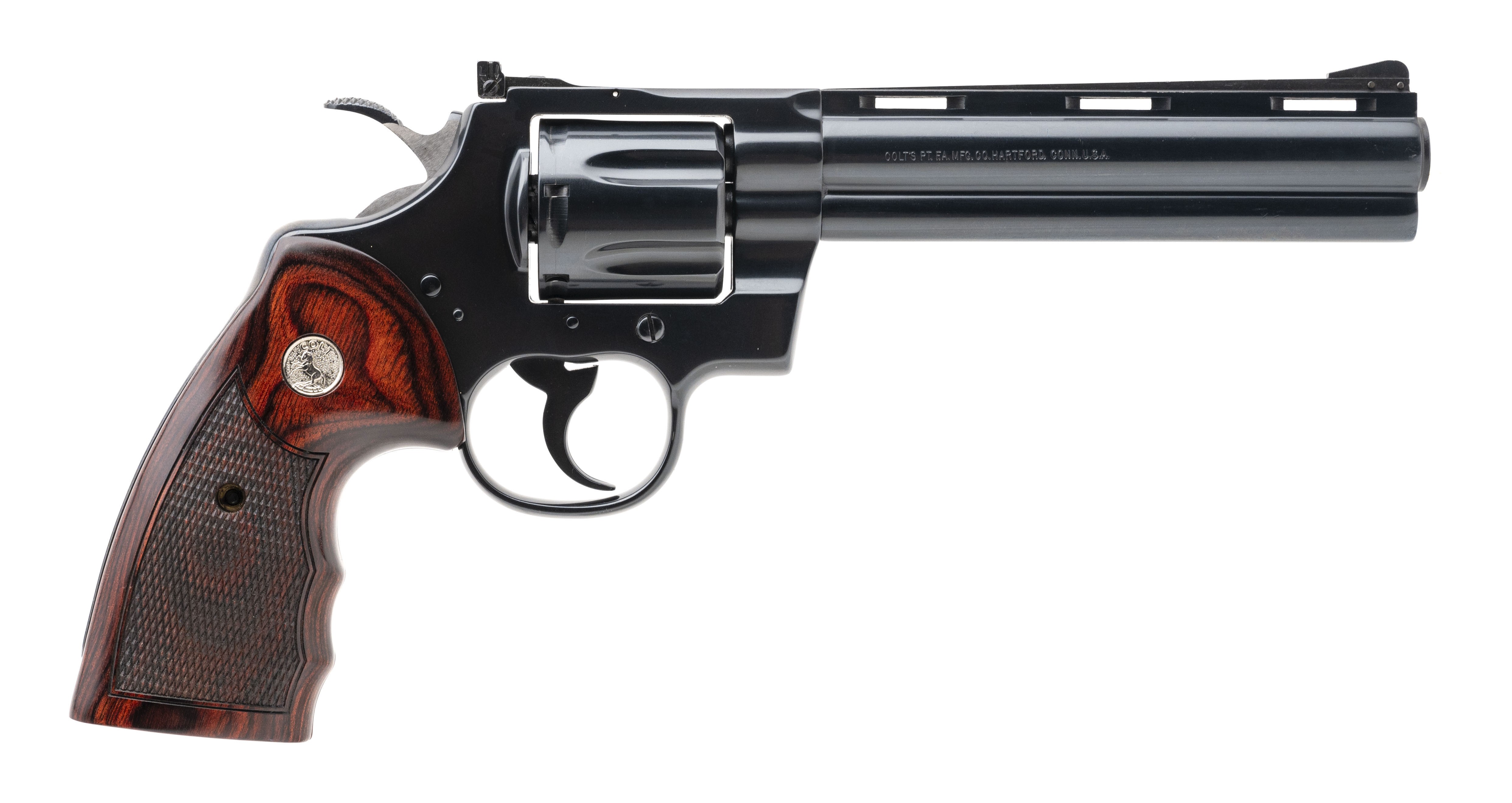 SN: K13827. Made in 1980. .357 Magnum with a 6" barrel. Bore is bright with strong rifling. Blued Colt snake gun. Blue finish is in near excellent condition with minor wear noted on the left side of the barrel. Wood grips are in excellent condition. Action functions properly. Overall near excellent condition.