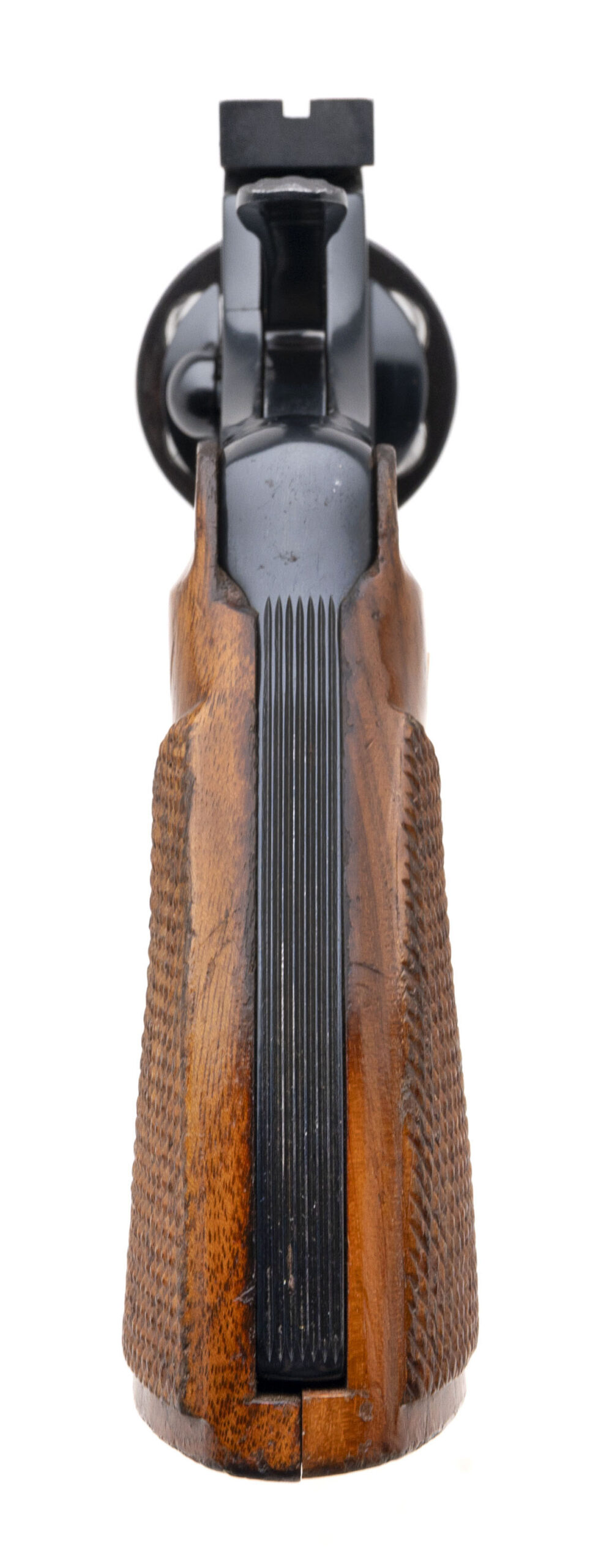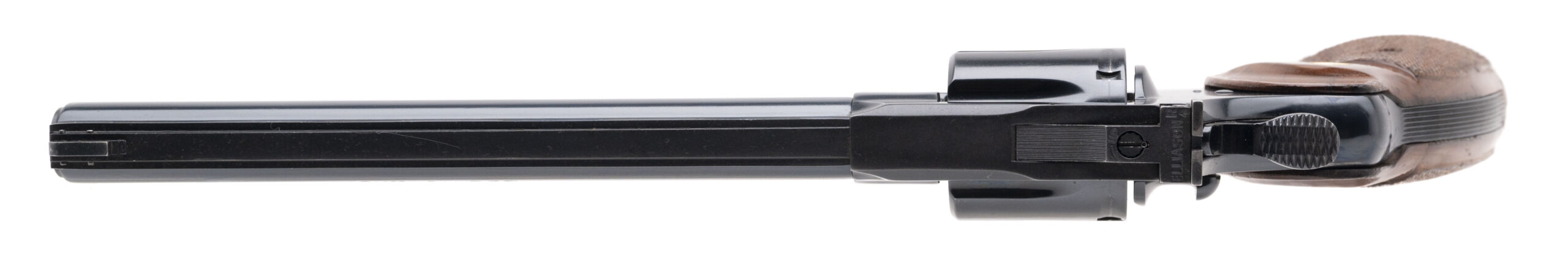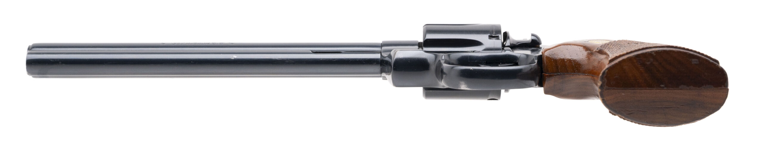 SN: VA4172. Made in 1980, .357 Magnum with an 8" barrel. Blued snake gun with checkered walnut grips and Elliason rear target sight. Gun has been professionally restored. Overall condition is very good.
