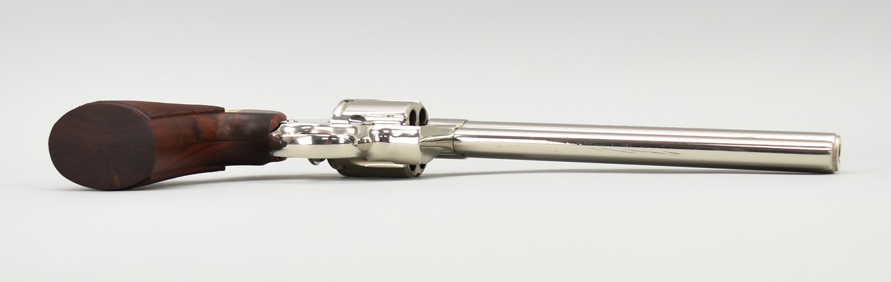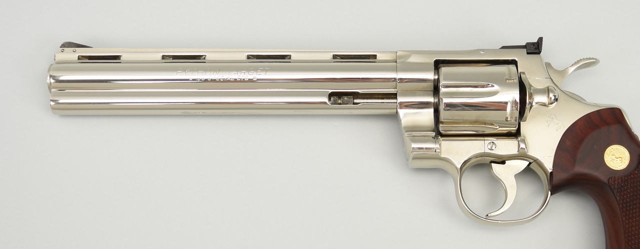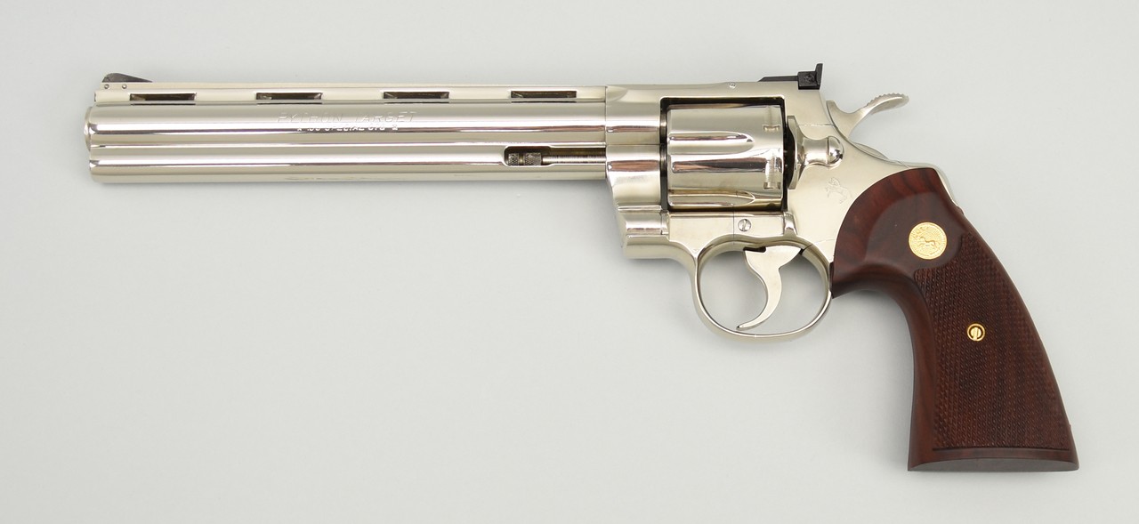 Colt Python Target .38 Special caliber revolver. Nickel Python converted to a .38 Python Target. The gun was originally a nickel .357 made in 1974 and has been re-barreled with a nickel Python Target barrel. The cylinder is still .357 Magnum. A neat gun in excellent condition.