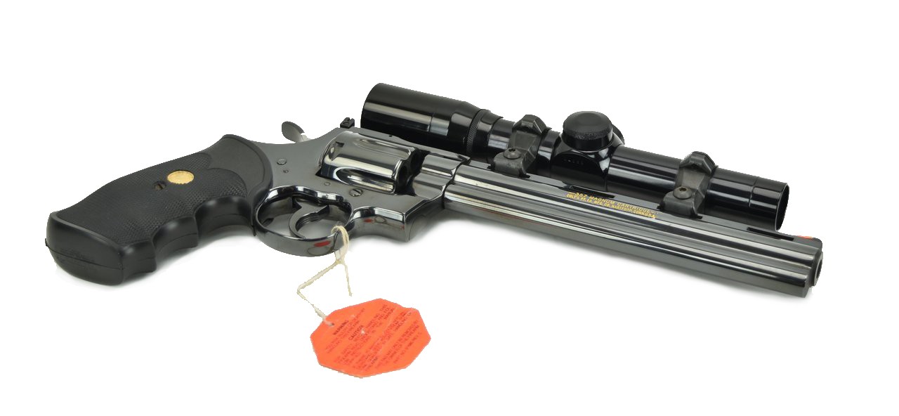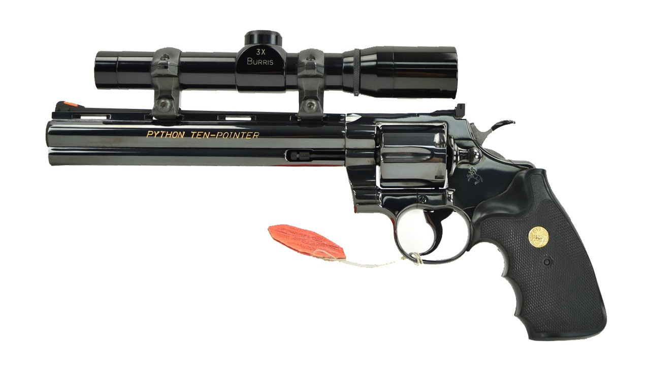 Colt Python Ten Pointer .357 Magnum caliber revolver. Rare Python “Ten Pointer” “8” blue gun with 3X Burris scope, royal blue finish and original rubber grips. Only 250 made, a very desirable variant, excellent condition with case and papers.