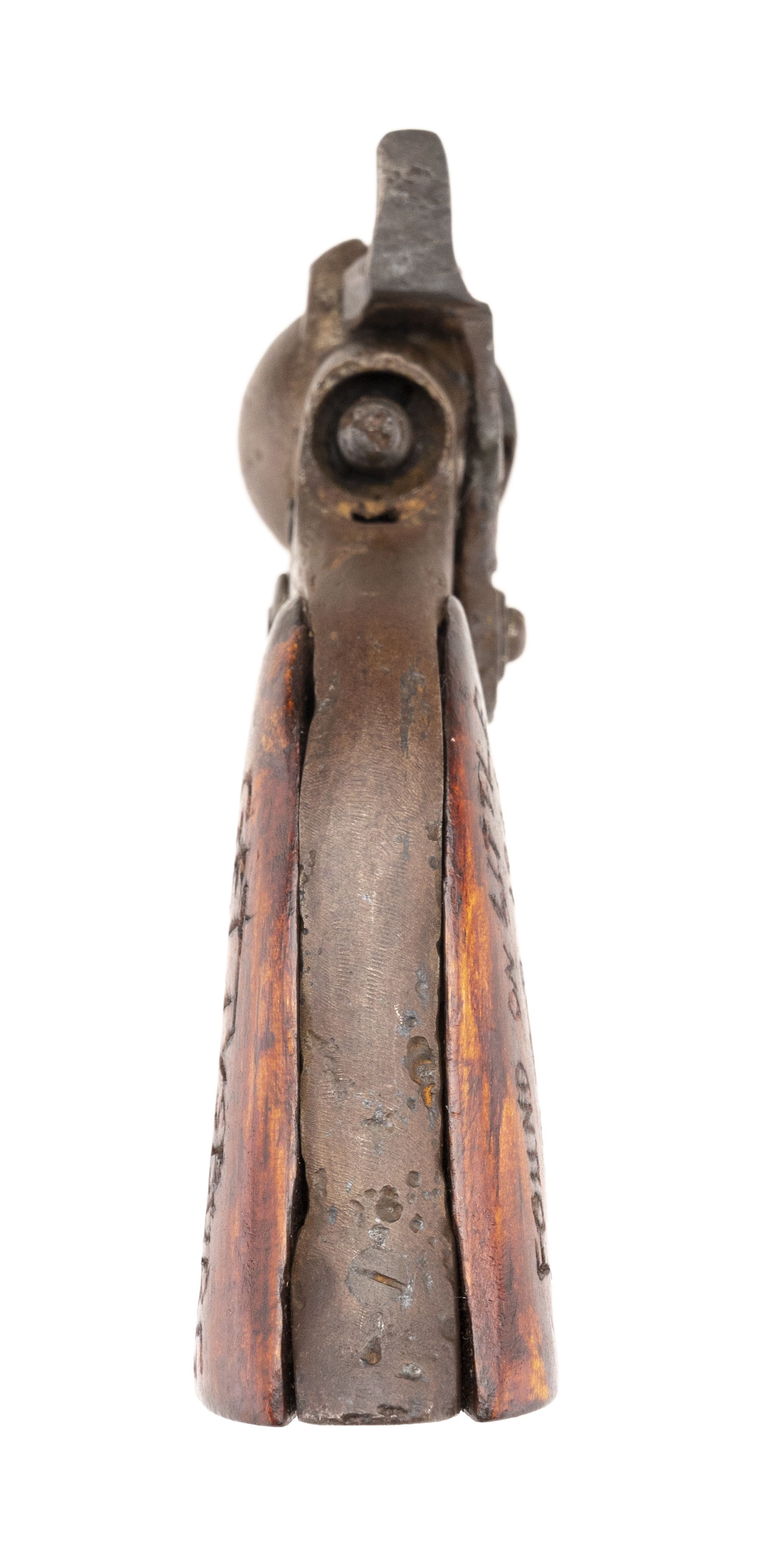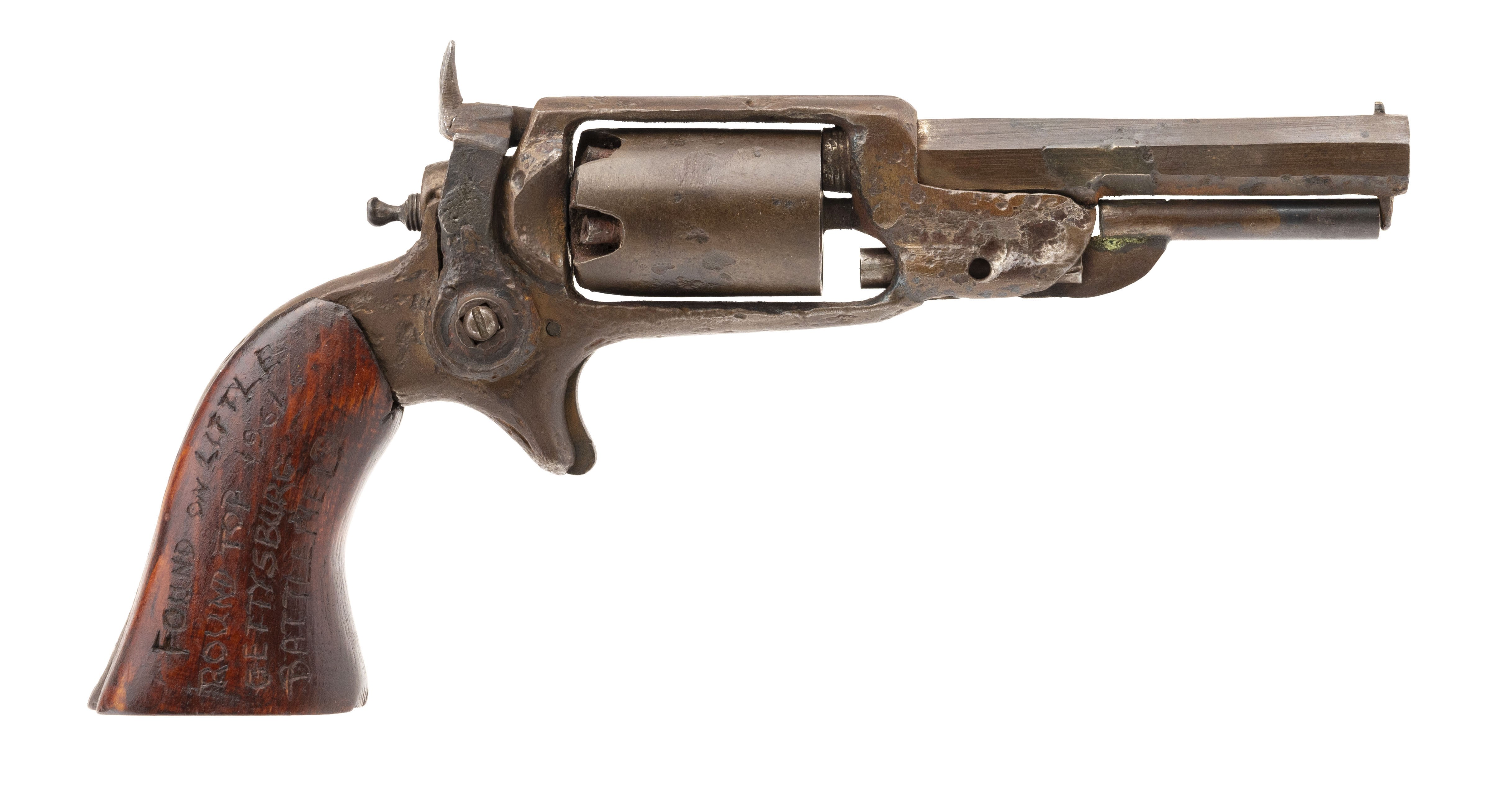 Civil War relic Colt Root from the battle of Gettysburg. The revolver is in relic condition and looks neat. The hammer, trigger and cylinder still move freely. The grips are in very good condition considering the age and they have "Gettysburg" carved onto the left side and "Found on little round top 1961 Gettysburg battlefield" on the right. In our opinion This pistol is a true Civil war relic!