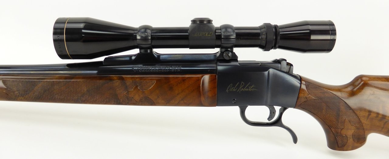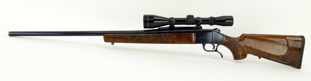 Colt/Sharps Arms Co. Sporting Rifle in .243 Win caliber. Rare Sharps Sporting Rifle made by Colt, belonged to TV actor Dale Robertson, best known for “Tales of Wells Fargo”. These guns were made in the 1970’s by Colt and only about 500 were made, making them quite scarce and desirable. This rifle is the Deluxe model with fancy walnut Monte Carlo stock and engraved cartridge trap on the underside of the buttstock. The receiver has been engraved with Robertson’s signature. The rifle is in excellent condition and has the proper Leupold 3x9 scope that came with these Deluxe models. Comes in the original factory plastic case and includes original tool kit, cleaning kit and sling. A neat set with an interesting history. $4500