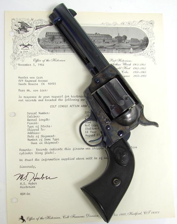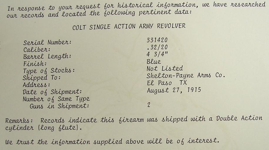 Colt Single Action .32-20 caliber long flute cylinder revolver with factory letter. Rare in .32-20. Shipped to El Paso, Texas. Beautiful refinish by Tom Haas Sr. Gun looks like new.