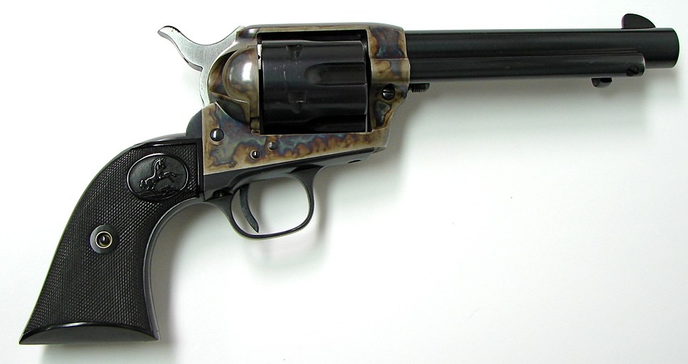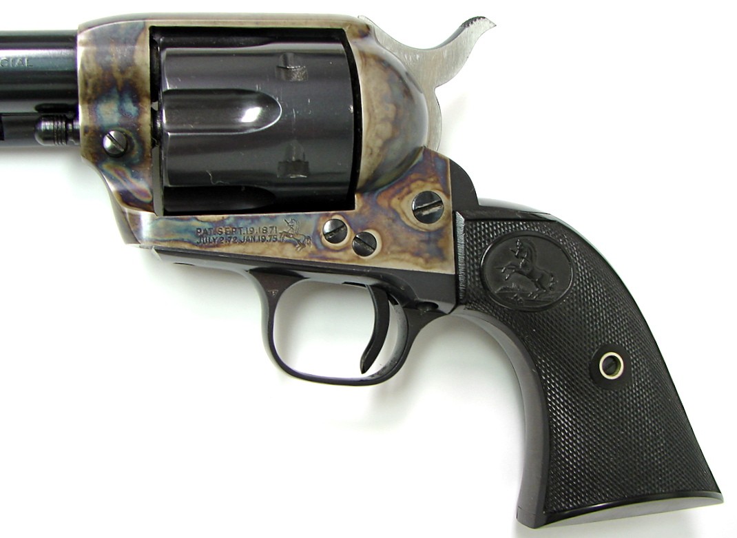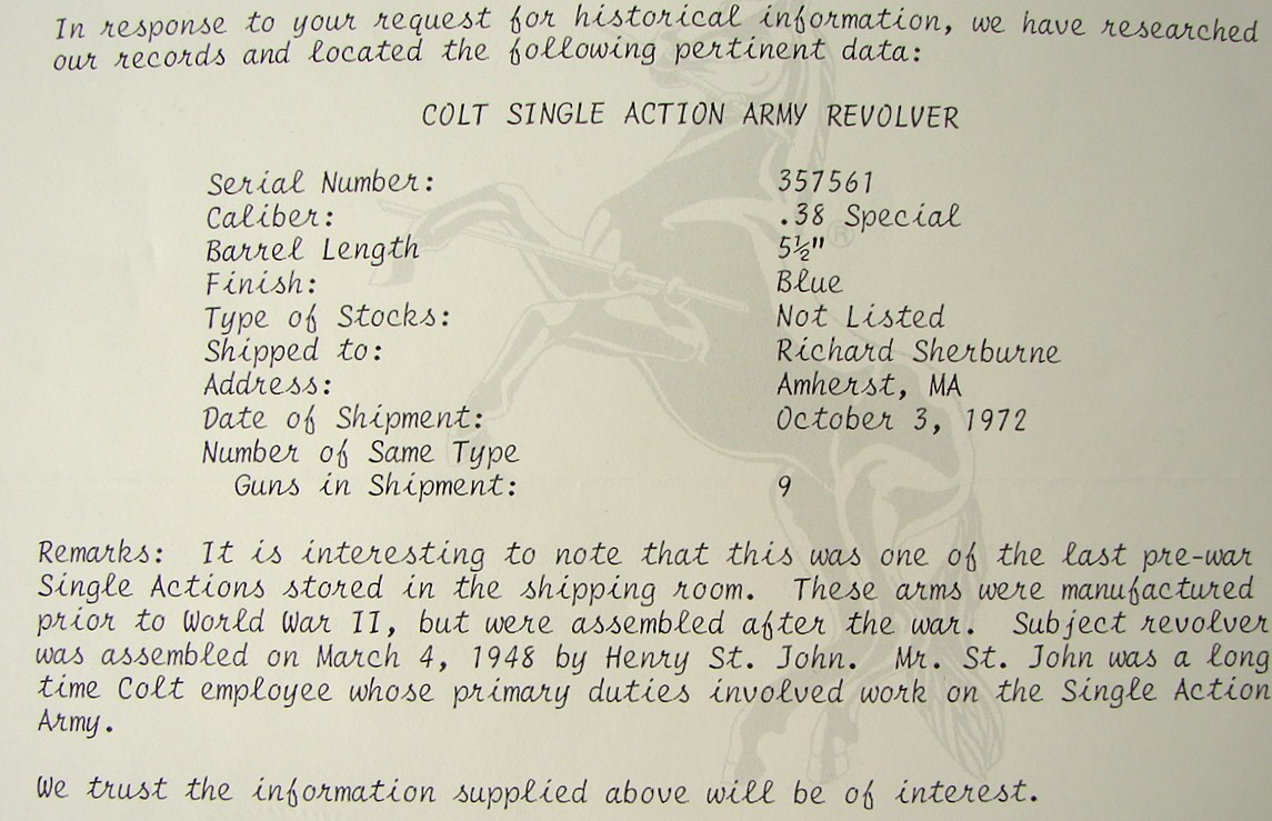 Colt Single Action .38 Spcl caliber revolver. Near mint Colt PreWar/PostWar Single Action. Comes with factory letter where the gun was shipped in 1972, but strangely by serial number the frame was made in 1940. Gun is near mint with bright case colors and excellent original blue finish. Bore and cylinder chamber are possibly unfired. These guns are scarce variations of the Colt Single Action Army as they were left over Pre-War frames that were assembled using post war parts. Very fine, rare variation of Colt Single Action Army! Comes with factory letter.
