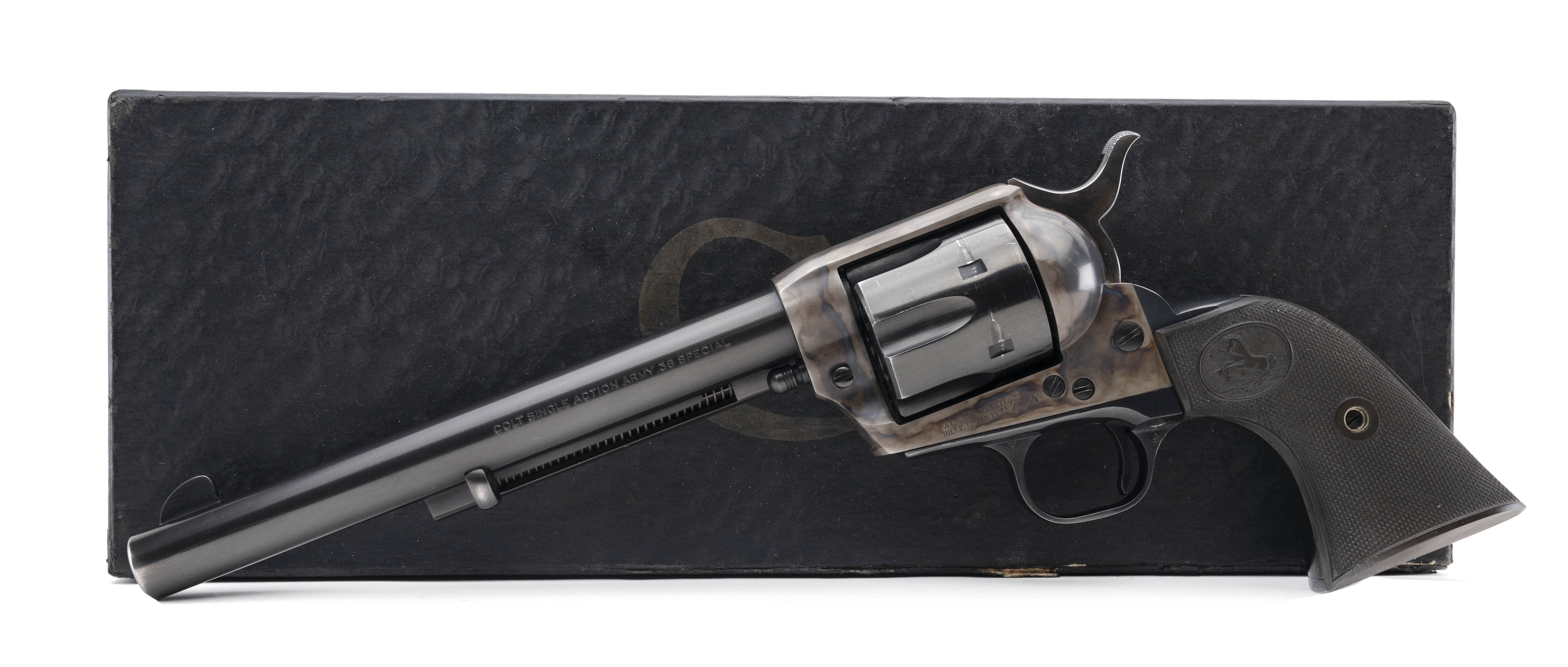 Colt Single Action .38 Special caliber revolver. Very early 2nd generation black box model with 7½" barrel. The gun is about 95% with minor wear at the muzzle and on the cylinder. Excellent overall condition with box and papers. Made in 1957.