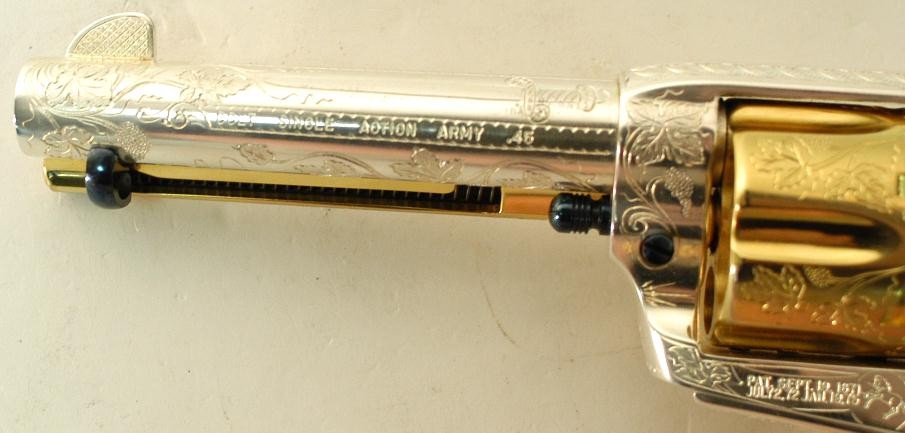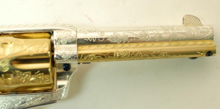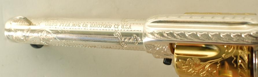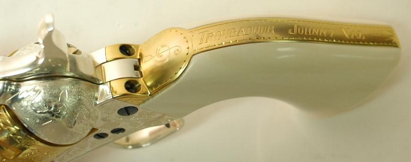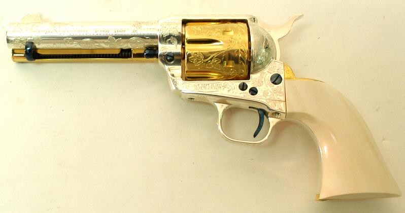 Colt Single Action .45 caliber 3rd Generation revolver custom engraved by John Adams, Sr. Silver and Gold plated. One piece ivor (c1435)