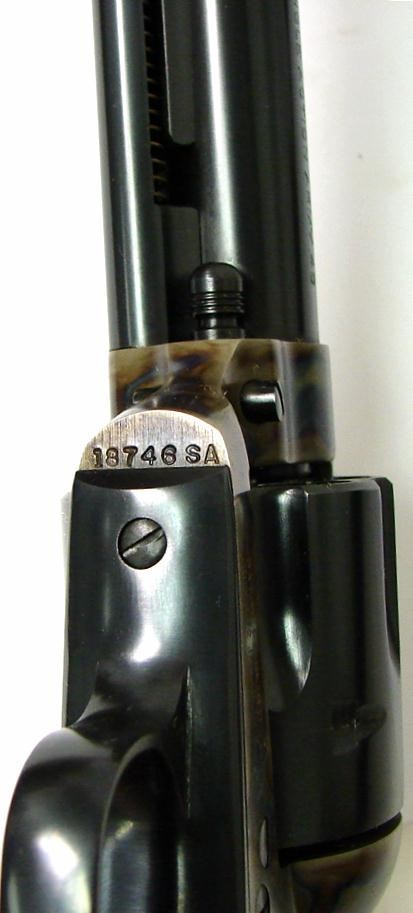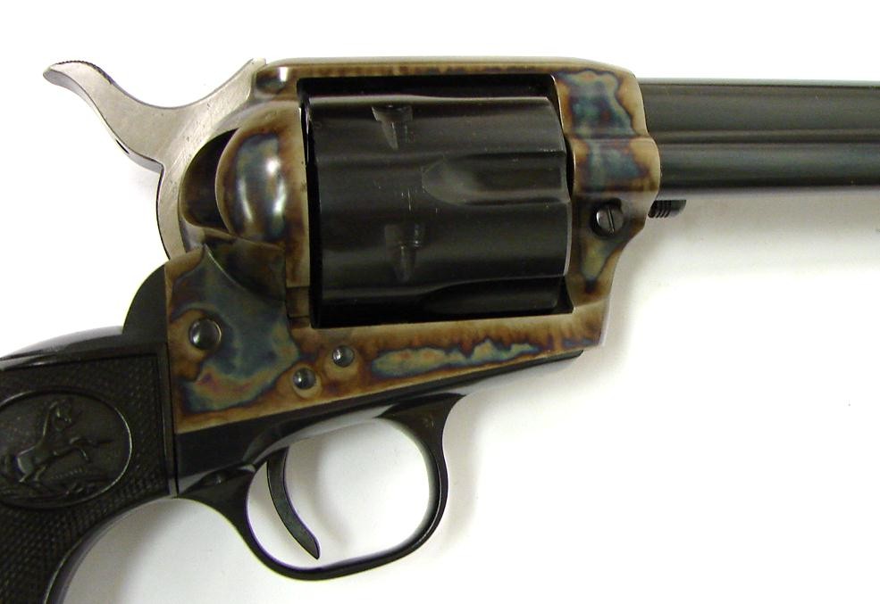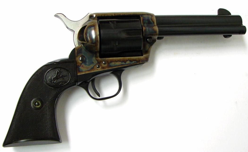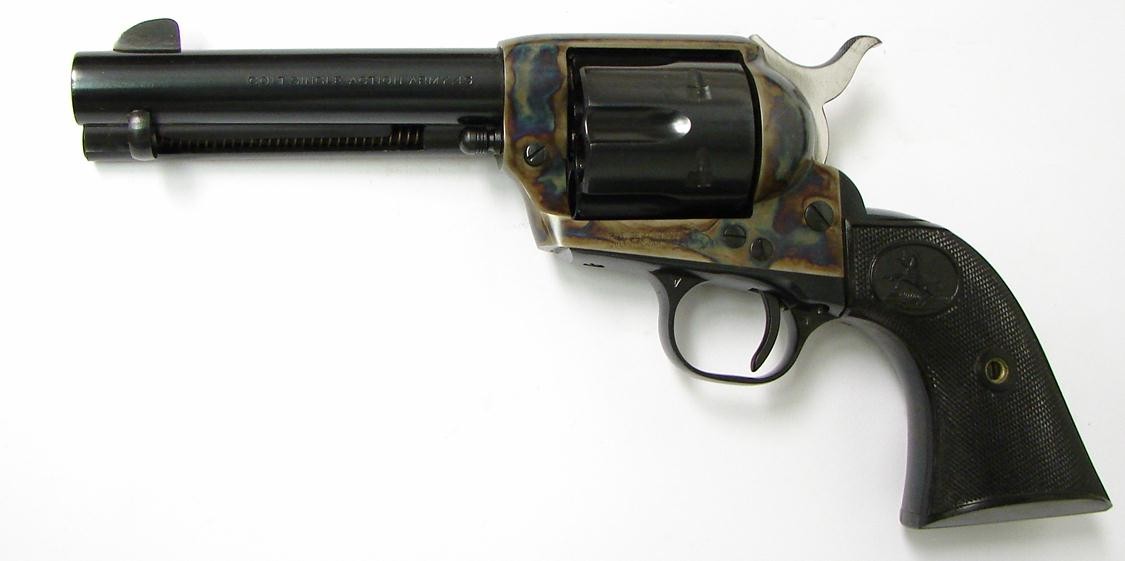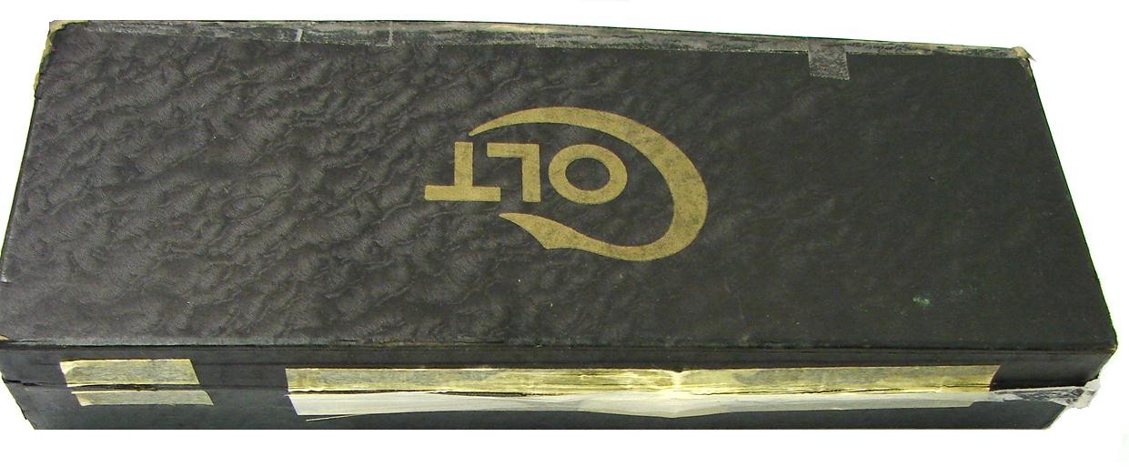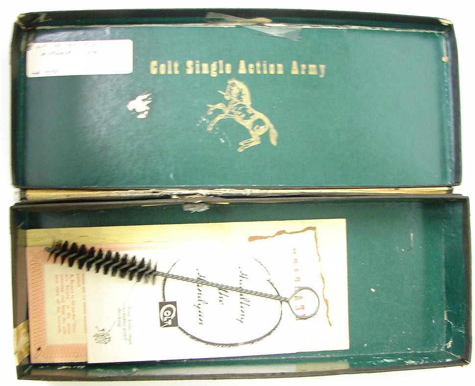 Colt Single Action .45 LC caliber revolver. Very early 4 3/4" 2nd Generation model made in 1958. Beautiful condition, appears unfired with original matching black box. The box is a bit tattered but still sound with papers and brush. A very desirable Colt Single Action, in the most popular barrel length, 4 3/4"