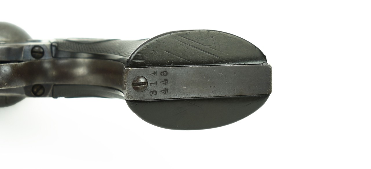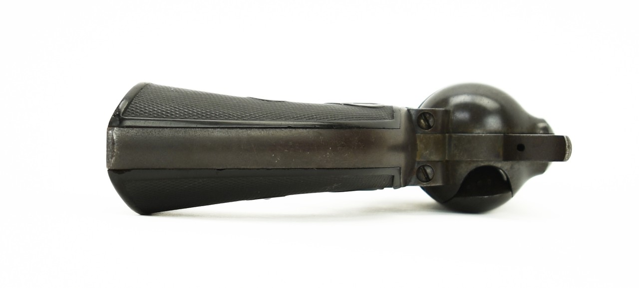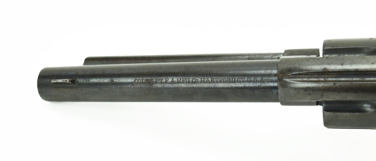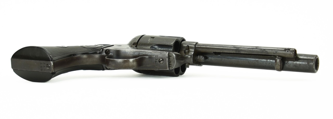 Colt Single Action Army 1st Generation .45 LC caliber revolver. Manufactured approximately in 1910. Barrel length is 5 ½”. Action works perfectly. Locks up and indexes perfectly. Grips are near excellent, except for a very tiny chip at the left side front toe. Bore has strong rifling and frosting in the grooves. This is a very sharp Single Action and well cared for!