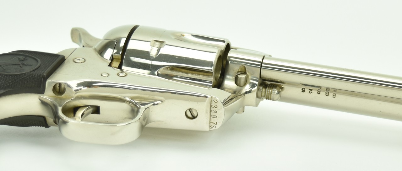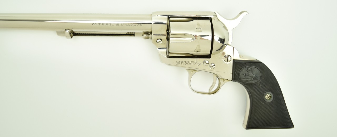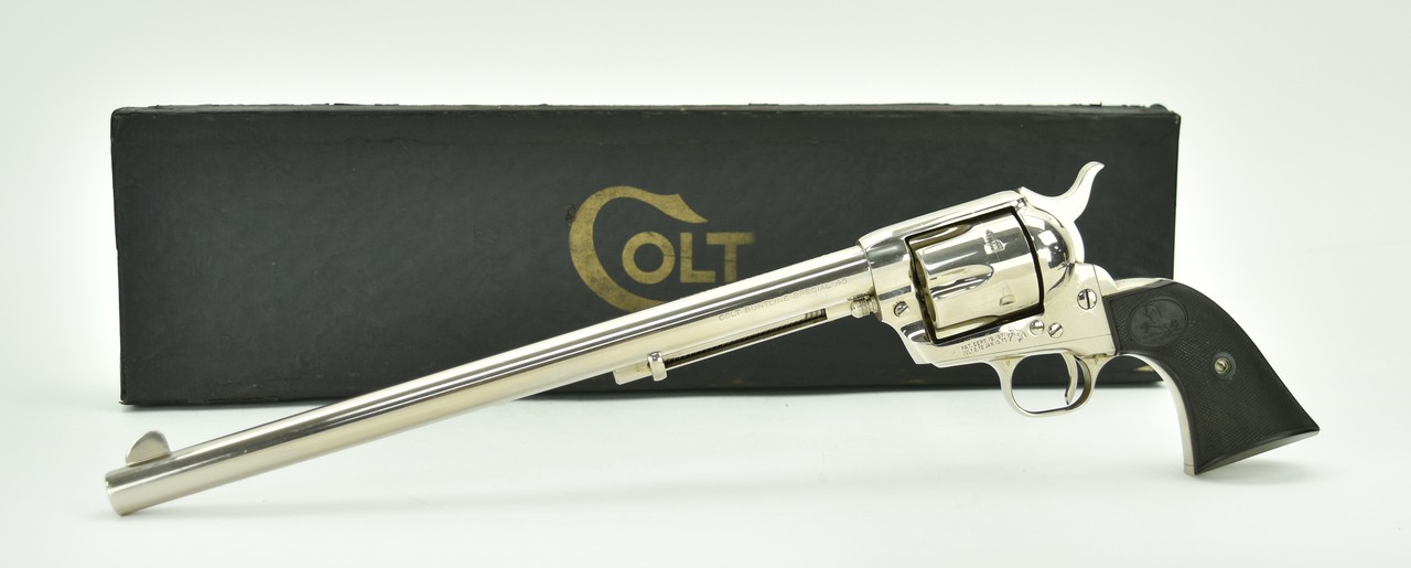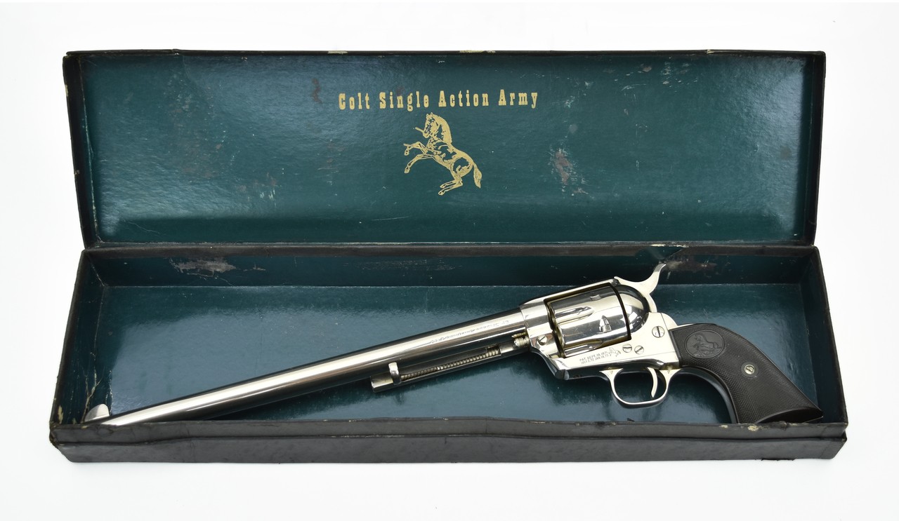 Colt Single Action Army 2nd Generation Nickel Buntline Special .45 Caliber with box. Made in 1959. .45 Caliber with 12” barrel. 65 guns were made in this configuration. The gun is in mint condition and in the original box. It’s a very rare nickel Buntline.