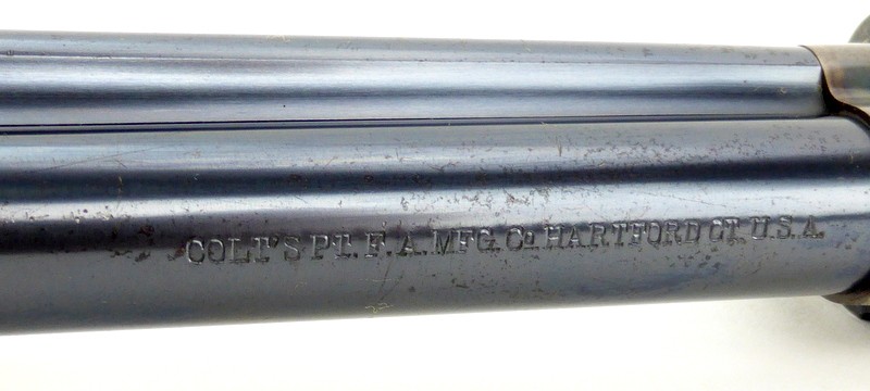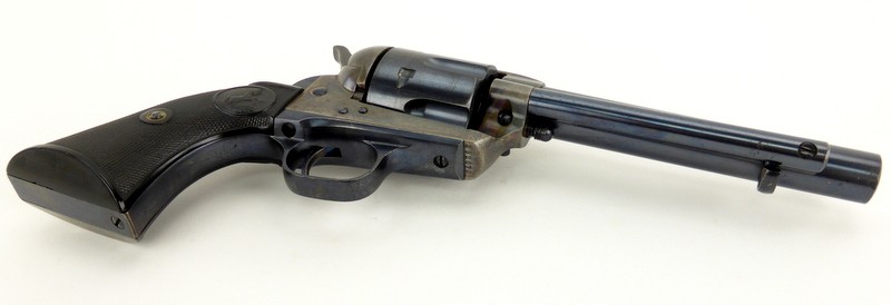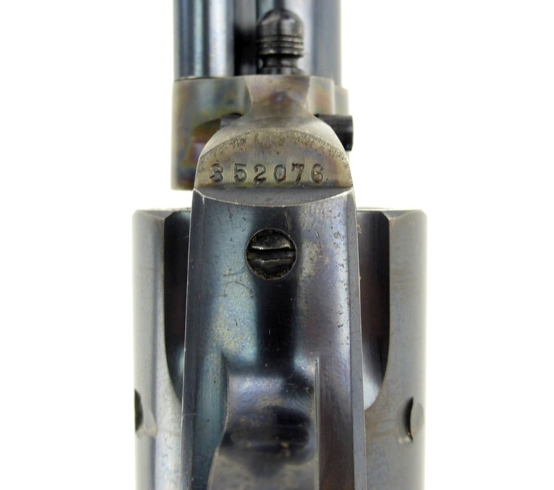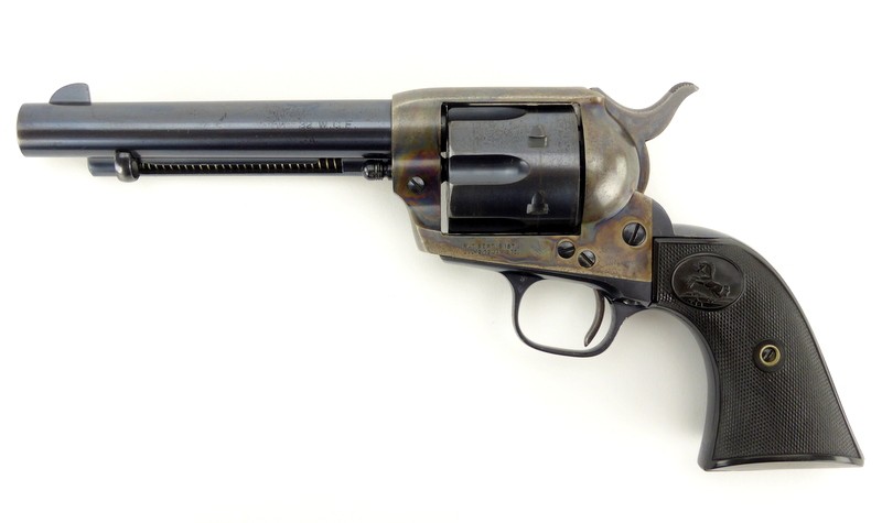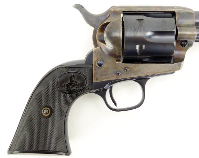 Colt Single Action Army .32 WCF caliber revolver. Manufactured approximately in 1929. Excellent bore. Action works perfectly. Gun has 95% original blue and 95% case colors. Note: Grips are proper factory grips but are 4 digits off (Gun is 352076, grips are 352072). No doubt the fault of a hungover factory assemblyman. They fit perfectly. Bottom of trigger guard bow has two very small rub spots. This Pre-war Single Action is excellent.