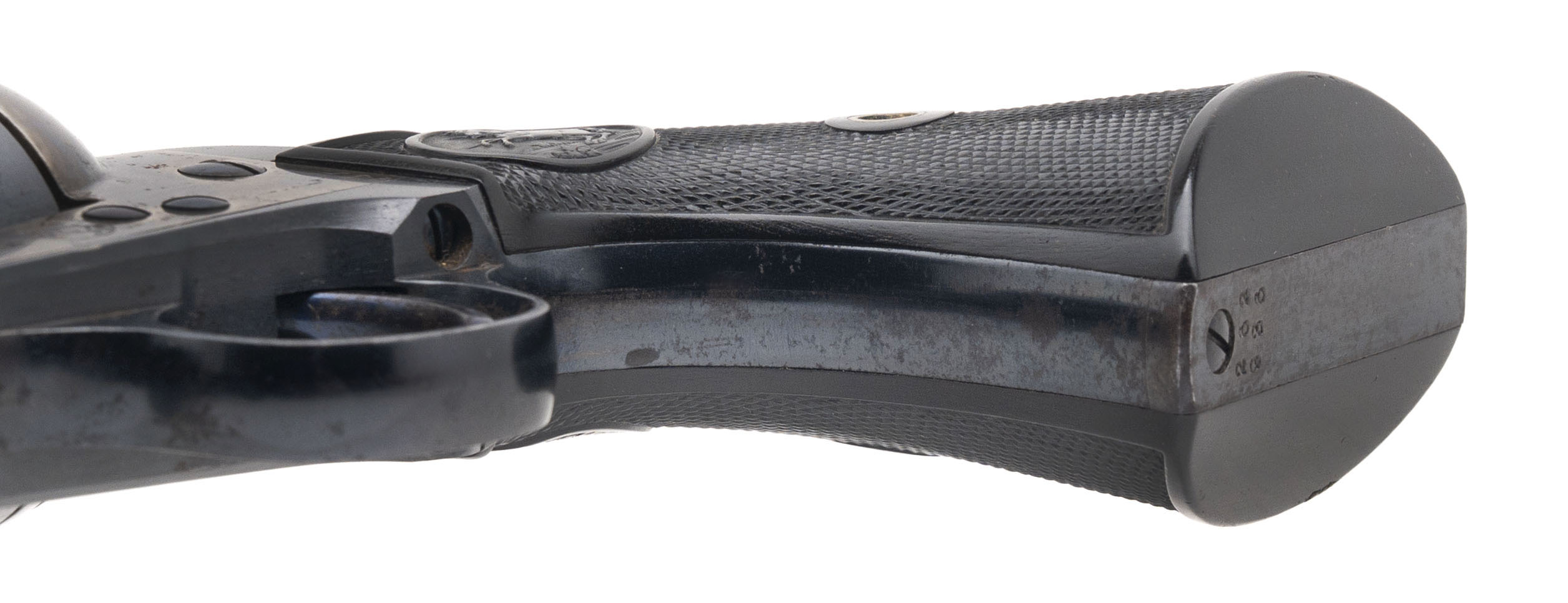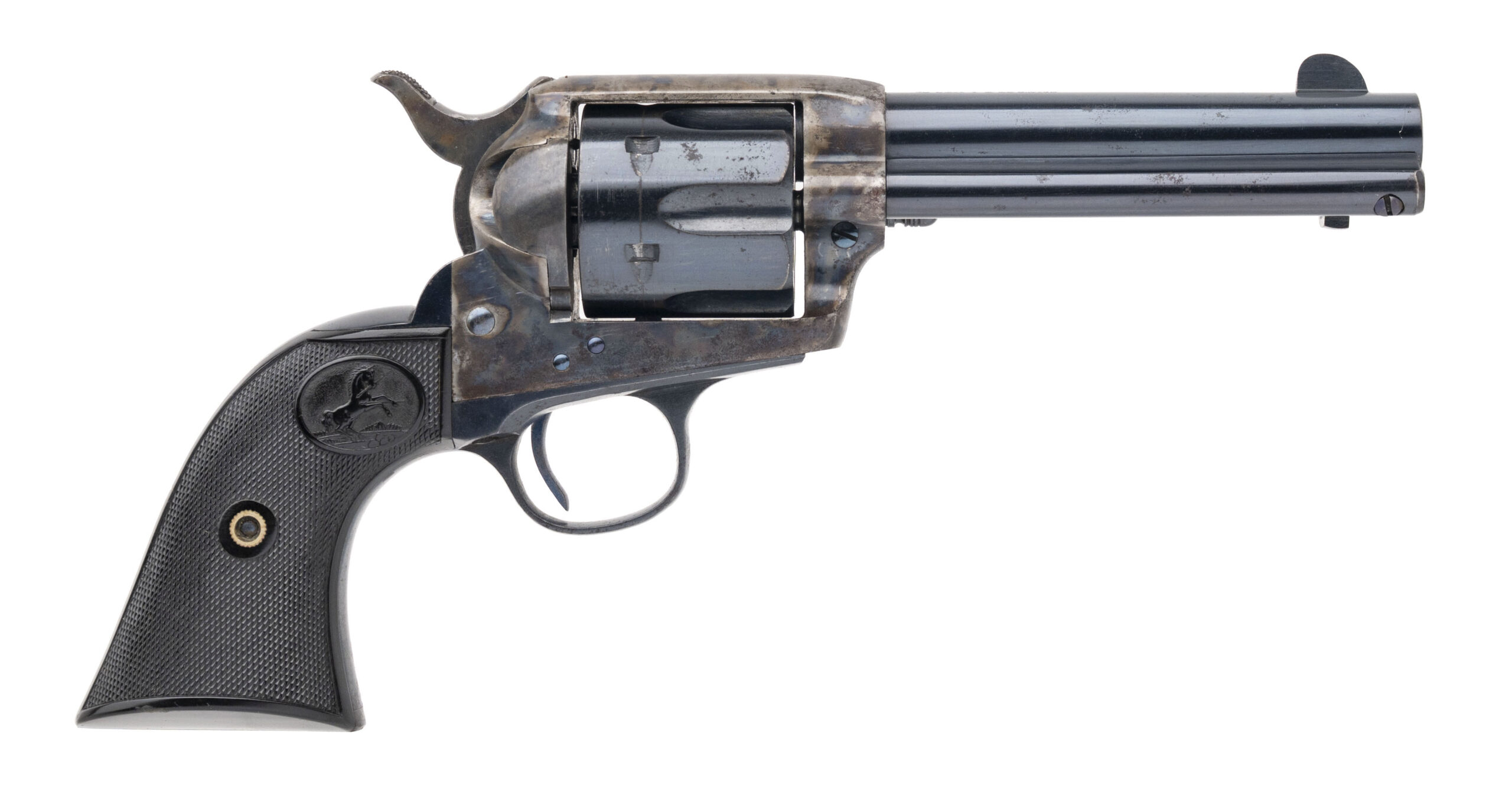 Serial number 262938. Made in 1905. 38-40 caliber with a 4.75” barrel. This gun is in excellent condition with almost all of the original high luster blue. 97% of the original high luster blue remains. The frame is excellent with over 80% of the original bright case colors. The grips are excellent. Very fine original Colt Single Action Army!