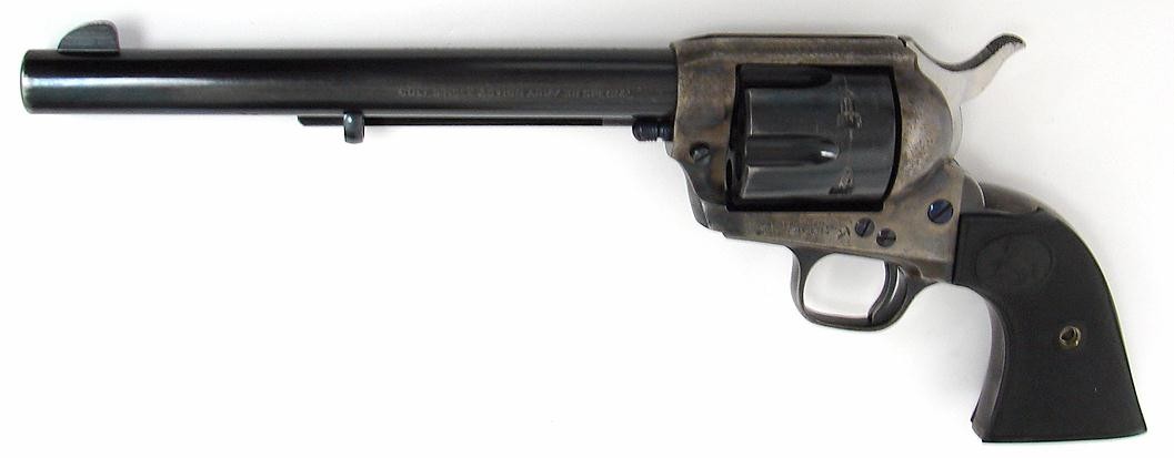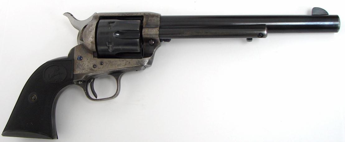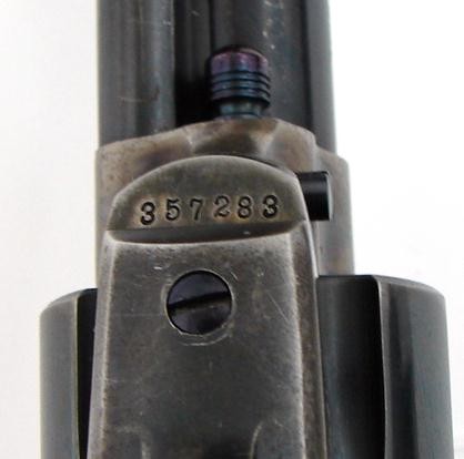 Colt Single Action Army .38 Special caliber revolver. Pre-war 38 Special serial number 357XXX (last two digits are on the cylinder). Grips fit well but not perfectly and are not numbered to this gun. Gun has about 30% bright case colors and about 80% blue. Excellent action and bore.