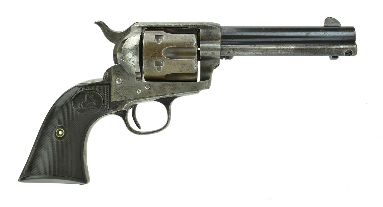 Colt Single Action Army Black Powder Frame. Made in 1894. Very fine condition for a Black Powder gun with 85% of the original blue on the barrel. Case colors still remain in protected areas on the frame. The cylinder has a mostly light brown patina. Grips are good and do show light wear. Overall, a very fine Colt Single Action Army.