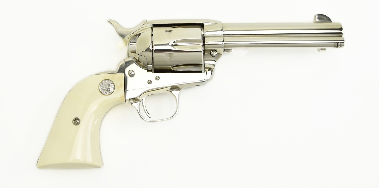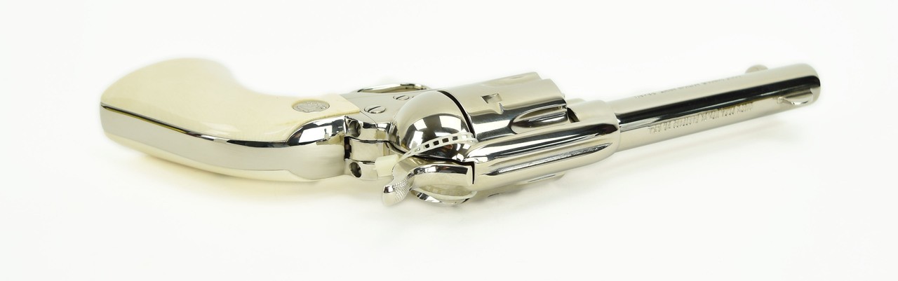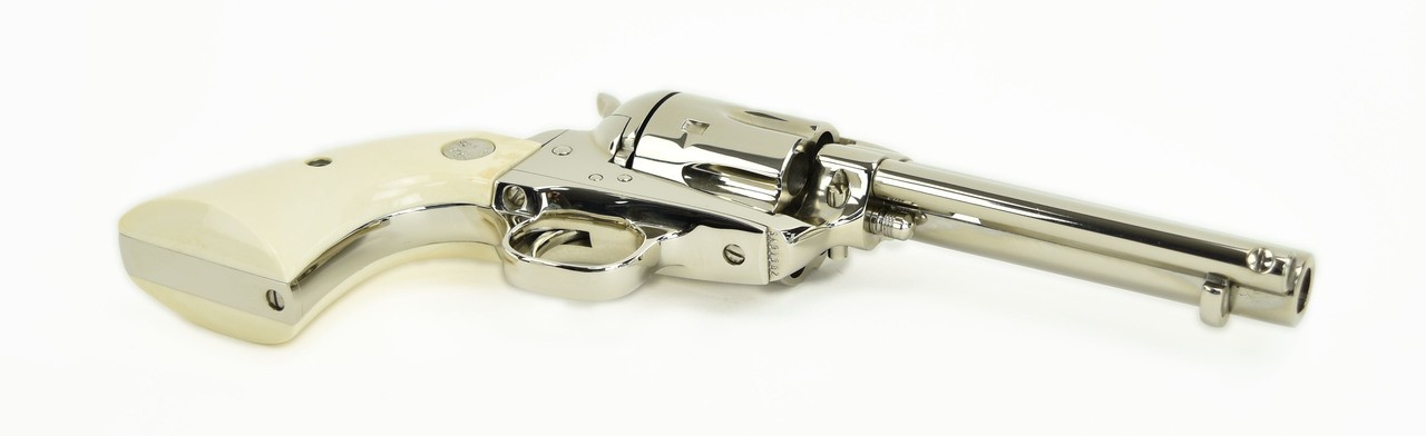 Colt Single Action Army .44-40 caliber revolver. 3rd generation, 4 ¾” model with nickel finish, and beautiful medallion grips. It is in mint condition and comes with a box.