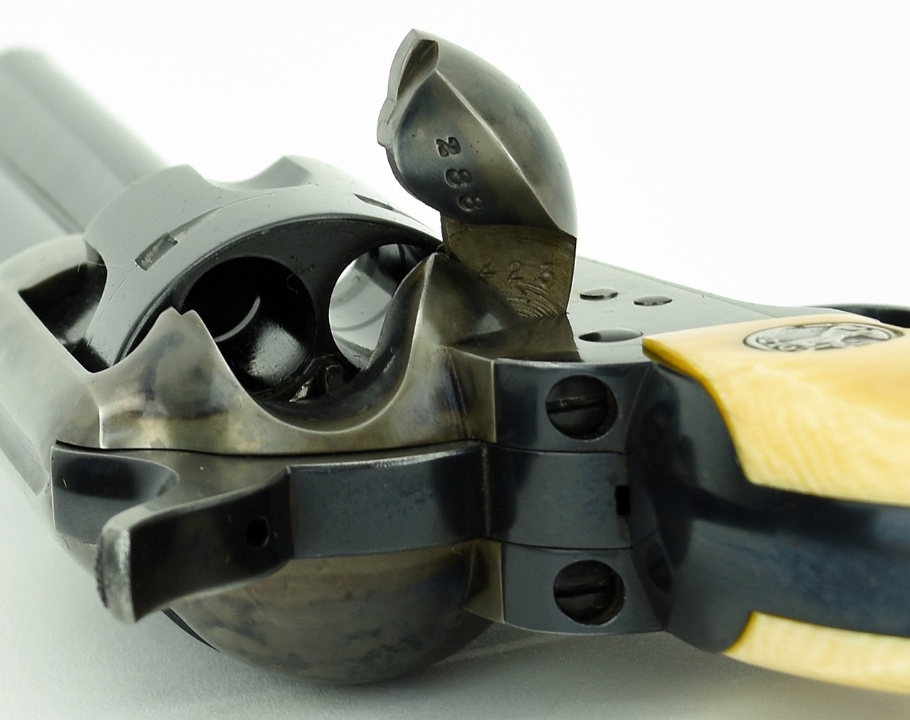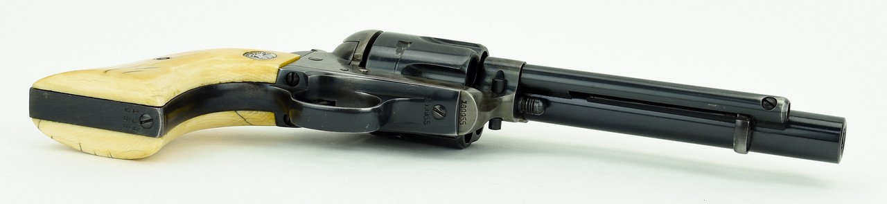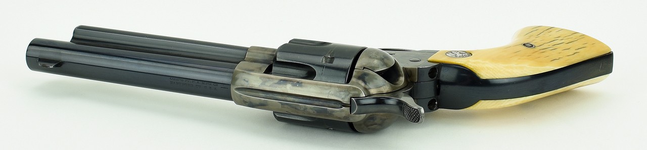 Colt Single Action Army .44-.40 caliber revolver. Manufactured in 1897. This revolver has factory rework numbers from the 1930’s so the frame is antique and the barrel and cylinder were added in the 1930’s. Gun was factory refinished on the frame, trigger guard and back strap at that time. The blue on the barrel and cylinder being factory original from the pre-war period. The other parts and frame colors being factory refinished. Interestingly, the 5 ½” barrel has a two line Hartford address as you see on 4 ¾” barrels. Gun has 98% factory case colors and 98% blue. Very interesting black powder, pre-war combination gun.