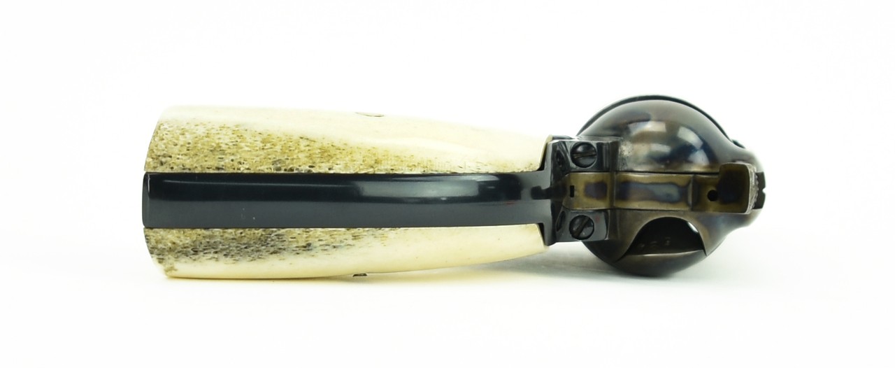 Colt Single Action Army .44 Special caliber revolver. 1st Generation Single Action Army customized into a neat gunfighter gun in desirable .44 Special caliber. The barrel is 3 ½” with half of an 1883 dime for a front sight, the hammer is wide and checkered for easy cocking, the action has been tuned and slicked up. Has smooth stag grips. An outstanding custom piece in excellent condition.