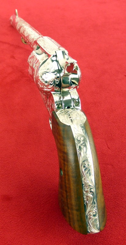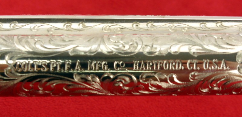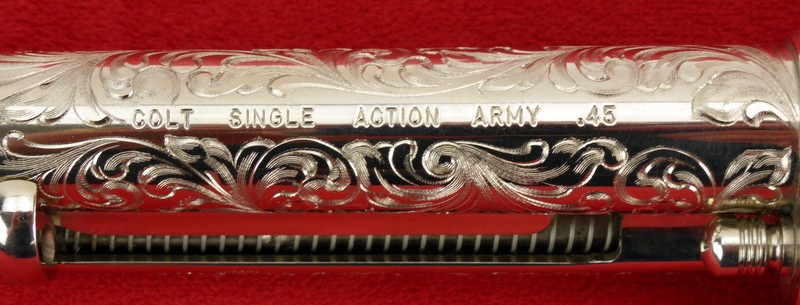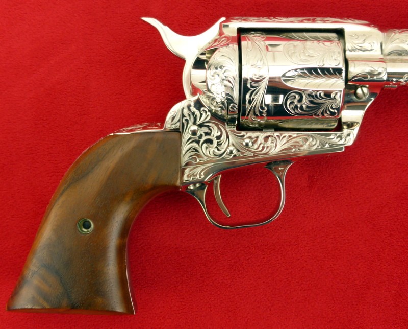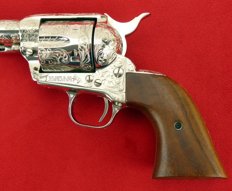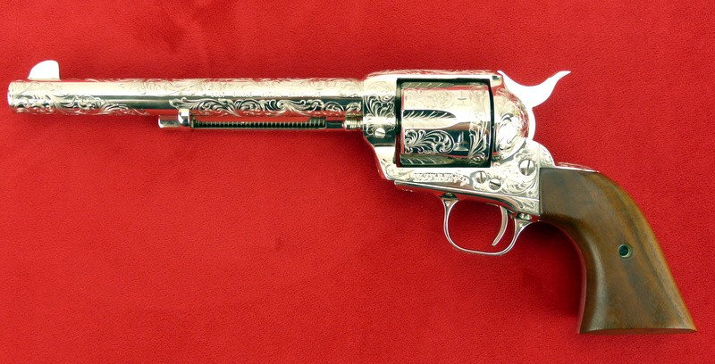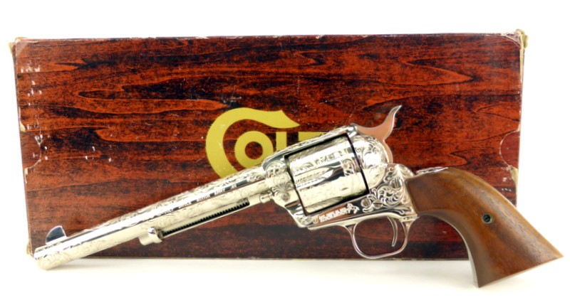 Colt Single Action Army .45 Long Colt caliber revolver. Factory engraved 3rd Generation model with beautiful Class D engraving, 7 1/2" barrel, and nickel finish. Excellent condition with box. A very desirable Colt .45 Single Action.