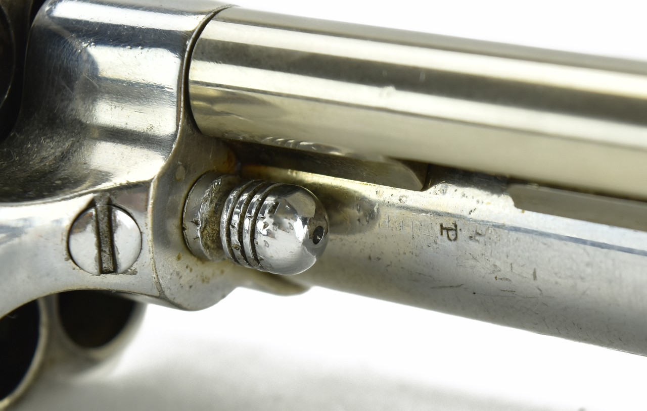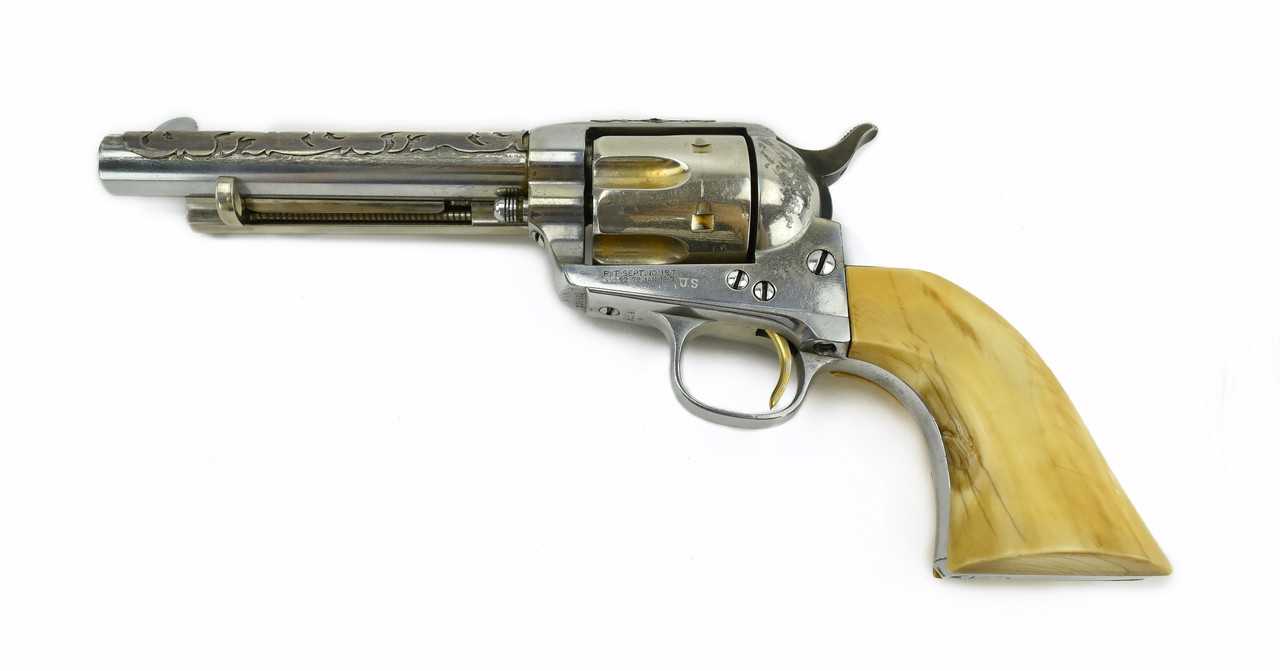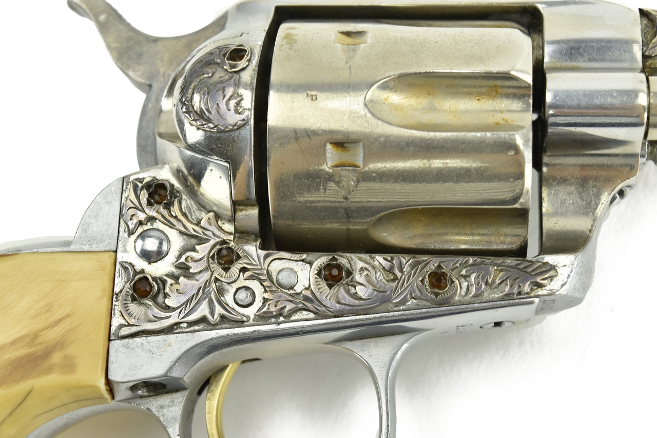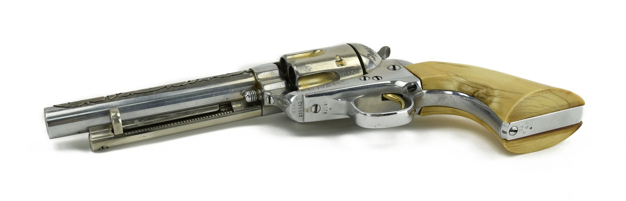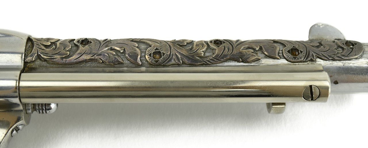 Colt Single Action Army .45LC caliber revolver. Very interesting Colt Single Action Army made in 1891. Very interesting decorated gun. This gun was started out life as a cavalry model with a 7 ½” barrel. It was then made into an Artillery model for the Spanish American War. Then this was made into a “Sunday Picnic Bar B Que” gun. This gun is unusual in that it is not engraved, it is overlayed with silver and decorated with some sort of decorative stones. The overlay is engraved on the right hand side (the show side). The cylinder and the ejector housing were gold plated. Very nice grips. Unusual decorated gun!