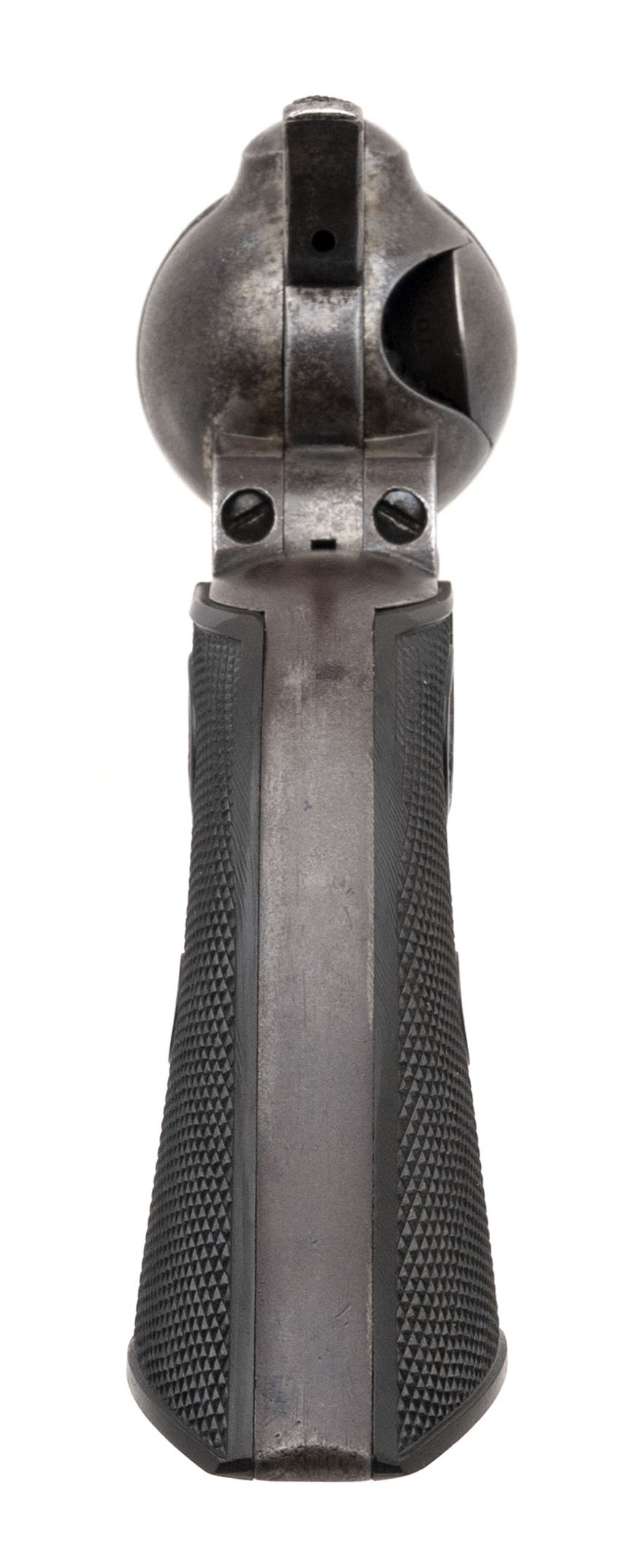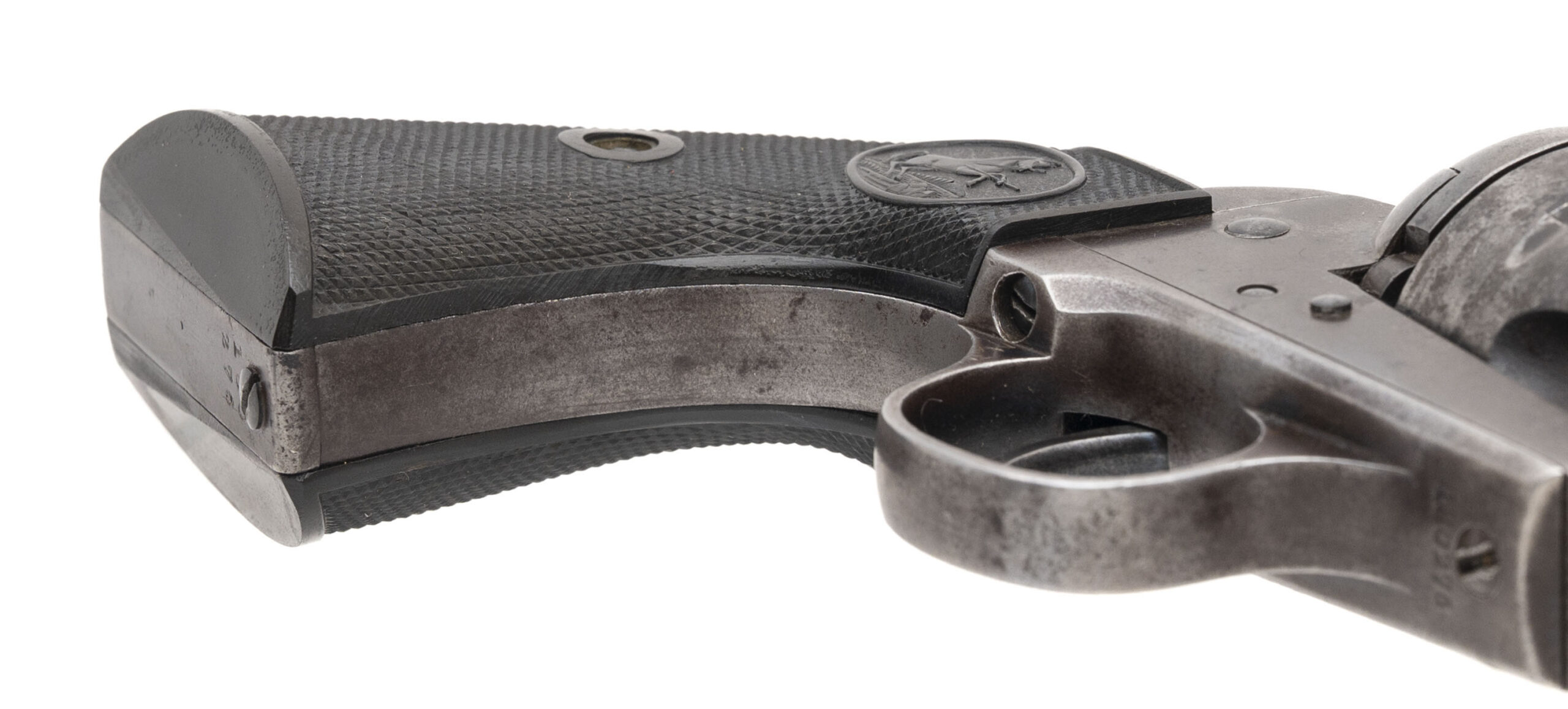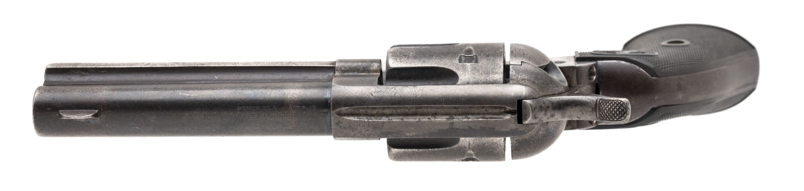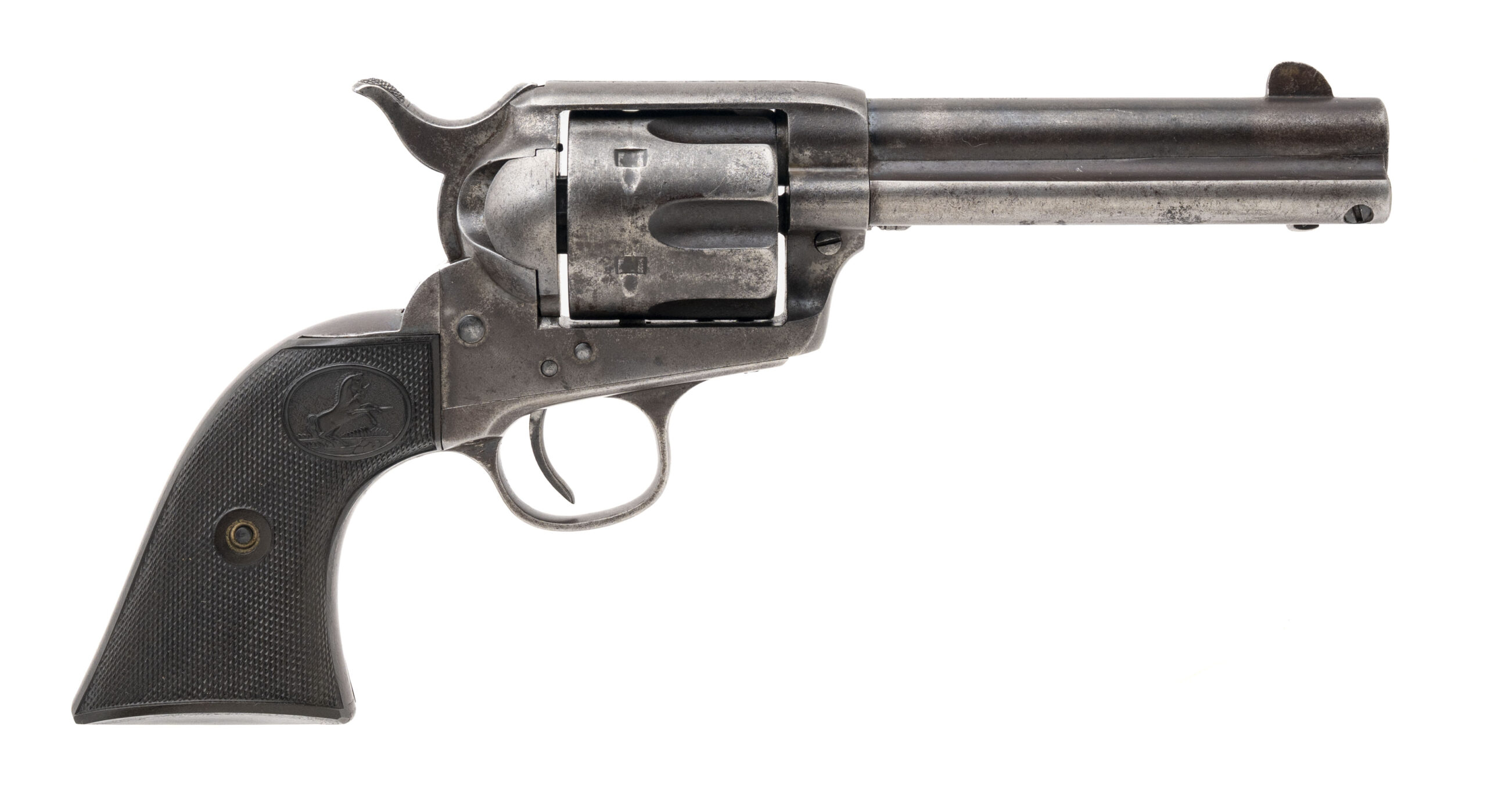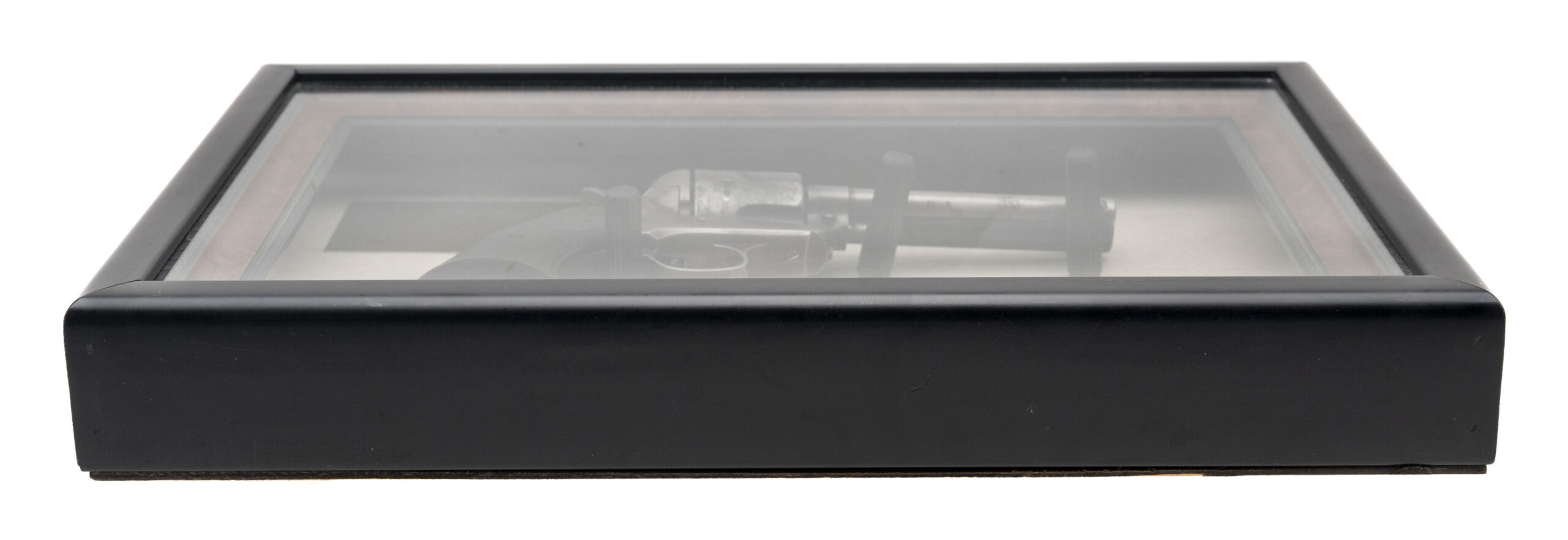 Serial number 180276. Made in 1898. 41 Colt caliber with a 4 ¾" barrel. This gun has a dark gray patina with what appears to be blue in protected areas. This gun is mounted in a shadow box. The factory letter accompanies this gun and an engraved copy is mounted in the shadow box. This is one of the last antique single actions made in 1898!.