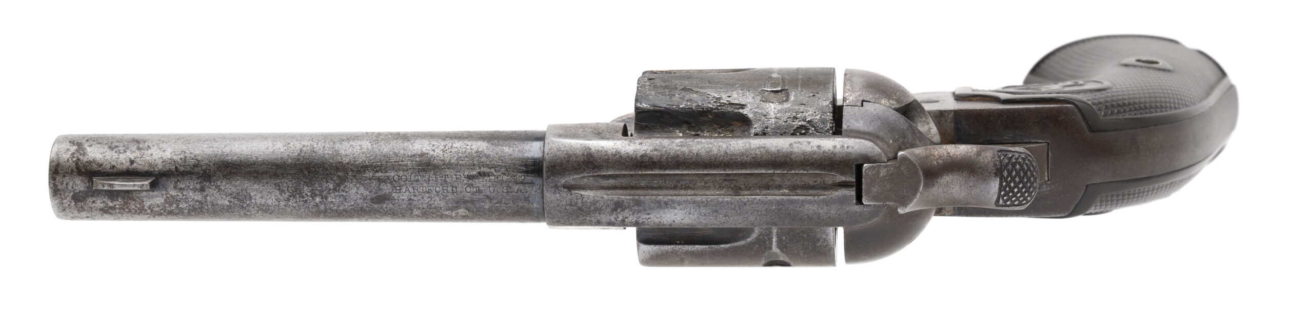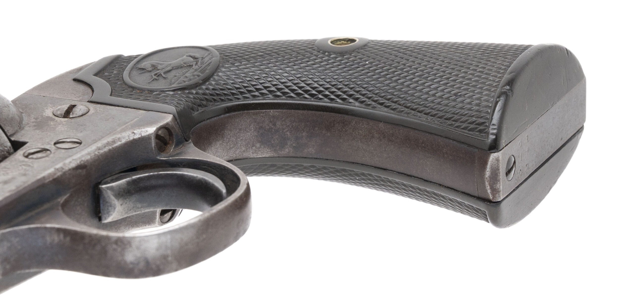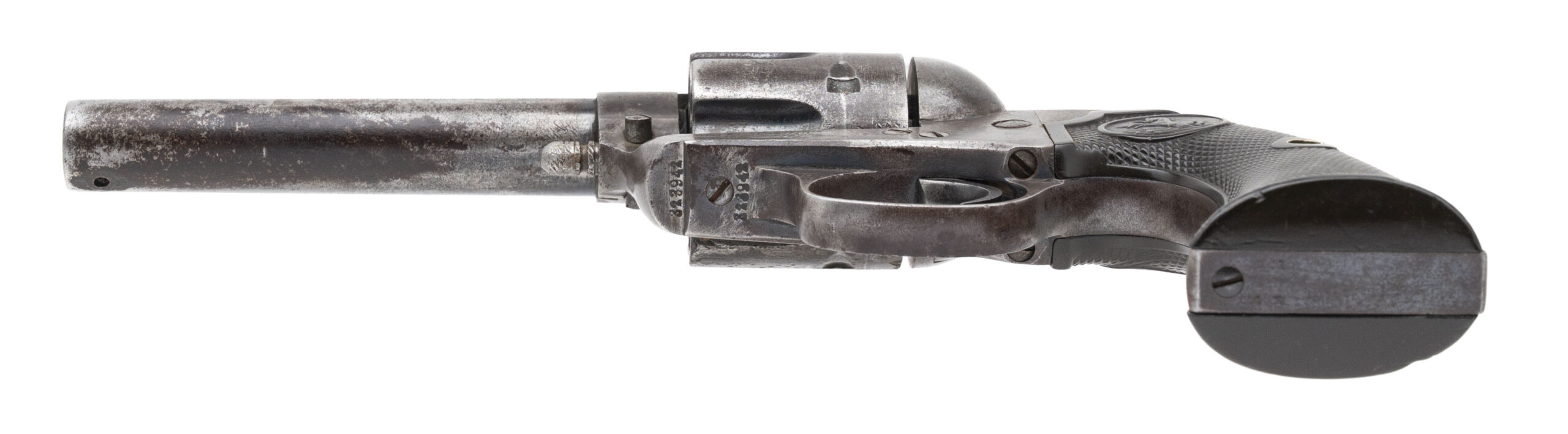 Serial number 323942. Made in 1912. 32-20 caliber with a 4.75” barrel. This gun has a dark gray patina on the frame, cylinder, trigger guard and backstrap. The barrel has been cleaned so it has a lighter gray patina. The grips are very good. This gun has been converted to a sheriff's mode with the ejector rod housing removed and the frame ground. This gun was shipped to Colt distributor Norville, Shapleigh Hardware Company.