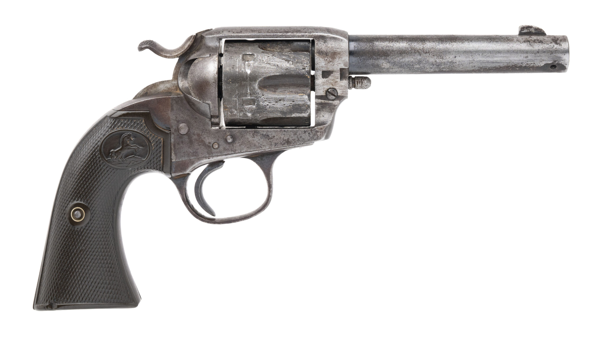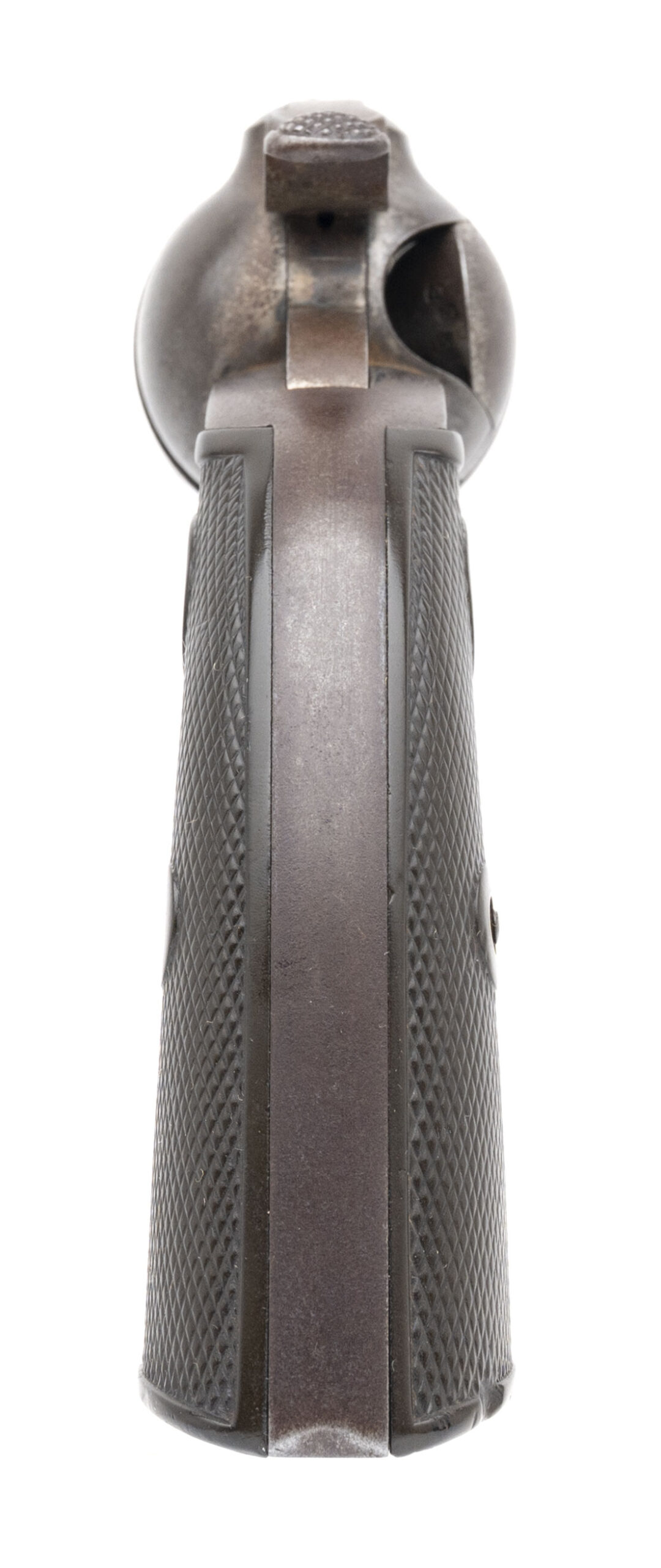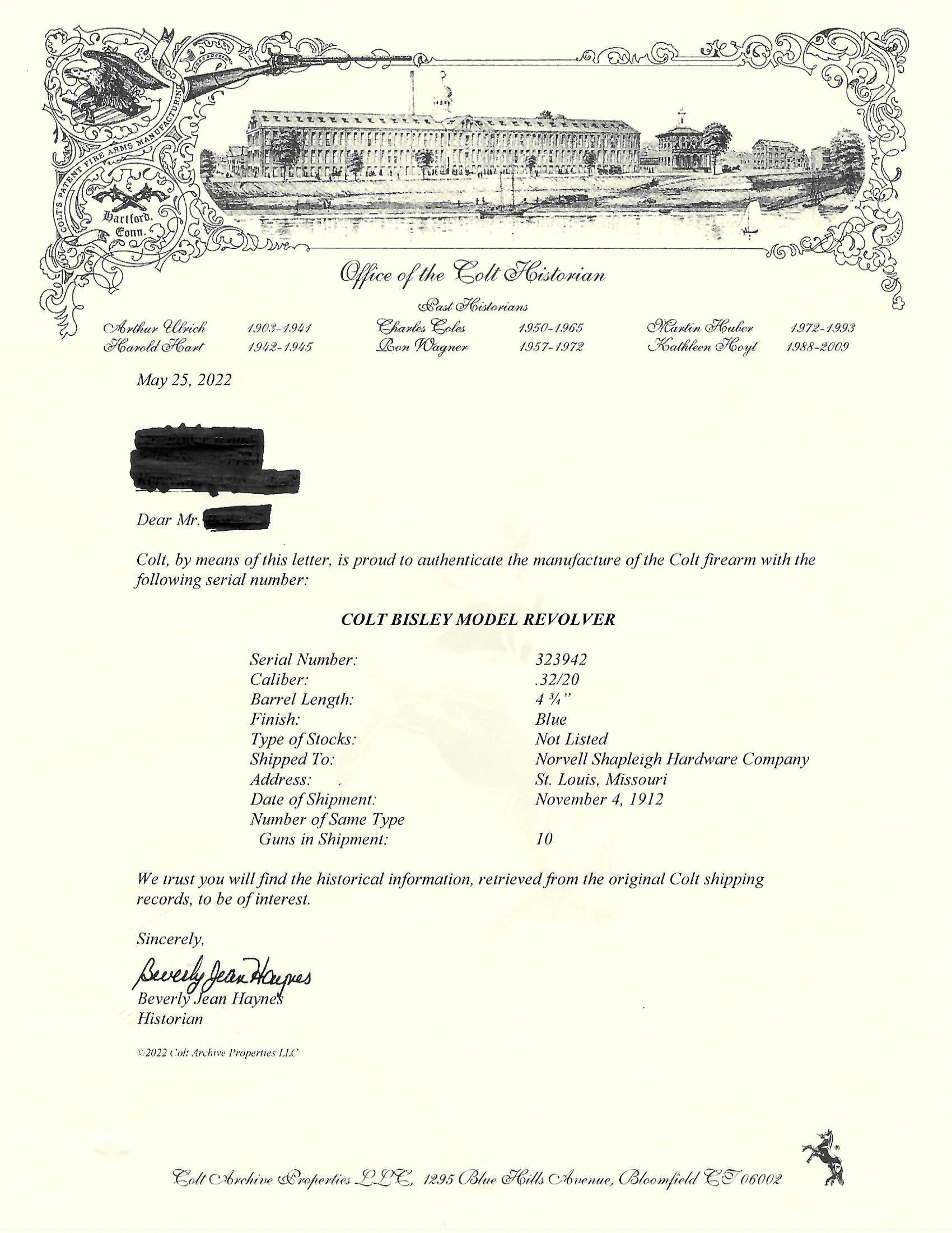 Serial number 323942. Made in 1912. 32-20 caliber with a 4.75” barrel. This gun has a dark gray patina on the frame, cylinder, trigger guard and backstrap. The barrel has been cleaned so it has a lighter gray patina. The grips are very good. This gun has been converted to a sheriff's mode with the ejector rod housing removed and the frame ground. This gun was shipped to Colt distributor Norville, Shapleigh Hardware Company.