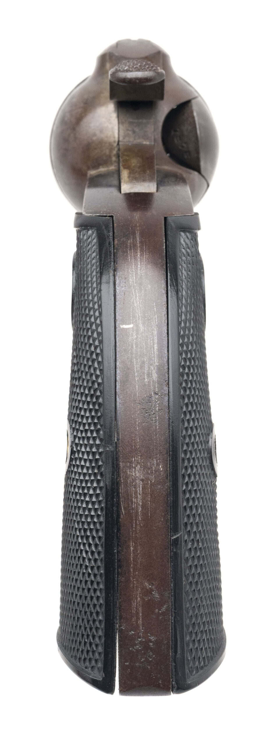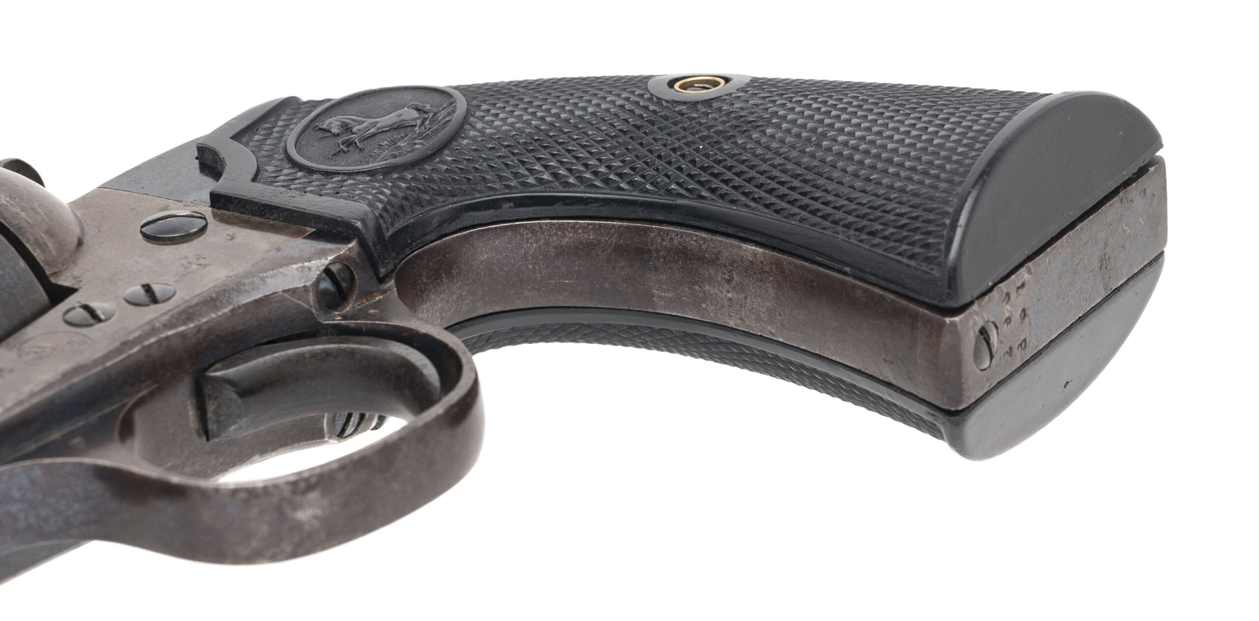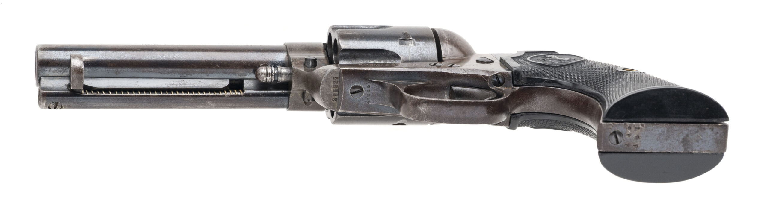 Serial number 296887. Made in 1907. 38-40 caliber with a 4.75” barrel. This is a nice sharp gun with 50%-60% of the original blue on the barrel. The frame still has case colors in the protected areas. The cylinder still has blue in the flutes. The grips are well made replacements.