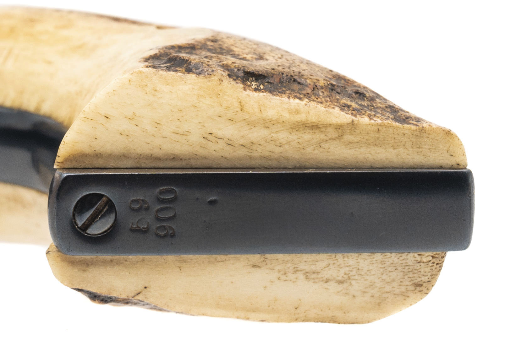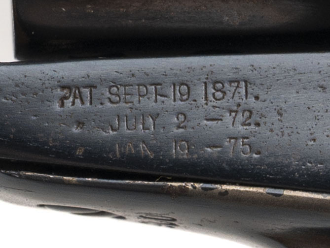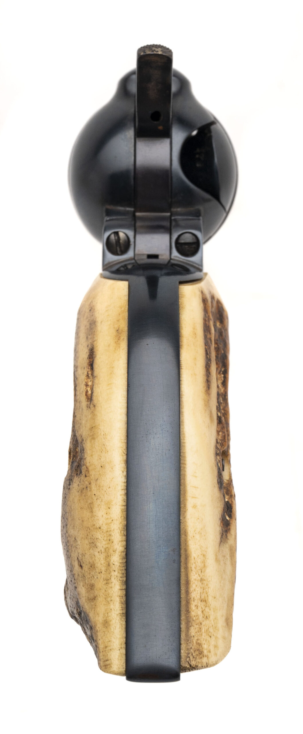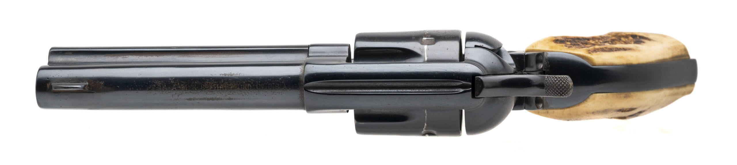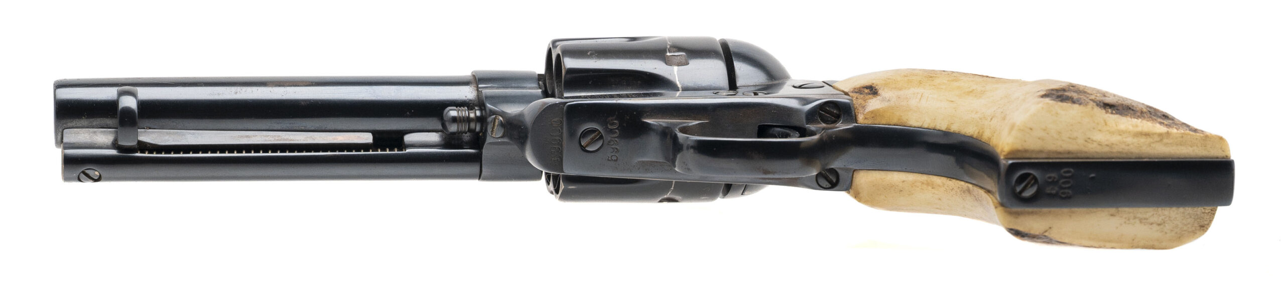 Serial number 59900. Made in 1880. 45LC caliber with a 4.75” caliber. This gun has 99% of the refinished blue. The barrel has been shortened. The grips are modern two piece stags. The action works properly. The bore has strong rifling with scattered light pitting.