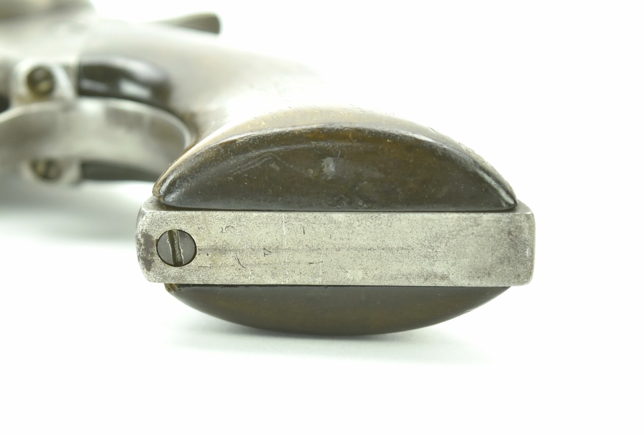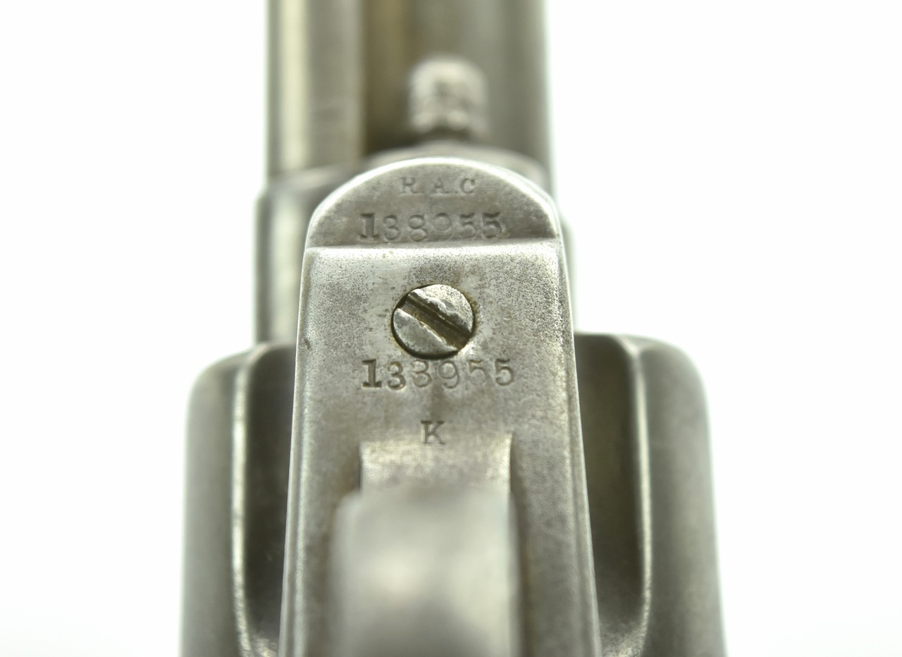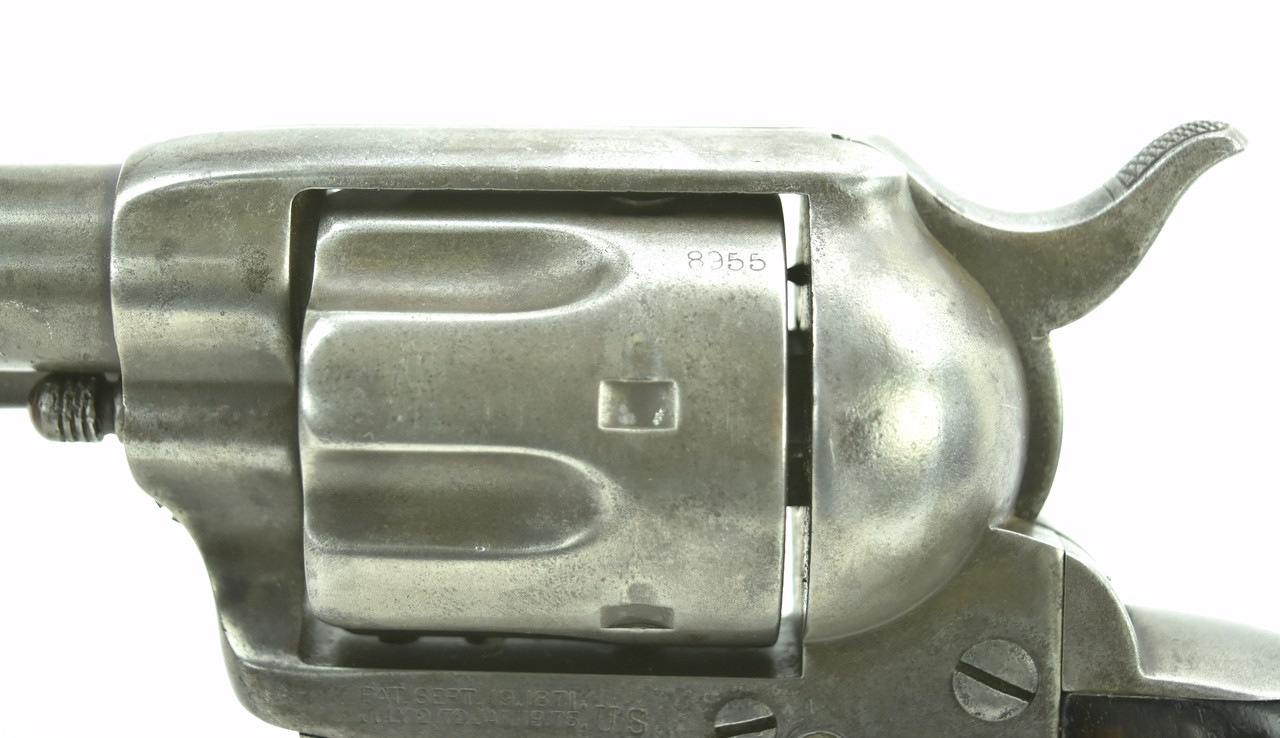 Colt Single Action Army Cavalry Model Revolver. Made in 1891. This gun has a gray patina on the metal surfaces. The grips have been varnished long ago. This was a martial single action inspected by Rinaldo Carr. His inspector’s marks are throughout the gun. The barrel on this gun was shortened at one time and now has been restored to its original length. Action works perfectly.