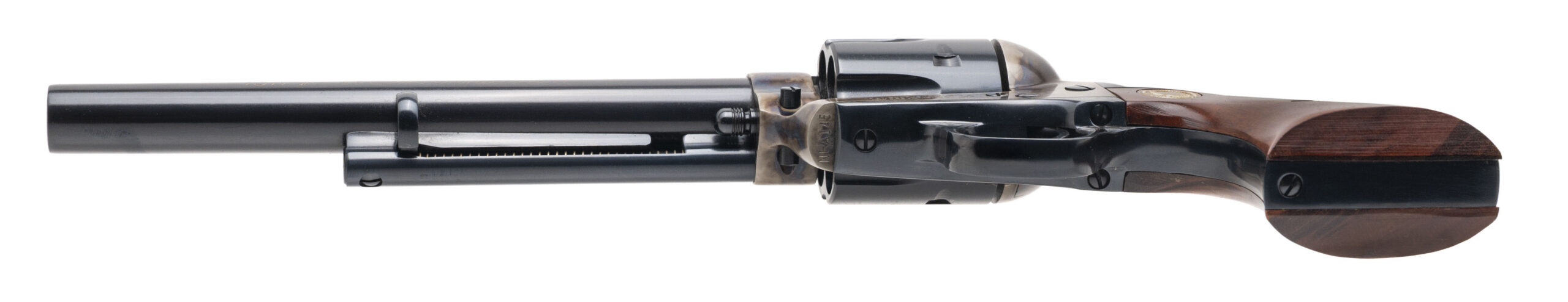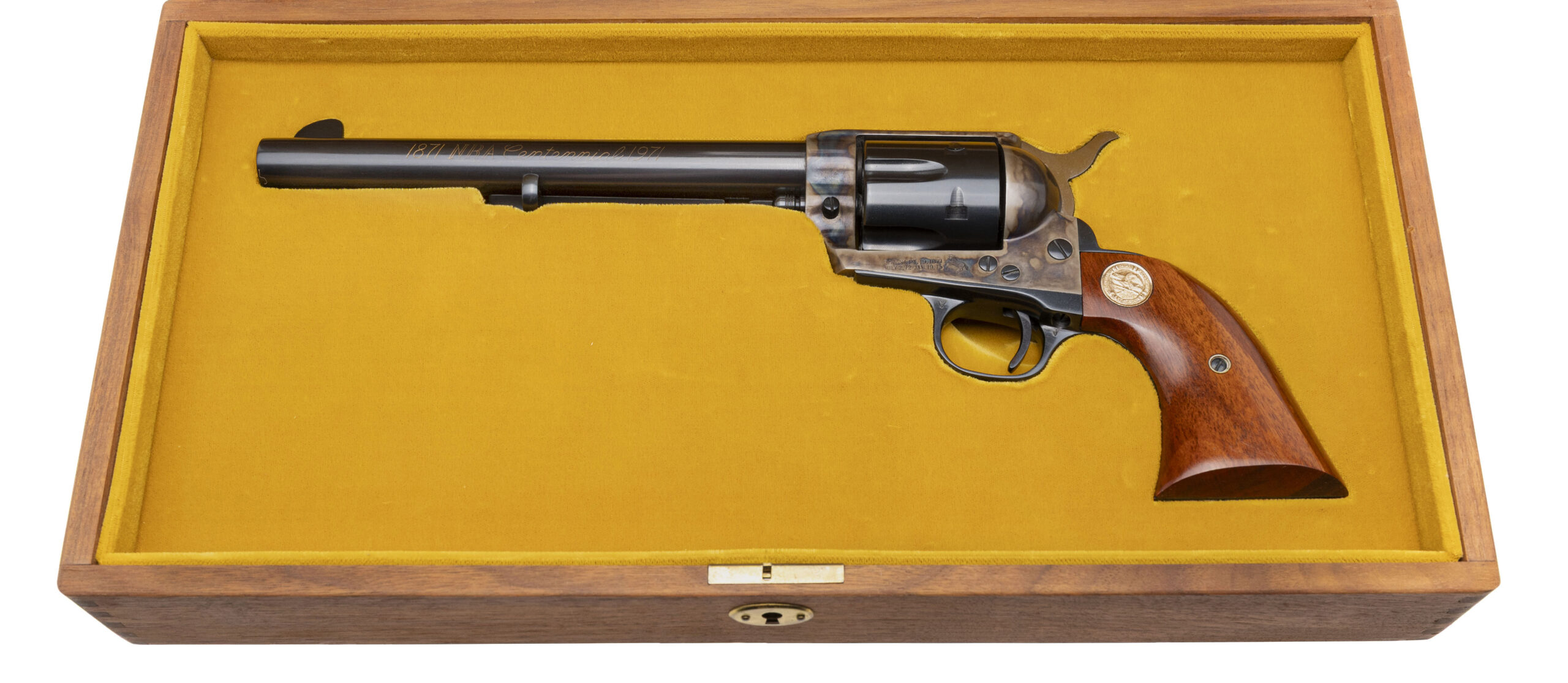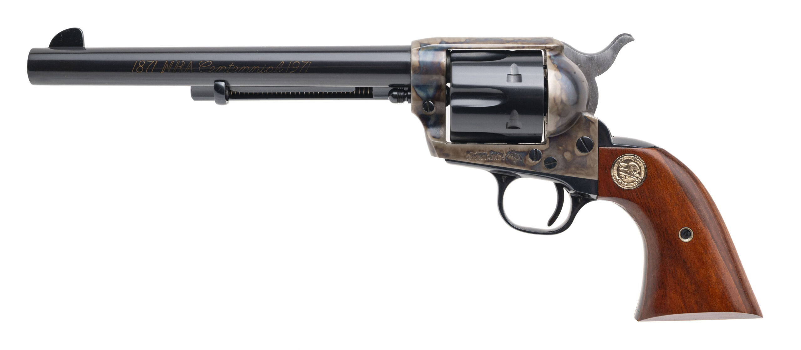 SN: NRA145. 1971 production, .45 Colt with a 7.5" barrel. NRA Commemorative 2nd Gen single action revolver with blue finish, color case hardened frame, and walnut grips w/medallion inlay. Excellent condition overall. Comes with presentation box and NRA collectible coin. These had a one year production run with only 7000 units being made, making this desirable for any commemorative gun collection.