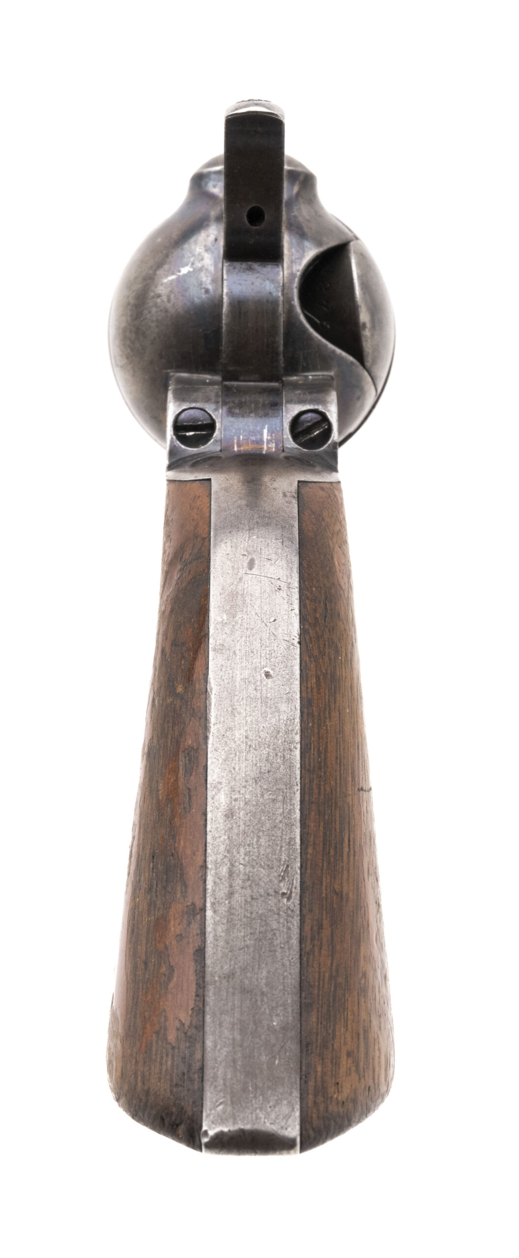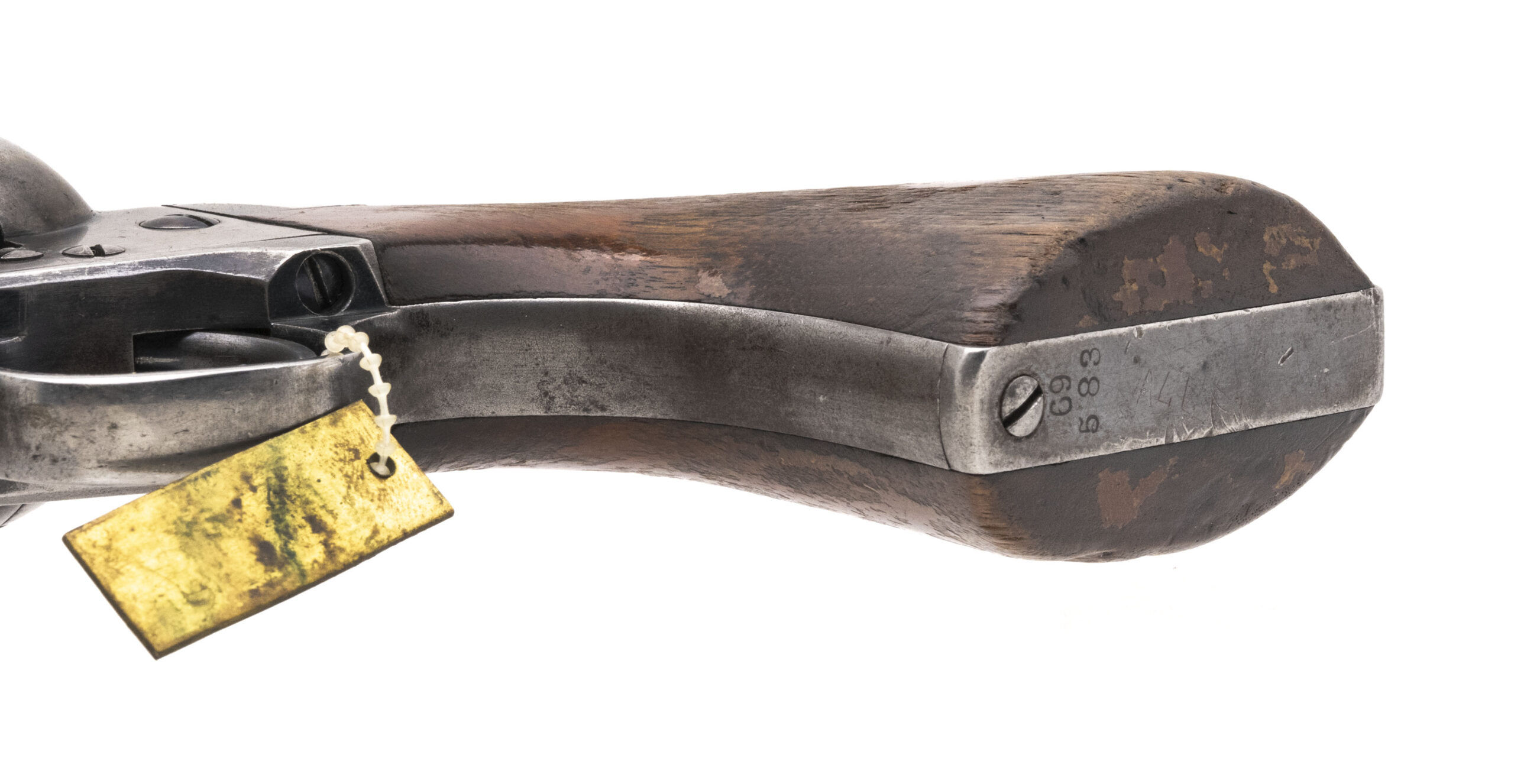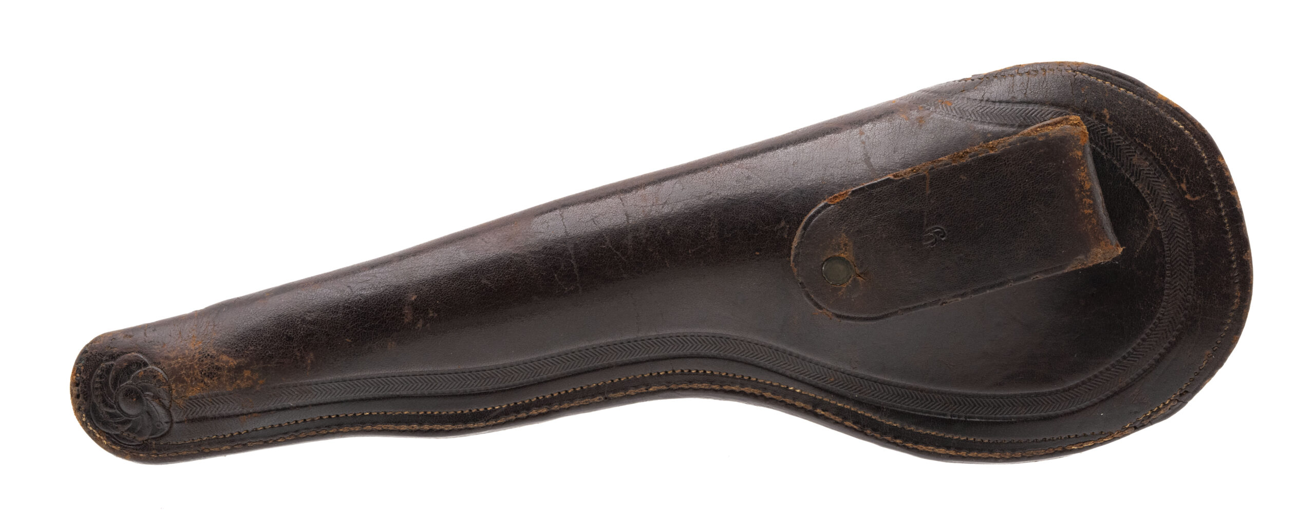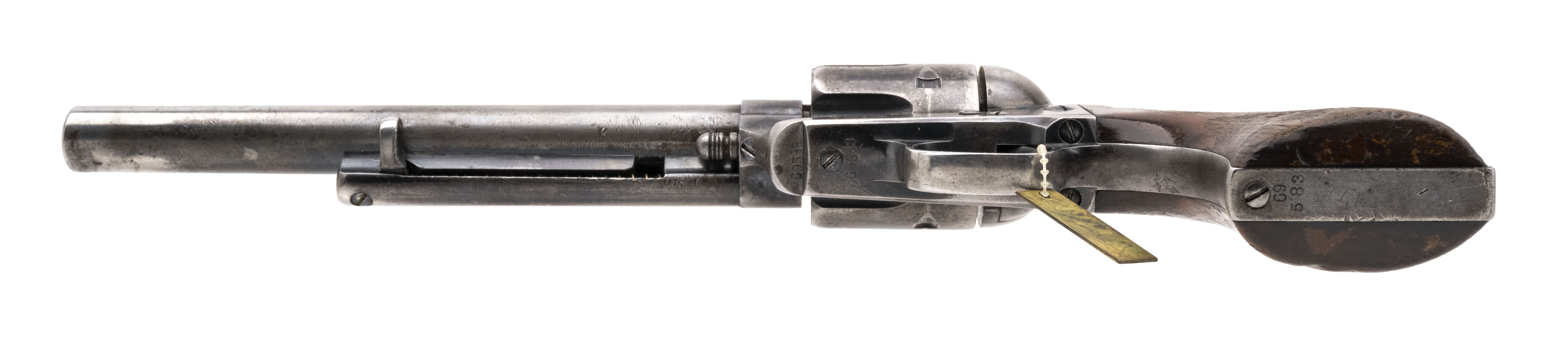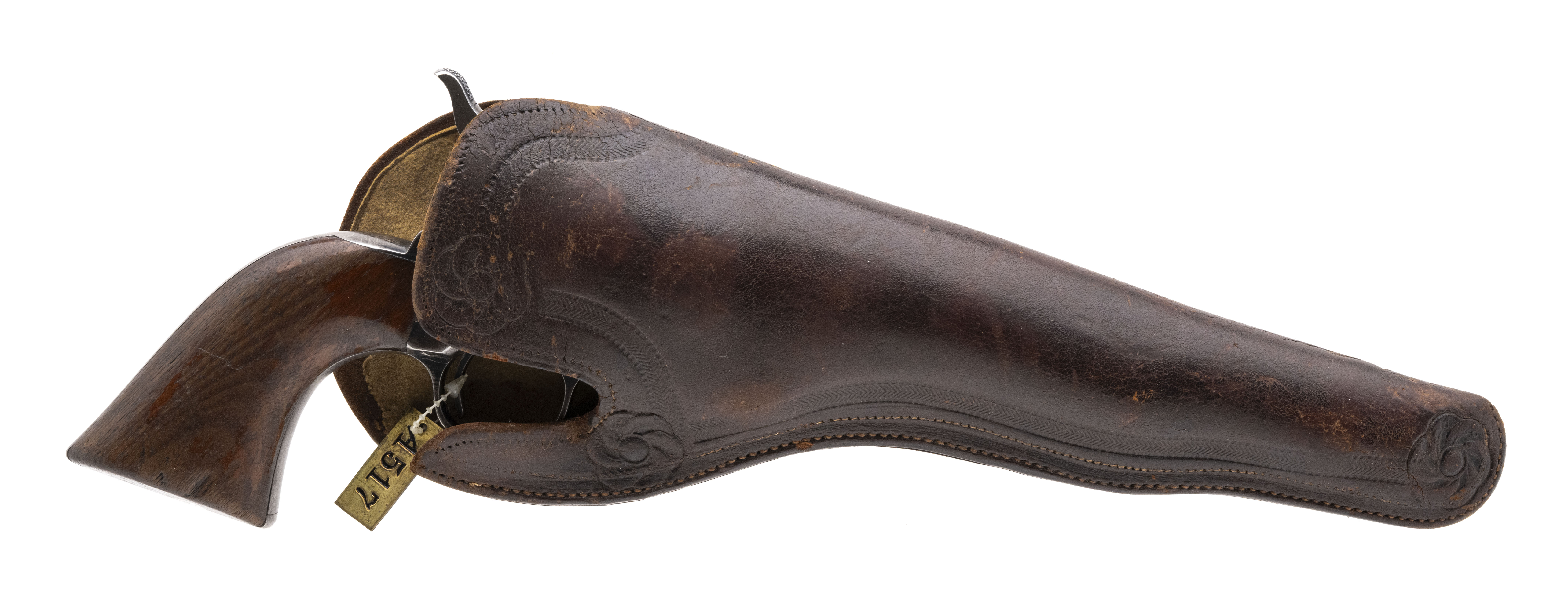 Serial No. 69583, made in 1881, .45 caliber, 7 ½” round barrel. Metal is mostly a smooth grey patina with scattered blue present in protected areas. Factory markings on barrel and frame are sharp, serial numbers are matching. Trigger guard is stamped with upside down caliber marking. Grips have a tight fit with traces of varnish present. Action indexes correctly with a tight lock up. Gun comes with brown leather slim Jim holster marked “6” on the belt loop. Consignment