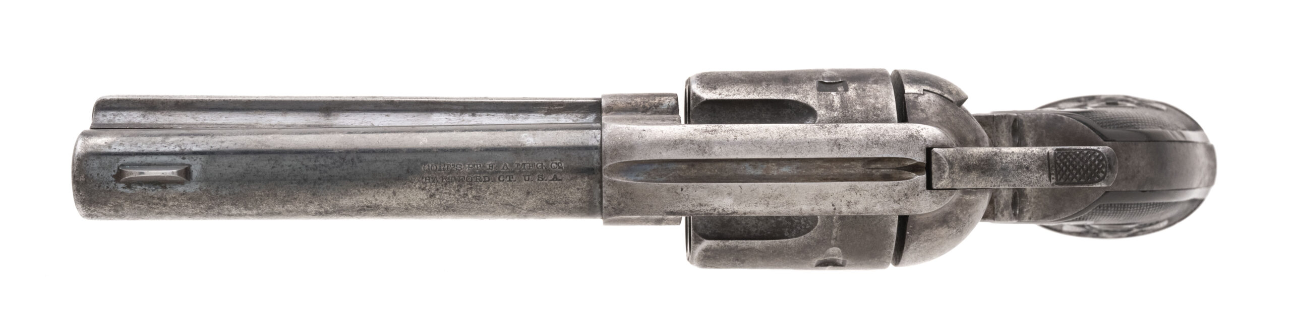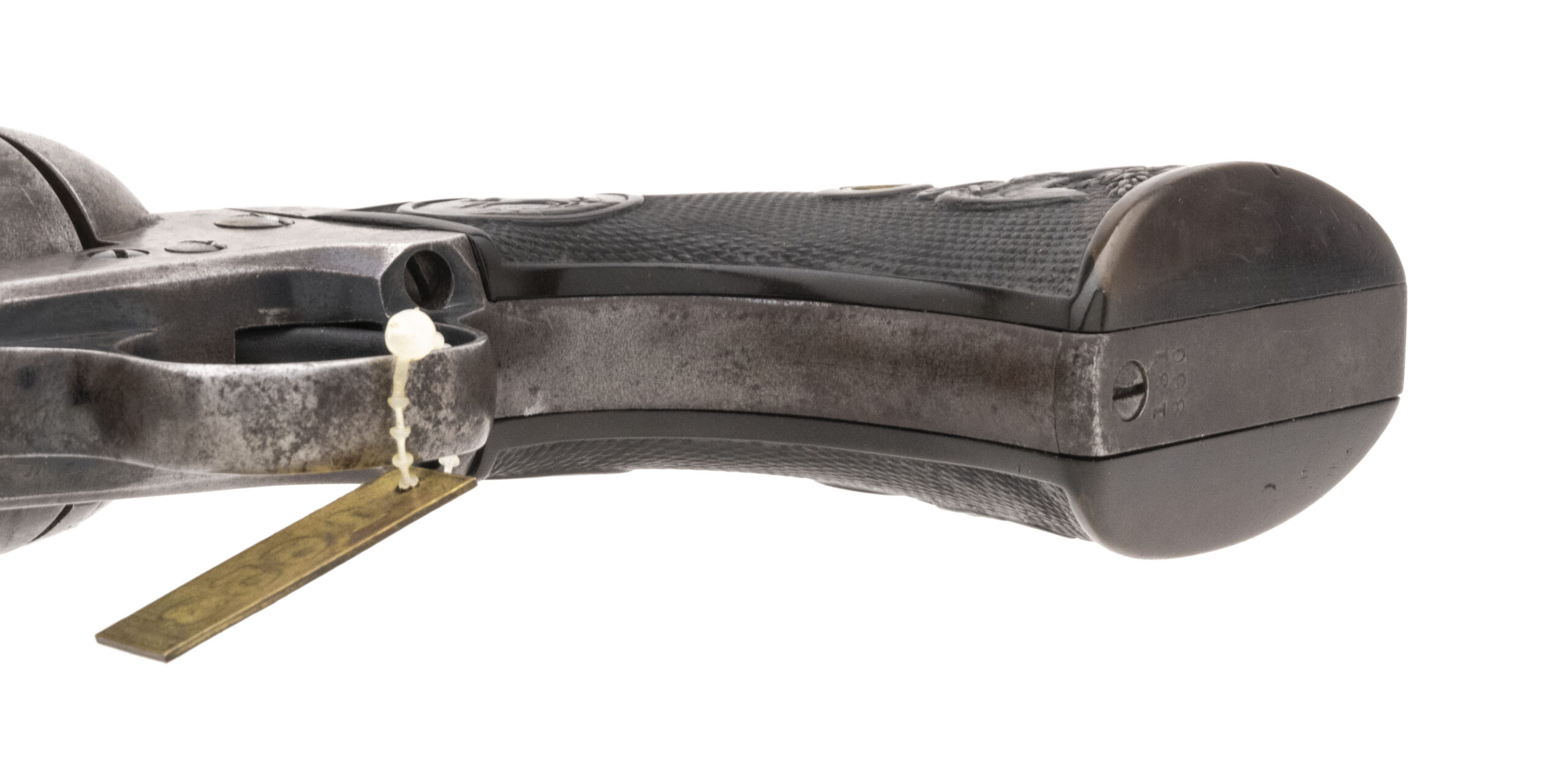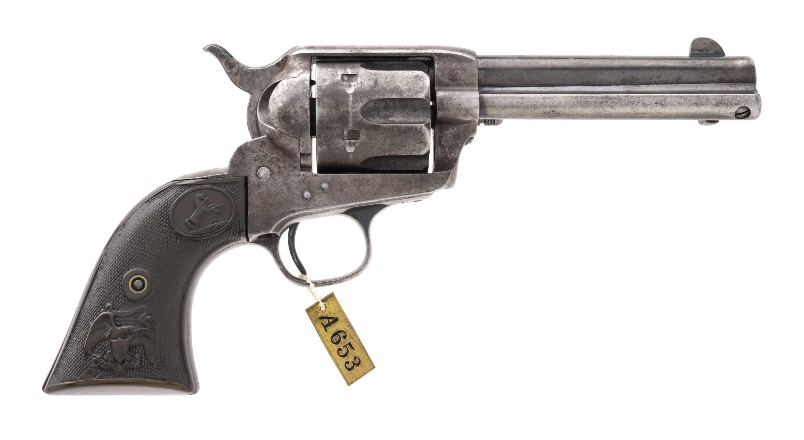 Serial No. 131860, made in 1890, .45 Colt, 4 ¾” round barrel. 45-50% original blue remains on barrel and ejector housing. Rest of the gun is a smooth grey patina with traces of original blue visible in protected areas. Eagle motif checkered grips are in very good condition with light handling wear noted, mostly on right side. Action indexes correctly with a tight lock up. Consignment