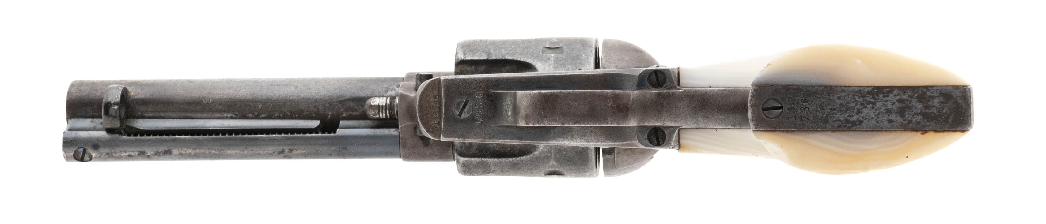 Serial number 196736. Made in 1900. 45 LC caliber with a 4 ¾” barrel. Nice sharp gun with traces of original blue on the metal. Action works perfectly. Gun has very nice thick pearls. Gun is all matching.
