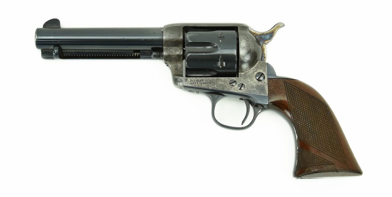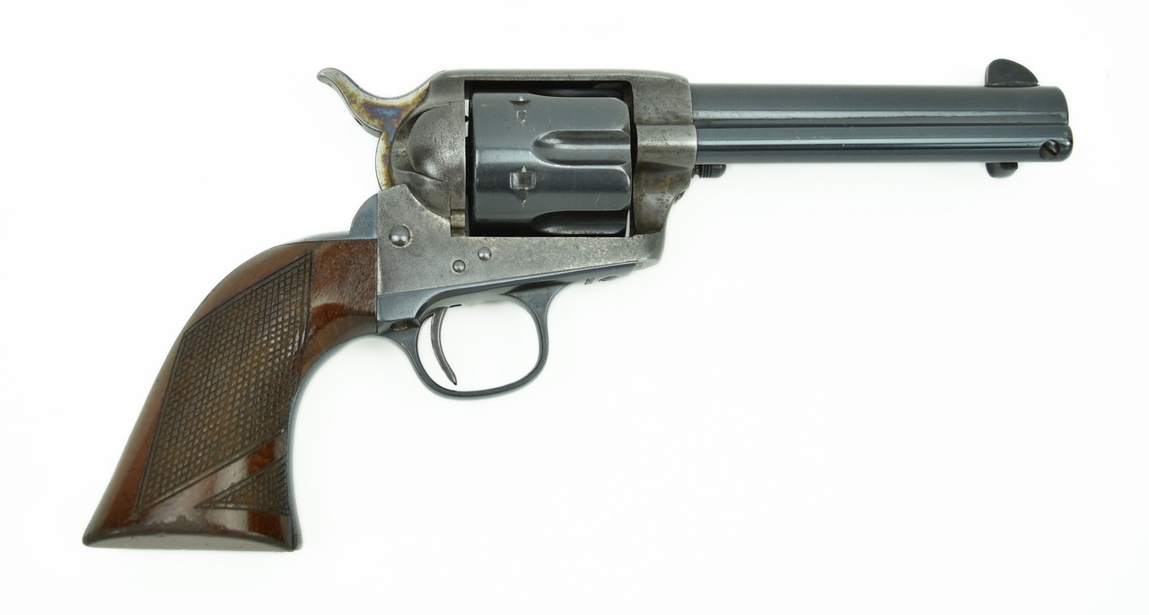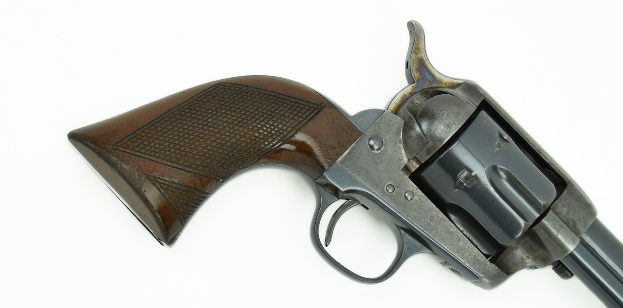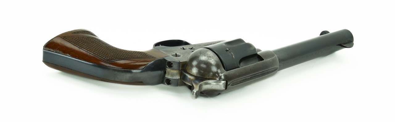 Colt Single Action Black Powder revolver. It was manufactured in approximately 1892. It has a .45 caliber barrel that is 4 ¾” in length. The gun has a good bore with strong rifling and frost in the grooves. The action works perfectly. The grips on the revolver are old and have good varnish and non-factory checkering. The gun has been refinished and it was done well. It has approximately 95% of the blue on it. This is a great looking 1892 Colt. Note: barrel is a 4 3/4" that has been shortened from 7 1/2".