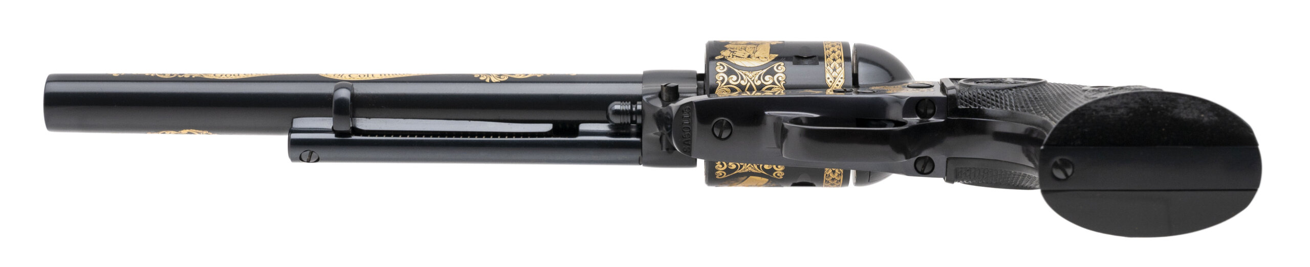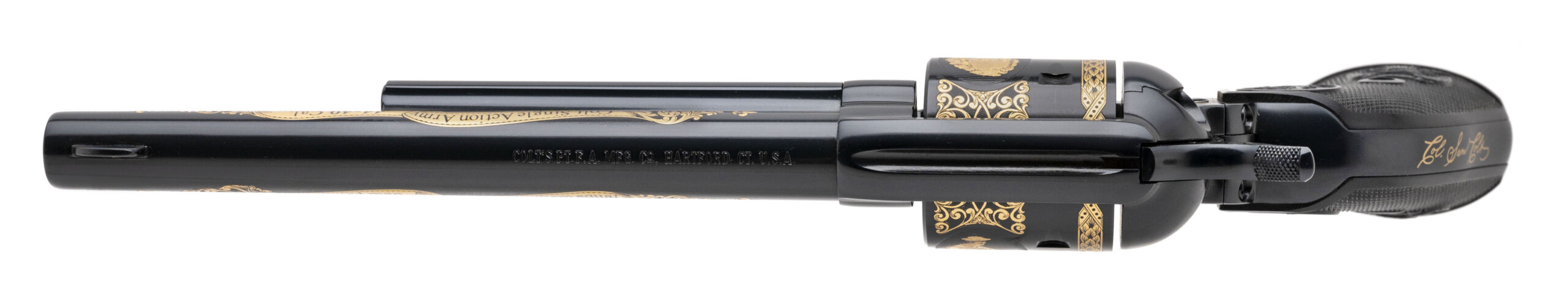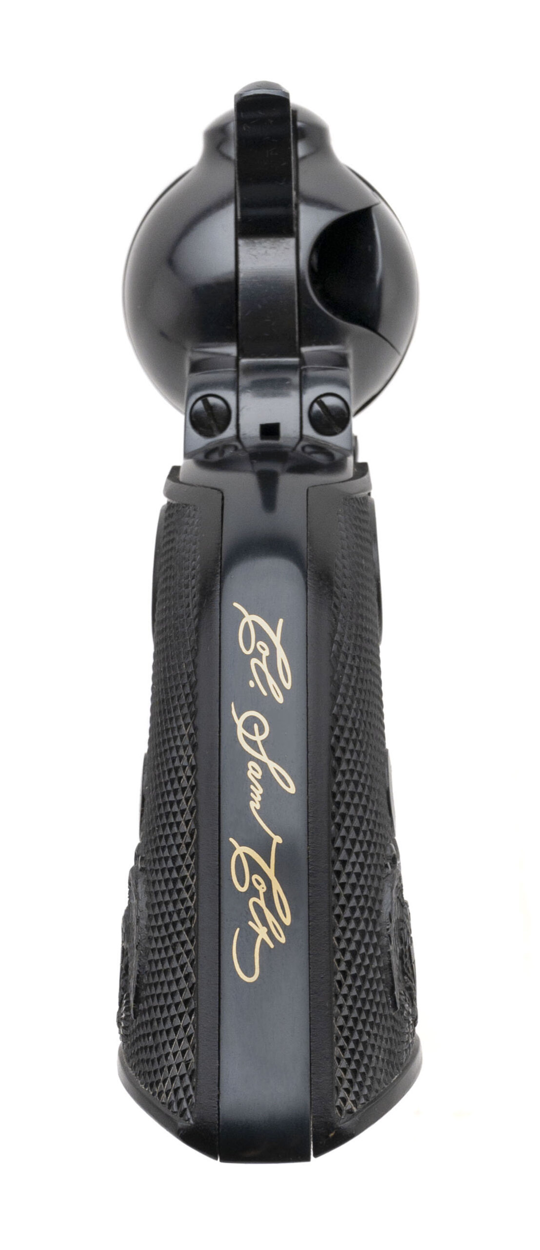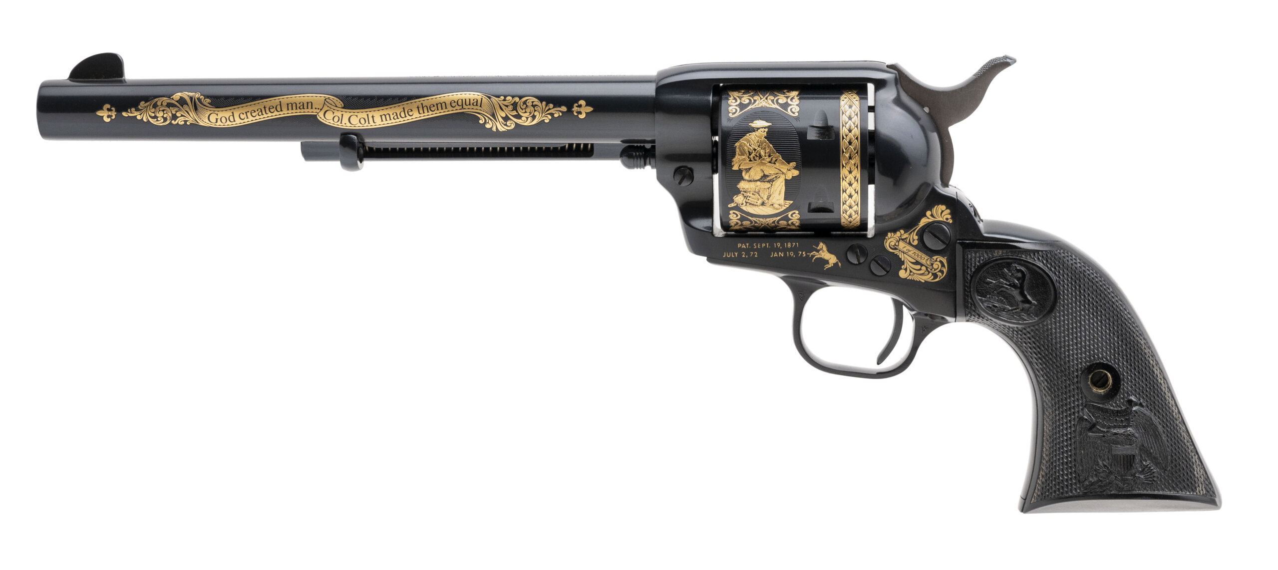 SN: SA50115. Made in 1981, .44-40 with a 7.5" barrel. Sam Colt commemorative Single Action, decorated with gold and marked "God created man, Col. Colt made them equal". Called the "Rusty Nail" commemorative because it includes a nail pulled from the original Colt Armory during a restoration. Comes in a wooden presentation case with extra undecorated cylinder.