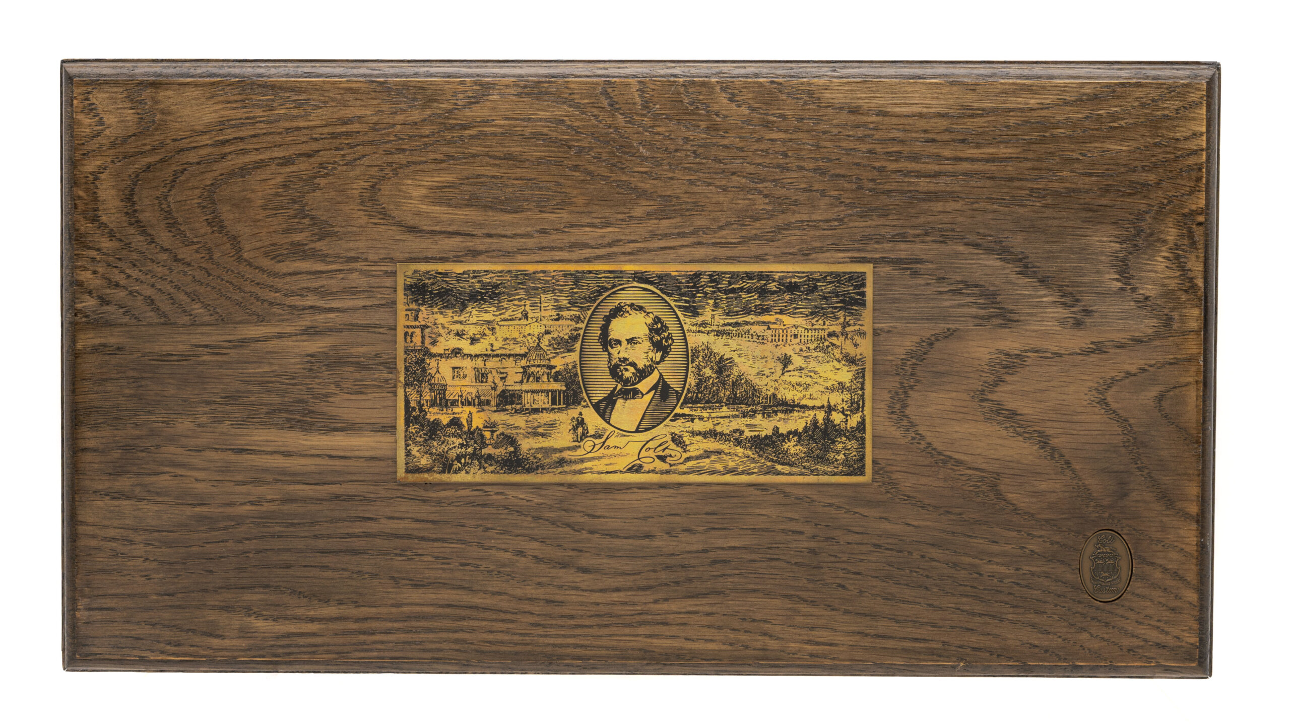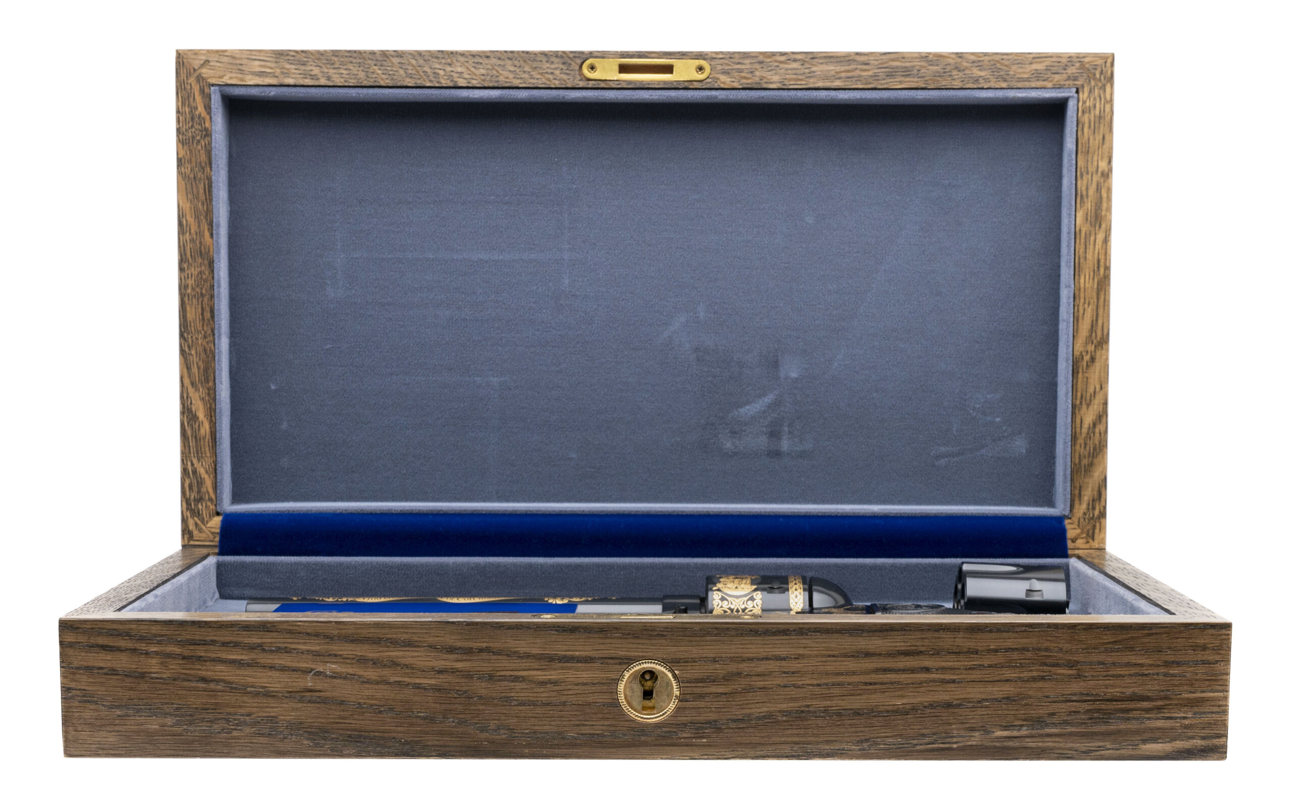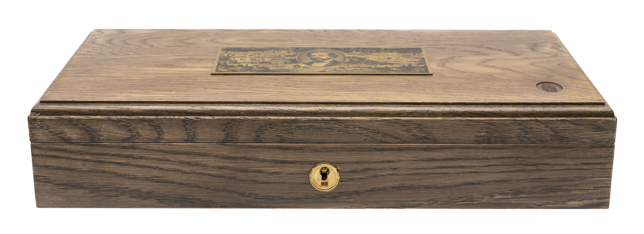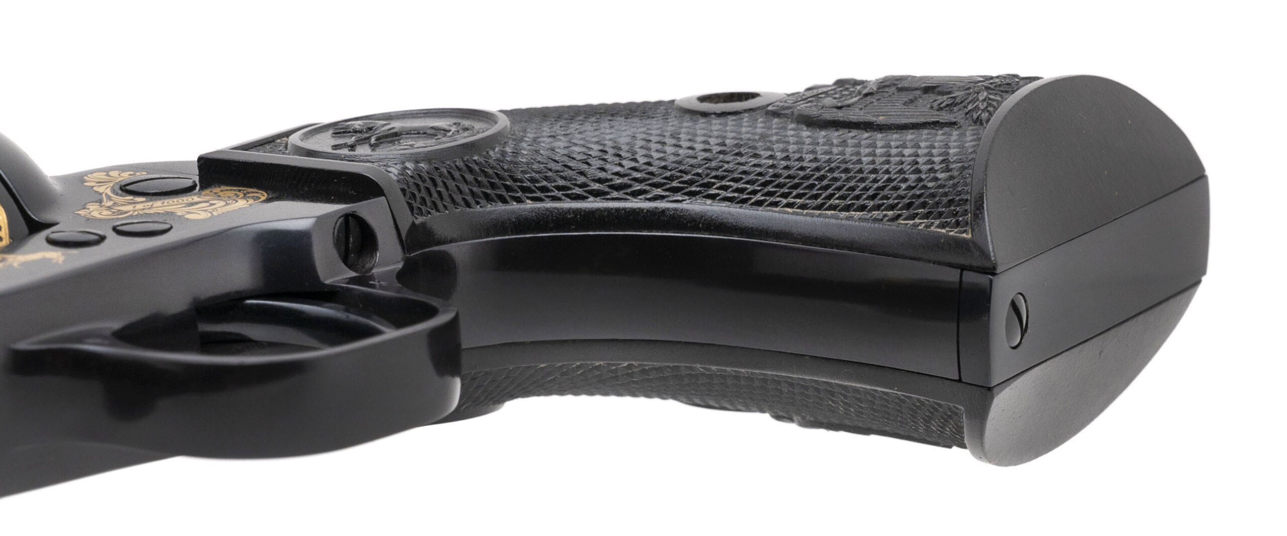 SN: SA50115. Made in 1981, .44-40 with a 7.5" barrel. Sam Colt commemorative Single Action, decorated with gold and marked "God created man, Col. Colt made them equal". Called the "Rusty Nail" commemorative because it includes a nail pulled from the original Colt Armory during a restoration. Comes in a wooden presentation case with extra undecorated cylinder.