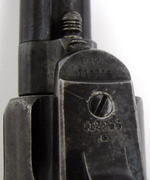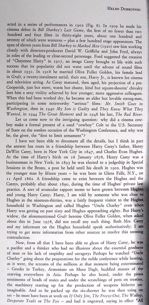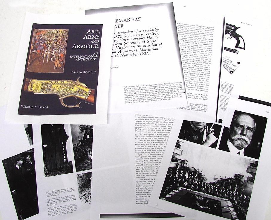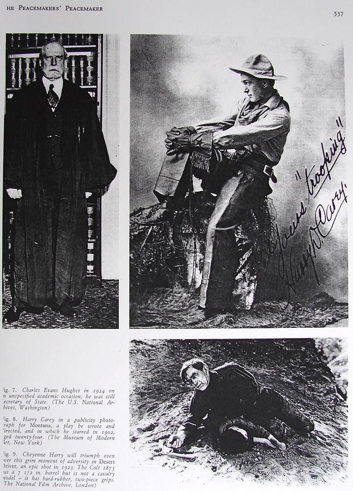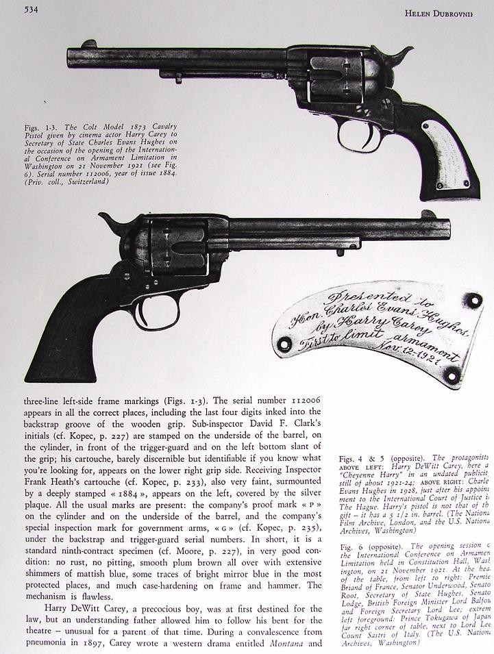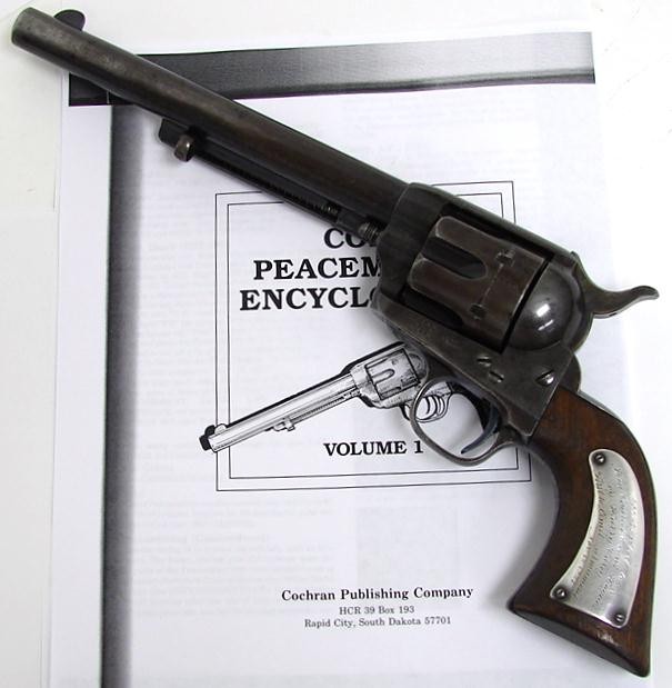Colt Single Action U.S. Cavalry revolver with 20-25% blue & traces of case colors (strong colors on hammer). Gun has presentation plaque from famous Old Western movie actor Harry Cary to U.S. Chief Justice of Supreme Court Honorable Charles Evans Hughes. Gun is detailed by serial number & presentation in Cochrans book Peacemaker Encyclopedia. Very fine U.S. gun with great presentation.