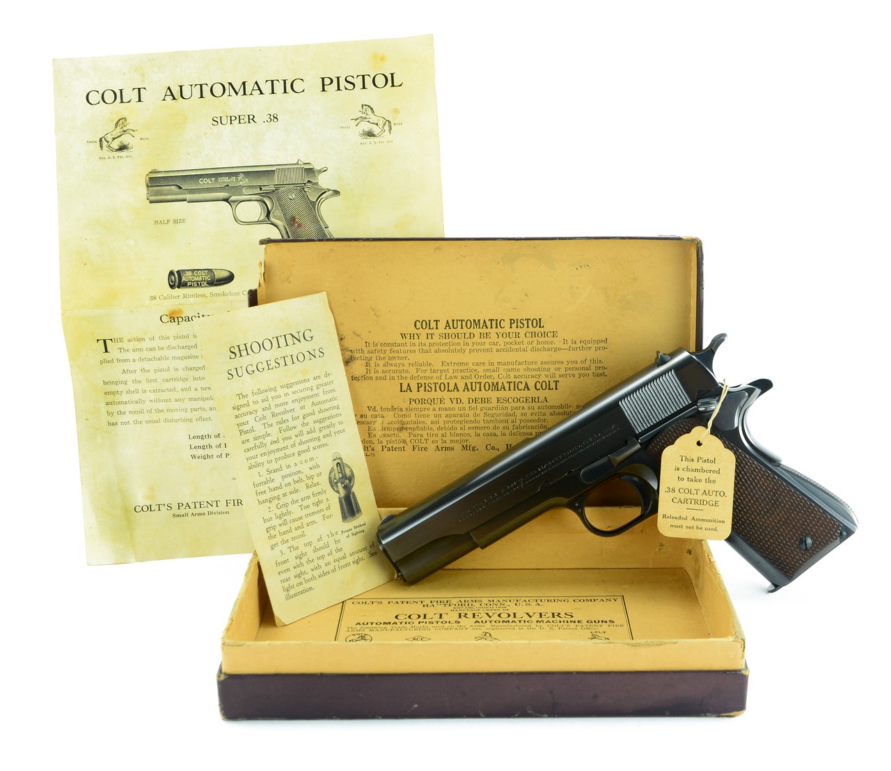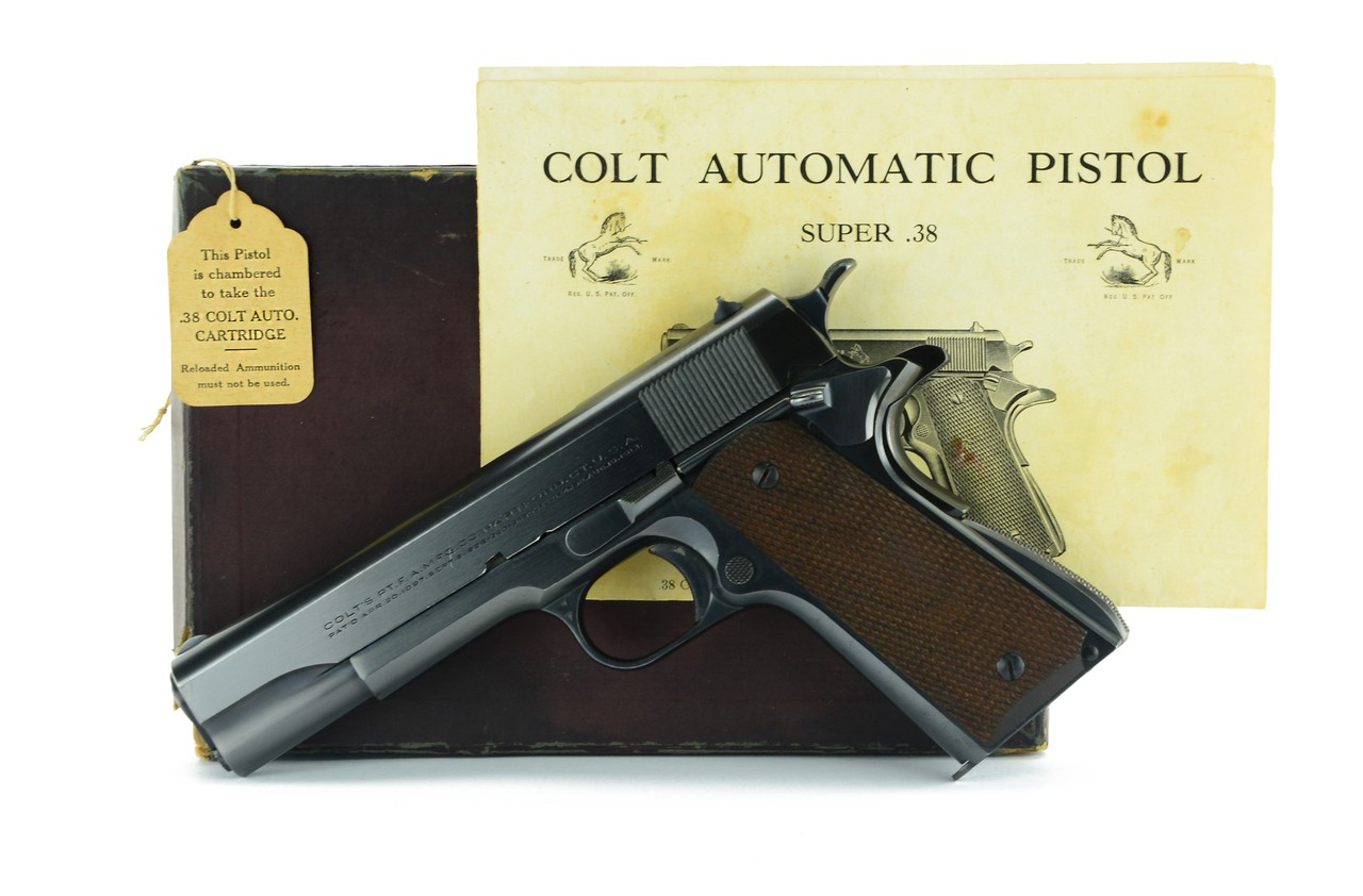 Colt Super 38 .38 super caliber pistol. Amazing Pre-War Super 38 made in 1934. The gun is in beautiful near mint 99% condition, with just the very lightest handling marks, and comes with the original box, papers and hang tag. An outstanding example that would be almost impossible to improve on.