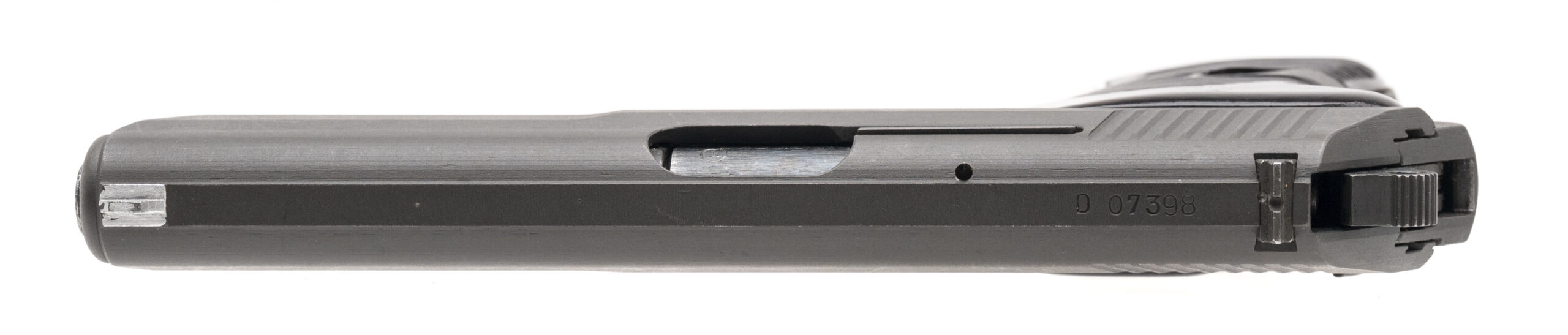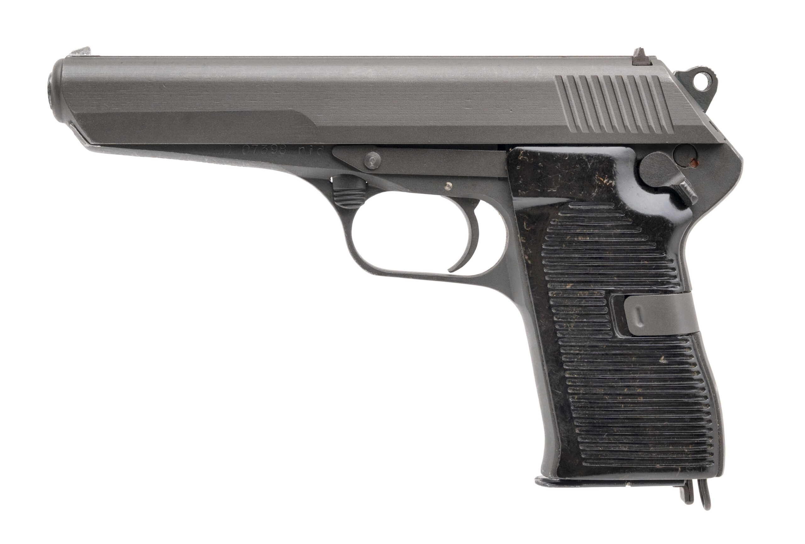 SN: D07398 made in 1954. Semi-auto Czech Republic military issued pistol chambered in 7.62x25 with a 5” barrel, parkerized finish, bakelite grips and original 8 round magazine. Overall in very good condition with only some very light wear and the bore is excellent.