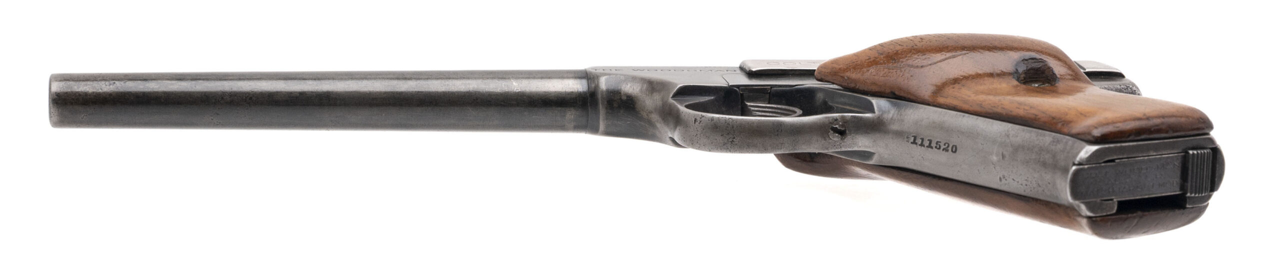 SN: 111520 made in 1937. 22lr semi-auto pistol with a 6.75" barrel, custom wood grips and original two-tone Colt magazine. Finish has worn and turned to an even patina, front sight is missing the blade insert, action is smooth, functions properly, bore is good with strong rifling.