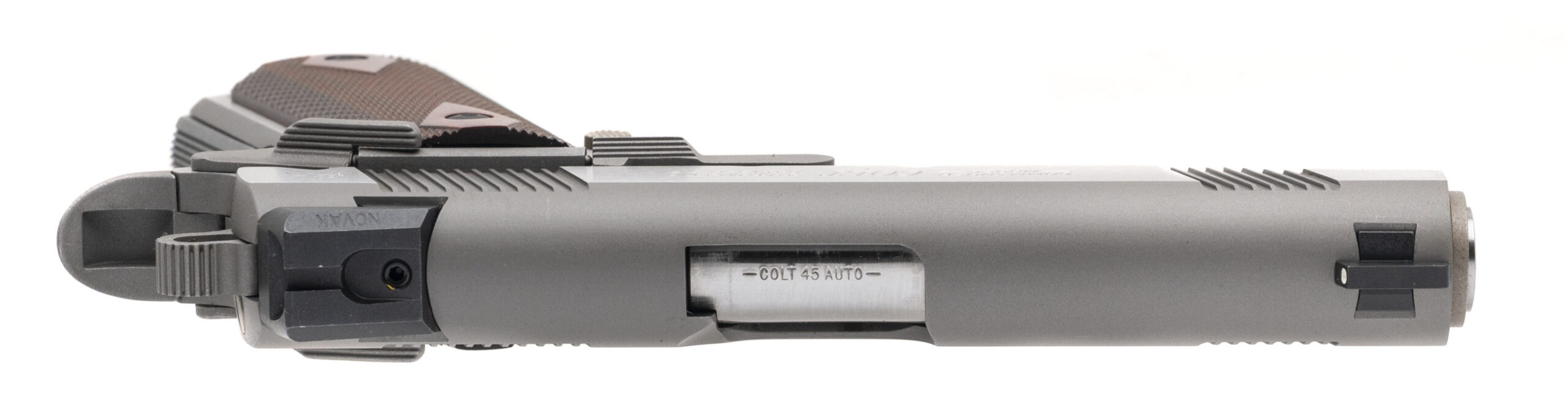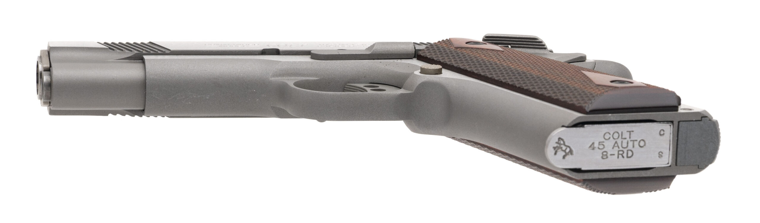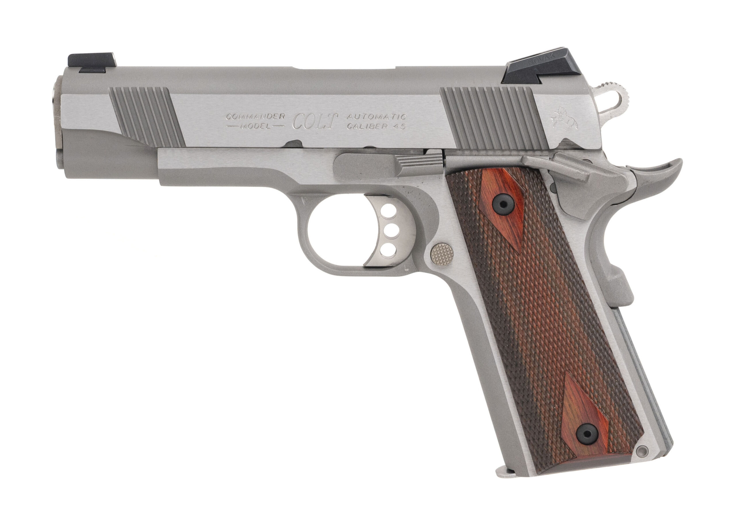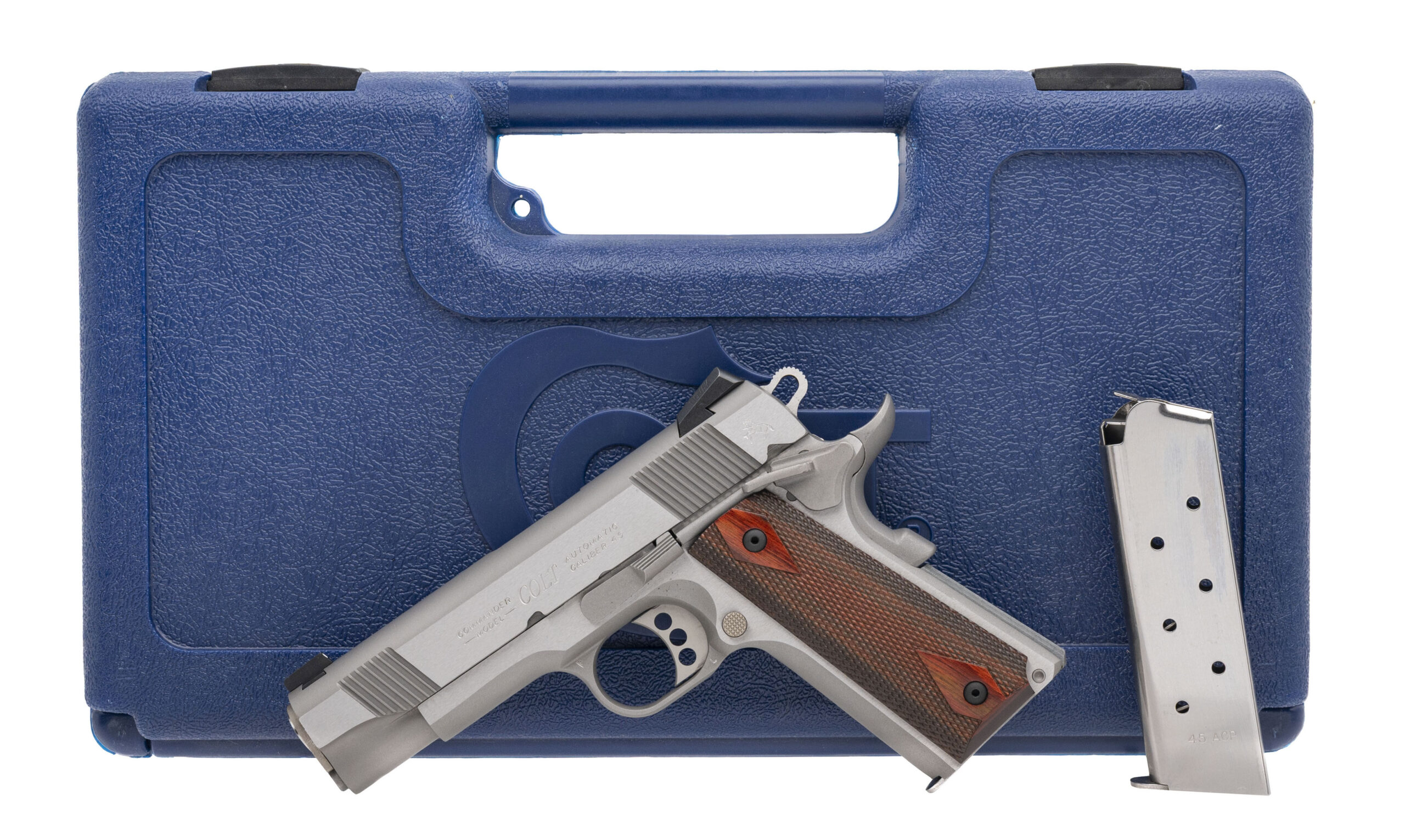 SN: FC36758E. Modern production, .45 ACP with a 4.25" barrel. Bore is excellent. Stainless steel frame commander size 1911 style pistol with 3 dot Novak sights, ambidextrous manual thumb-safety, and checkered rosewood grips. Metal shows light marks. Overall condition is very good. Includes an additional magazine, and original case.