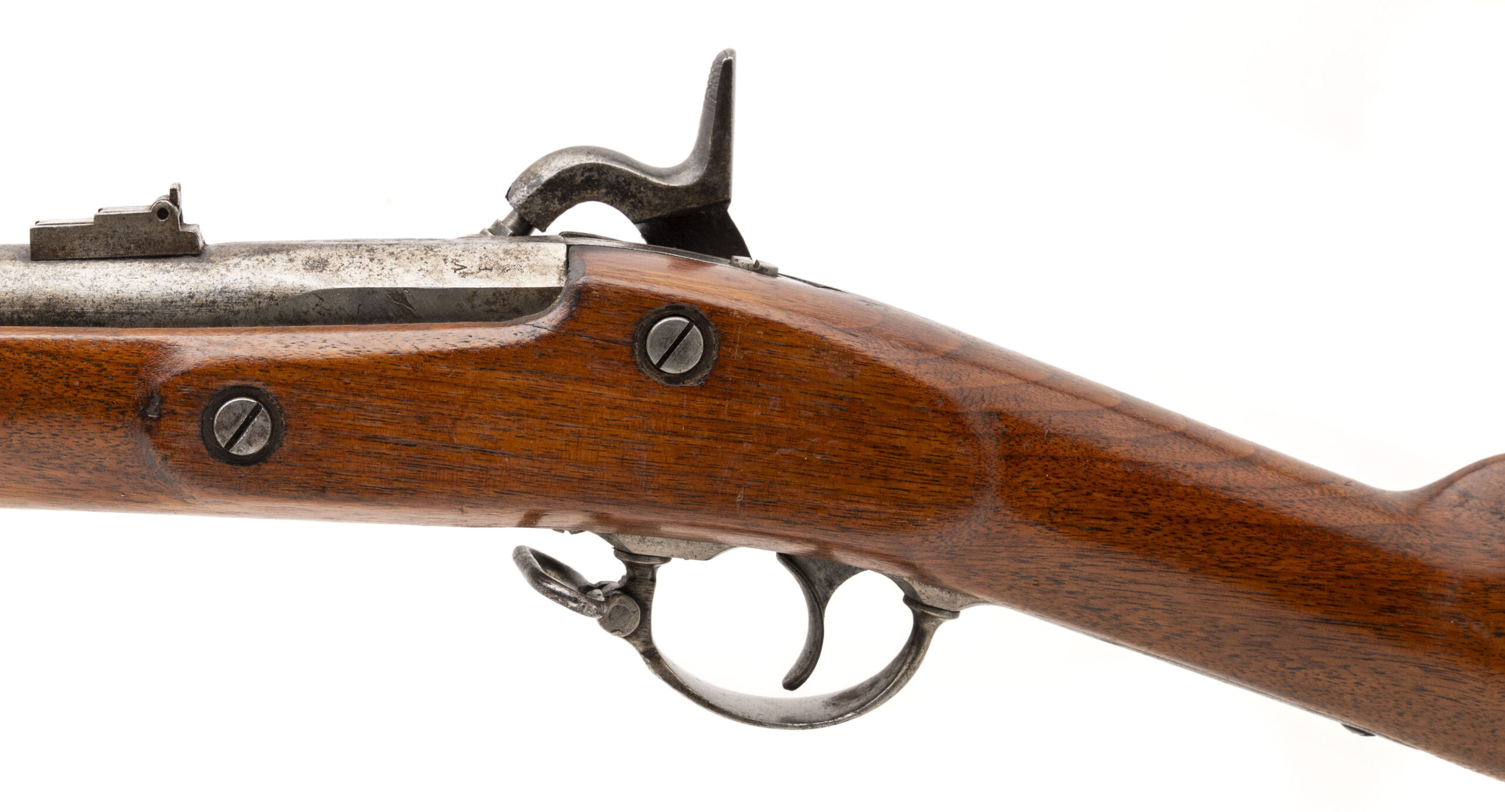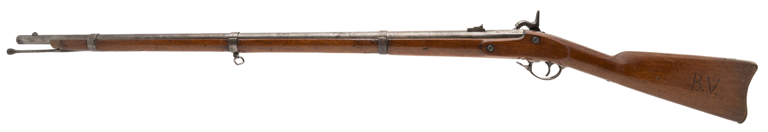 NSN, circa 1863, 58 caliber, 40” round proofed barrel. Bore shows traces of rifling. Barrel, barrel bands, lock and trigger guard are a grey patina. Barrel is marked with “V/P/Eagle” Lock plate is marked “1863” at the rear, forward of the hammer is marked “C.S./RICHMOND. VA.”. Stock has had a coat of varnish applied at some point. The initials “dpx” and “BV” are carved on the butt stock. Action holds at half and full cock.